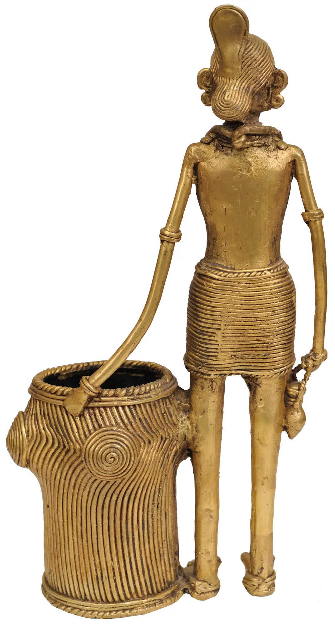 The choice of brass as the medium is significant. This enduring metal has been used for centuries in the creation of sacred objects, artistic representations, and functional tools across various cultures. Its ability to hold intricate detail and its resistance to corrosion make it an ideal material for preserving artistic visions for posterity. This particular statue showcases the distinct aesthetic of tribal art, characterized by its simplified yet powerfully expressive forms, its emphasis on line and pattern, and its deep connection to the natural world and ancestral beliefs. The rhythmic lines adorning the basket are not merely decorative; they may symbolize flowing water, abundant harvests, or the very cycles of life itself, mirroring patterns found in nature and in the stories passed down through oral traditions. This piece is more than just an object; it is a conduit to a living history, a tangible link to the wisdom and artistry of indigenous peoples.