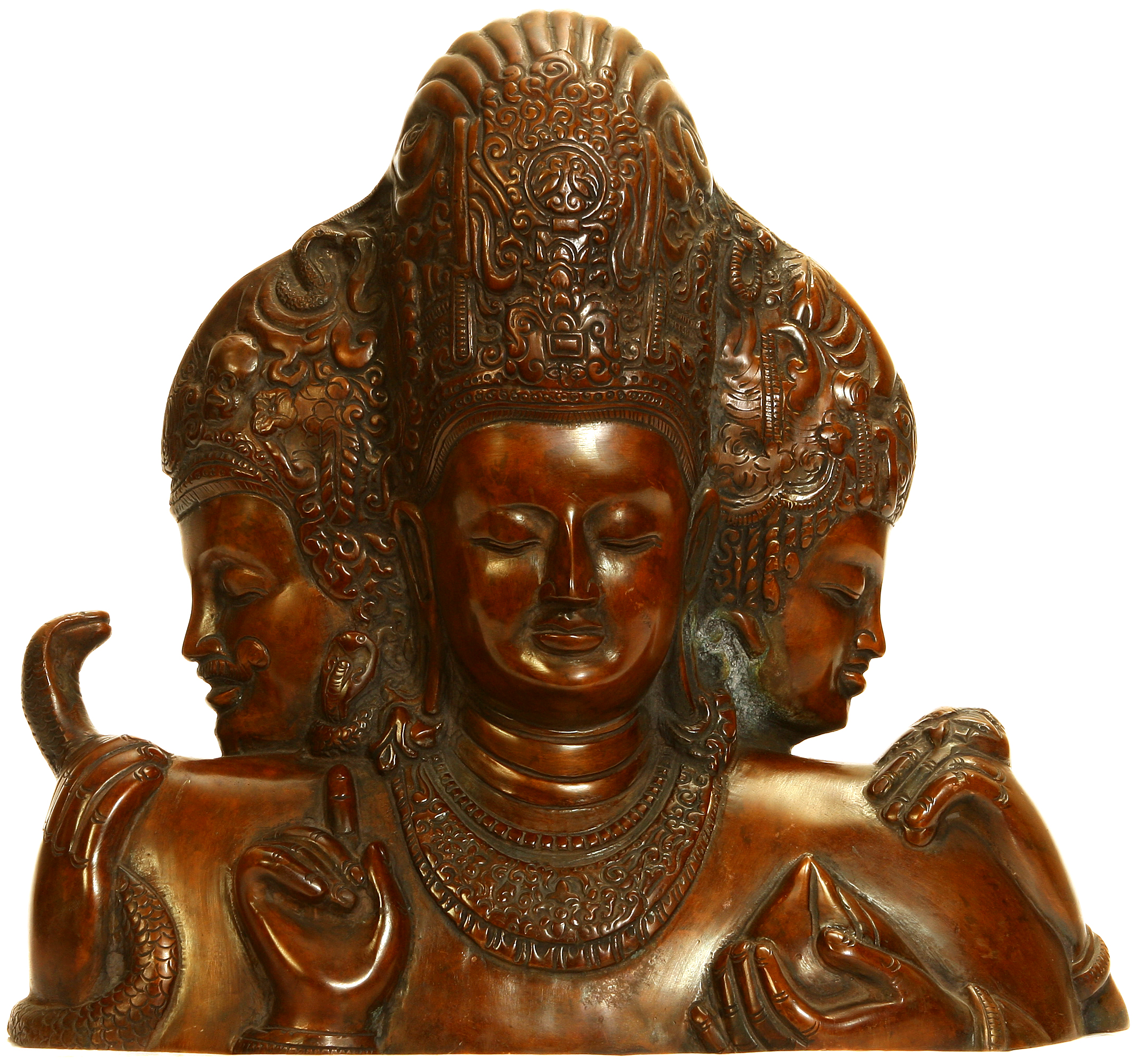 The artist has achieved a calm and inward-looking expression expression on the faces of the three deities.