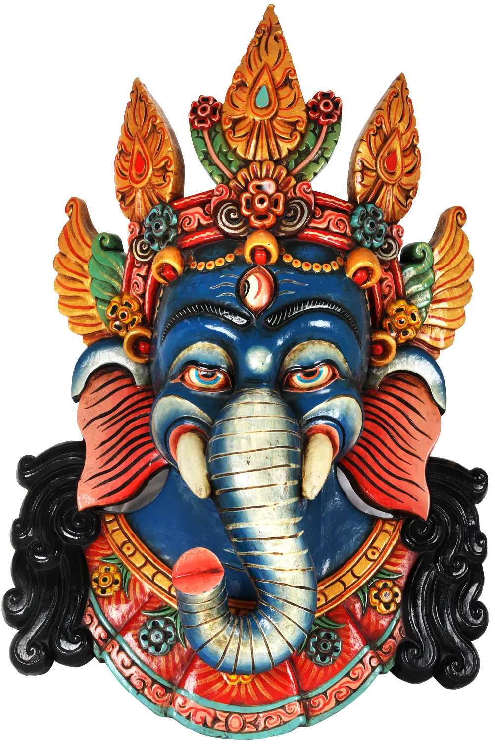 This particular depiction of Ganesha is distinguished by his "Trinetra," or third eye, prominently positioned on his forehead. In Hindu iconography, the third eye signifies supreme consciousness, inner vision, and spiritual awakening. It represents Ganesha's omniscience and his ability to perceive beyond the ordinary. The piercing gaze from his multiple eyes conveys a sense of profound watchfulness and benevolent protection. The mask is adorned with a majestic crown, richly decorated with symbolic motifs and vibrant hues of gold, red, green, and turquoise. These elements are not merely ornamental; they often represent elements of nature, celestial bodies, or auspicious symbols, further enhancing the divine aura of the deity. The elaborate carving around the face, including the tusks and ornate ears, speaks to the artisan's skill and dedication in bringing this sacred form to life.