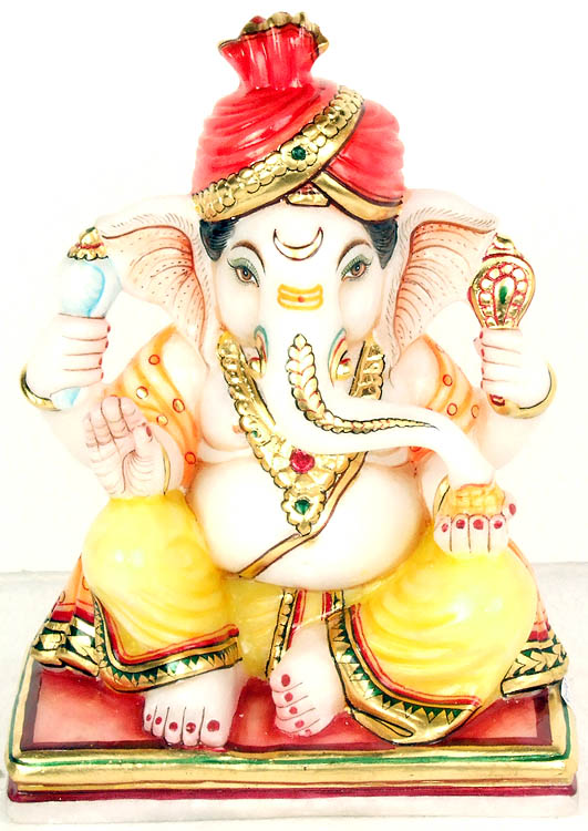 This beautiful white marble sculpture presents Ganesha in a unique and dignified form. He is seated comfortably, his plump form exuding prosperity and contentment. What sets this depiction apart is the magnificent turban adorning his head. This elaborate headwear, often associated with royalty and honor, adds a touch of regal elegance to the already revered deity. The vibrant colors of the turban, contrasted against the smooth white marble, create a visually striking and captivating image. The fine details etched into the marble showcase the craftsmanship and artistry involved in creating this piece. Notice the intricate patterns on the turban, the delicate features of Ganesha's face, and the gentle curve of his trunk. In his hands, he holds symbolic objects representing his various attributes. One hand is often depicted holding a modak, a sweet dumpling, representing the sweetness of realized goals and the rewards of spiritual pursuits. The other may hold an ankusa, a goad, symbolizing control and discipline, guiding devotees along the right path.