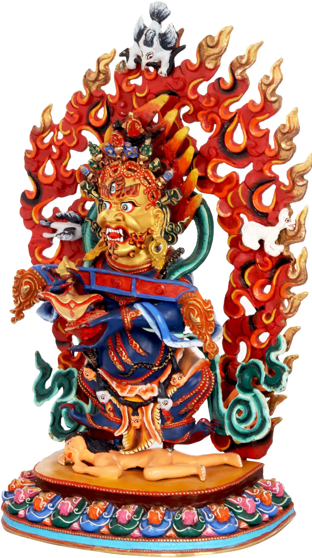 Mahakala- he who tramples Kala (death) under his feet, is a ferocious guardian deity in Vajrayana Buddhism, who is evoked by devotees to gain steadfastness and fearlessness in their quest for the supreme truth. In this copper statue from Nepal, the powers of Mahakala are delineated with the aid of brilliant hues that add a stunning dramatic appeal to the icon. Mahakala’s countenance is presented in a splendid golden tone, which is beautifully contrasted by the flaming aureole behind him. Awe-inspiring expressions on Mahakala’s face and the feeble enemy of Dhamma under his feet stills the heart of the devotee, with the powerful presence of the mighty protector.