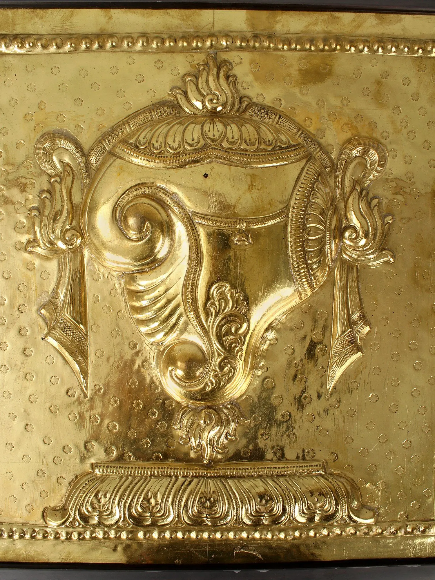 This collection of three repousse plates depicting the three lucky Vaishnava symbols is a religious symbolism-rich piece of art. In Hinduism, Lord Vishnu is identified with three symbols: the Urdhva Pundra (elevated mark), the Panchajanya (conch), and the Sudarshana Chakra (auspicious disc). He is represented with the Urdhva Pundra on his brow, the Panchajanya conch, and the Sudarshan Chakra, all representing celestial strength. It is a testament to the Sheet Metal Work legacy of Moradabad, Uttar Pradesh. The technique involves pounding the metal sheet against the pattern from behind and piercing the form with a sharp object. These sacred plates are utilized as decorations in temples and small worship places.