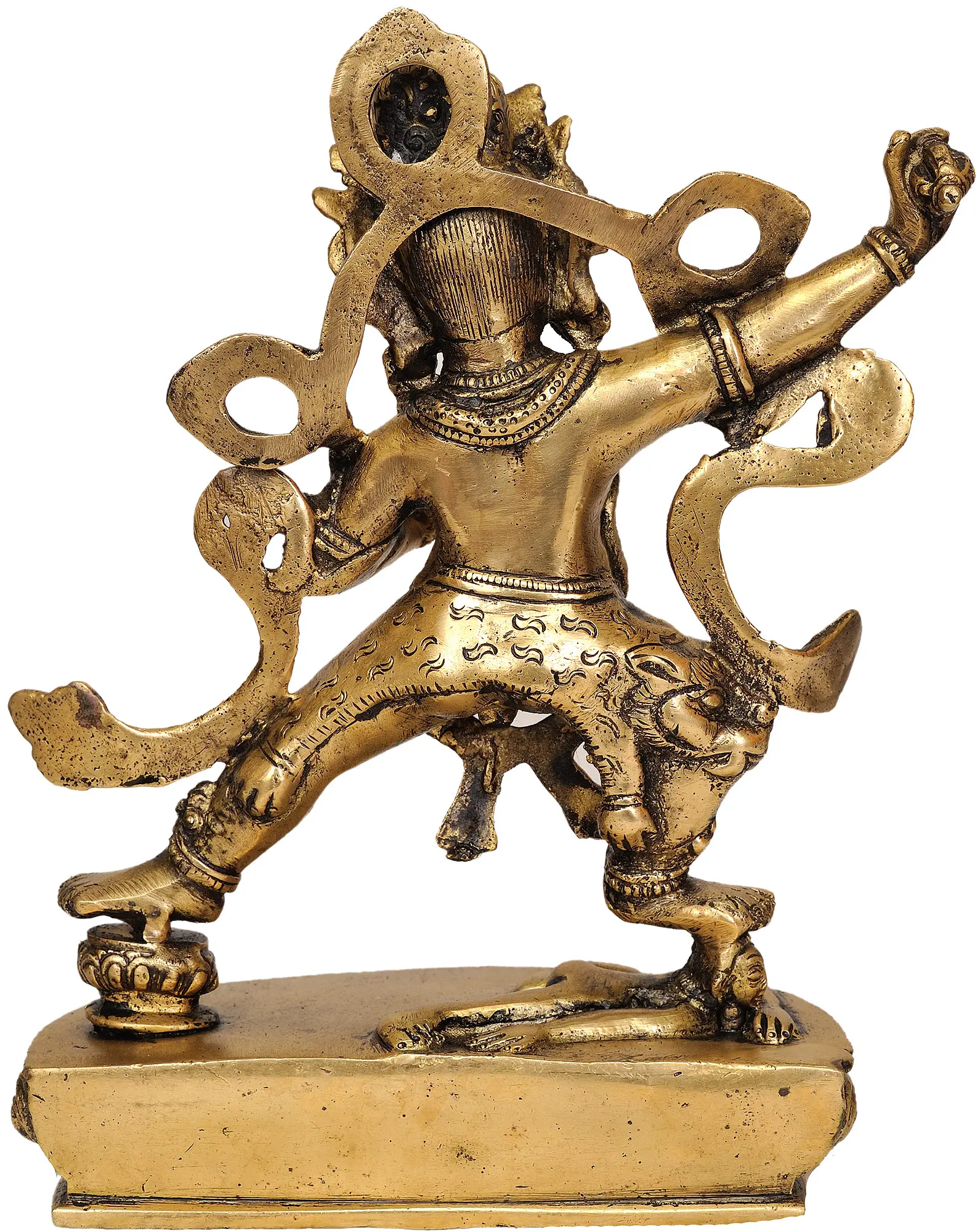 This exquisite brass statue captures the dynamic and powerful form of Vajrapani, a prominent deity in Tibetan Buddhism, revered as the embodiment of the power of all Buddhas. Vajrapani, whose name translates to "thunderbolt-in-hand," is a formidable protector, symbolizing the resolute energy that dispels ignorance, illusion, and negative forces. His fierce countenance, with a stern gaze and a slightly bared-tooth smile, conveys an unwavering determination to vanquish obstacles on the spiritual path. This artisanally crafted representation showcases Vajrapani in a vigorous stance, his body coiled with energy. His dynamic pose, with one leg forward and the other bent, suggests imminent action, ready to strike down any impediments to enlightenment. Adorned with intricate jewelry and flowing silks, the deity's form is rendered with remarkable detail, reflecting the skill and devotion of the craftspeople. The rich, lustrous patina of the brass lends a sense of timeless antiquity and sacredness to this piece, making it a focal point of spiritual devotion and aesthetic appreciation. ––––––––––