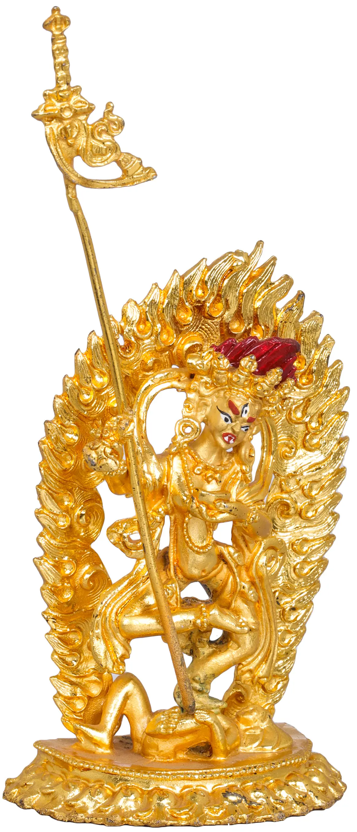 Dancing standing in the center of a halo of fire, representing the energies of enlightenment, is the potent Buddhist goddess Vajrayogini- the bestower of supreme wisdom. Delineated with a sense of animation, this copper statue from Nepal is a powerful device to meditate upon her and evoke the powers of Vajrayogini within.