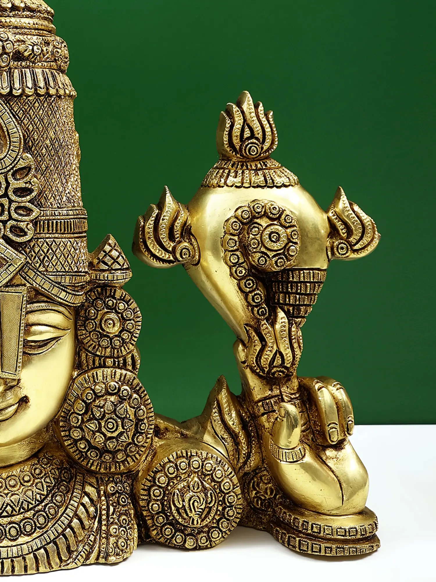 This exquisite wall hanging embodies Lord Venkateswara, also known as Balaji, as adored at the sacred Tirupati. The contrast of the lustrous golden embossing against the smooth black of the deity's features brings out the intricate detailing and craftsmanship. Balaji's face is serene, and his large eyes are a window to compassion, while the traditional headgear and ornaments reflect his divine status. The chakra (discus) and shankha (conch) are symbols of cosmic order and primordial sound. This wall hanging is not just a piece of decor, it's a celebration of Hindu mythology, perfect for those who seek to infuse their home with spiritual energy and a touch of Indian heritage.