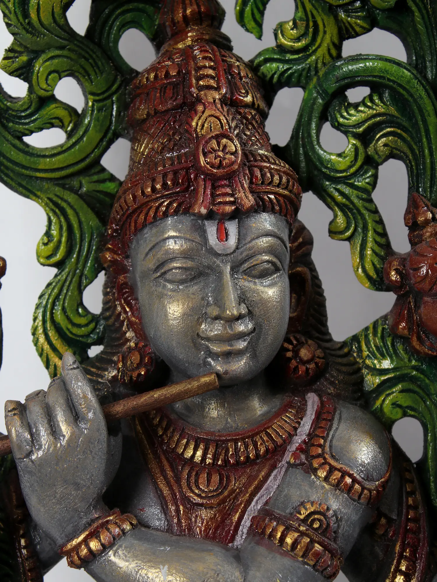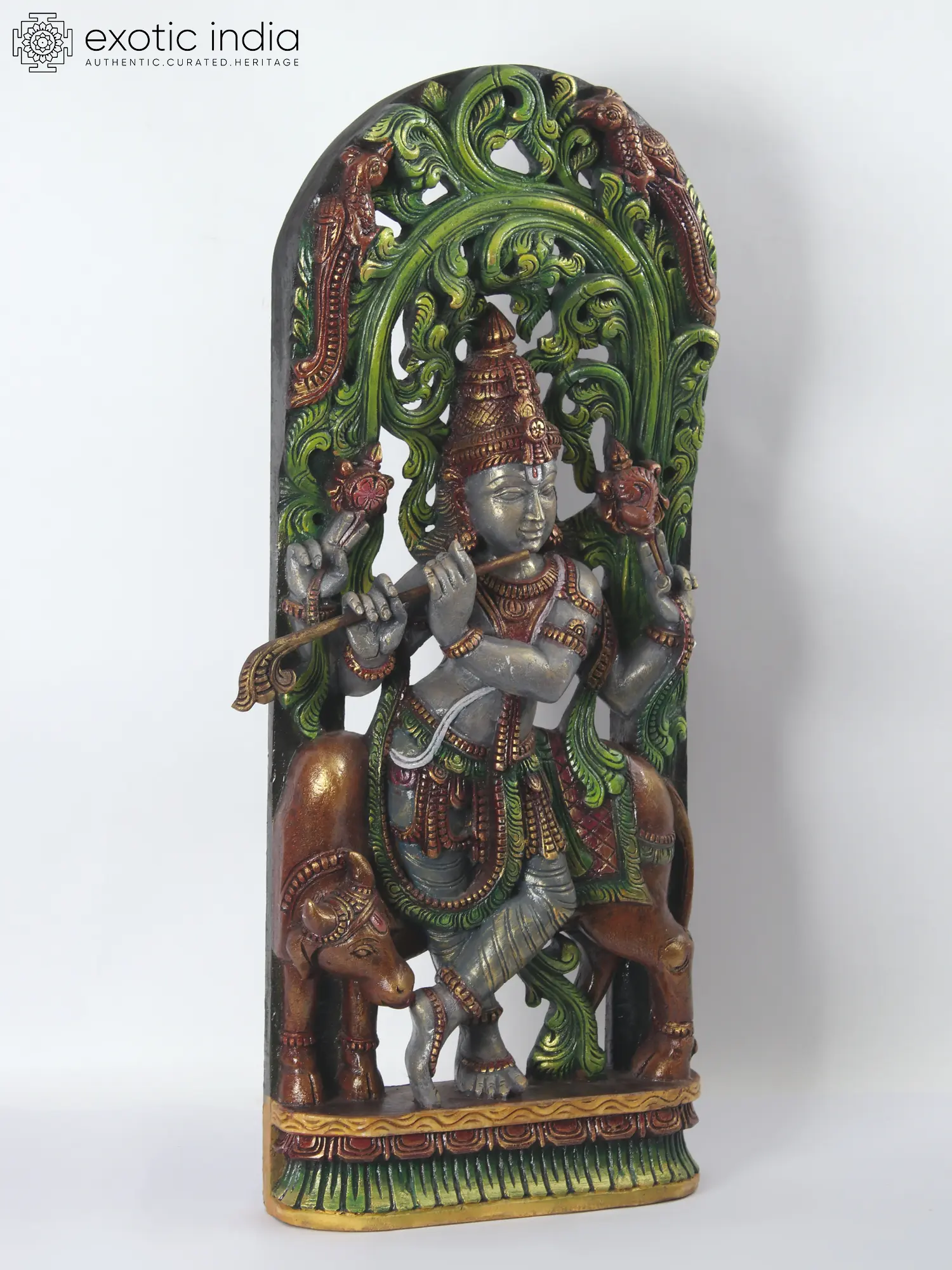 This statue is a stunning example of South Indian wood carving traditions, honed over centuries in the creation of temple deities and sacred art. Every detail, from the intricate folds of Krishna's garments to the delicate carvings adorning the arch, is a testament to the artisan's mastery. The vibrant colors further enhance the statue's beauty, bringing life to the wood and capturing the essence of Krishna's divine persona. The statue depicts Krishna standing upon a cow and calf, symbols of prosperity, abundance, and the sacredness of life. The ornate archway surrounding Krishna is filled with intricate vegetal motifs, a nod to the lush forests of Vrindavan, Krishna's playground and the site of many of his playful adventures. The arch is also adorned with two birds, that watch the Lord.
