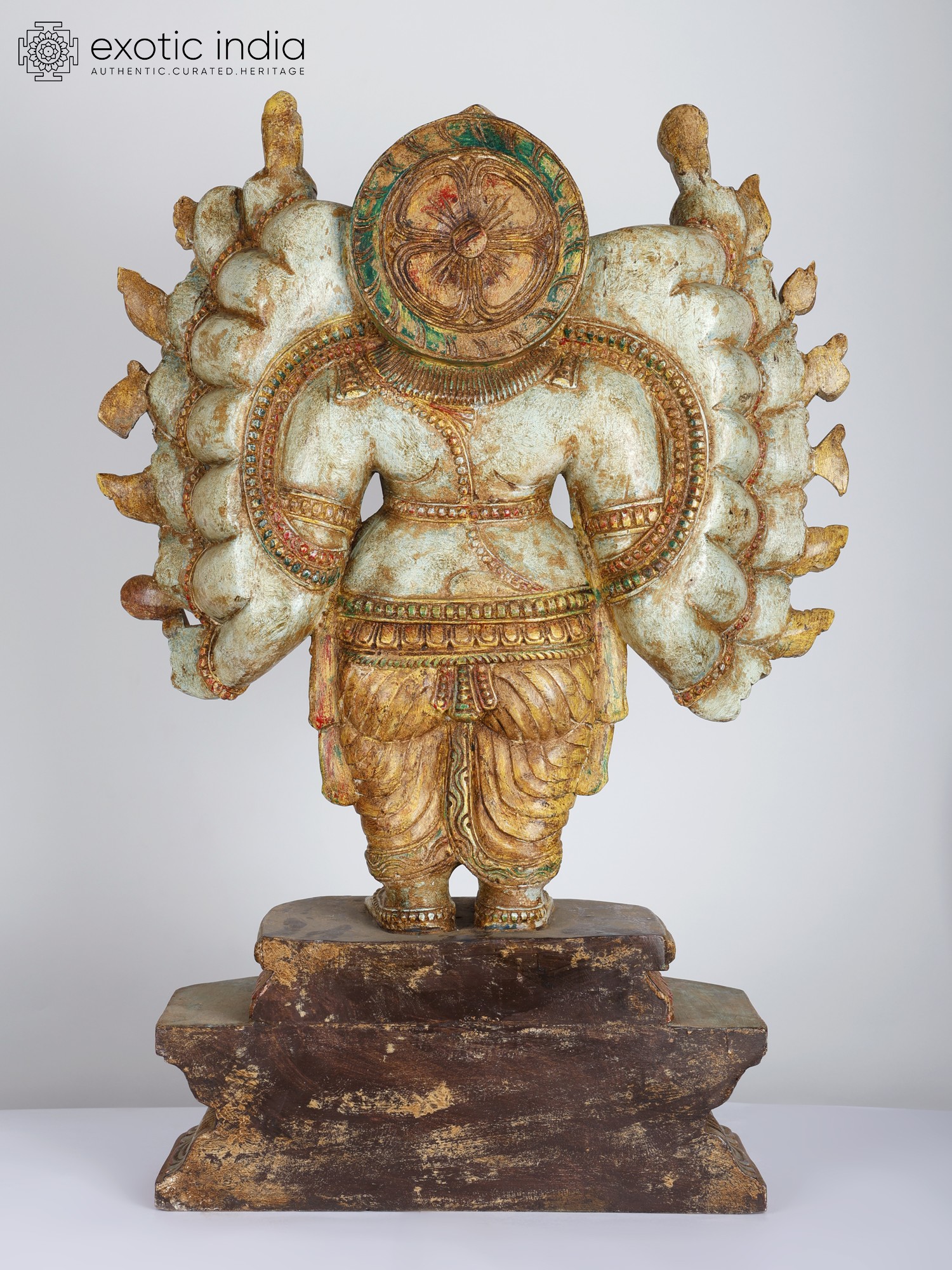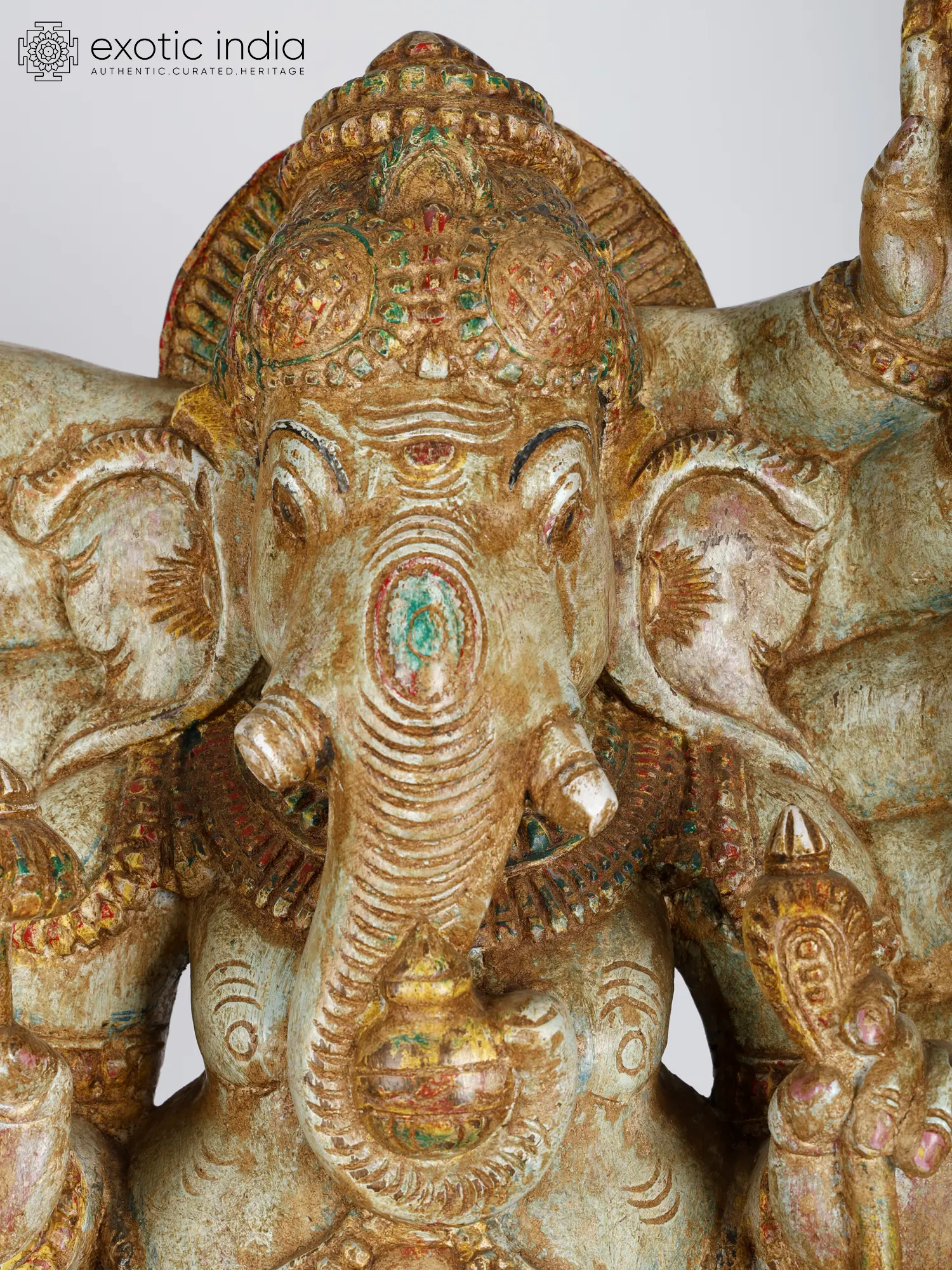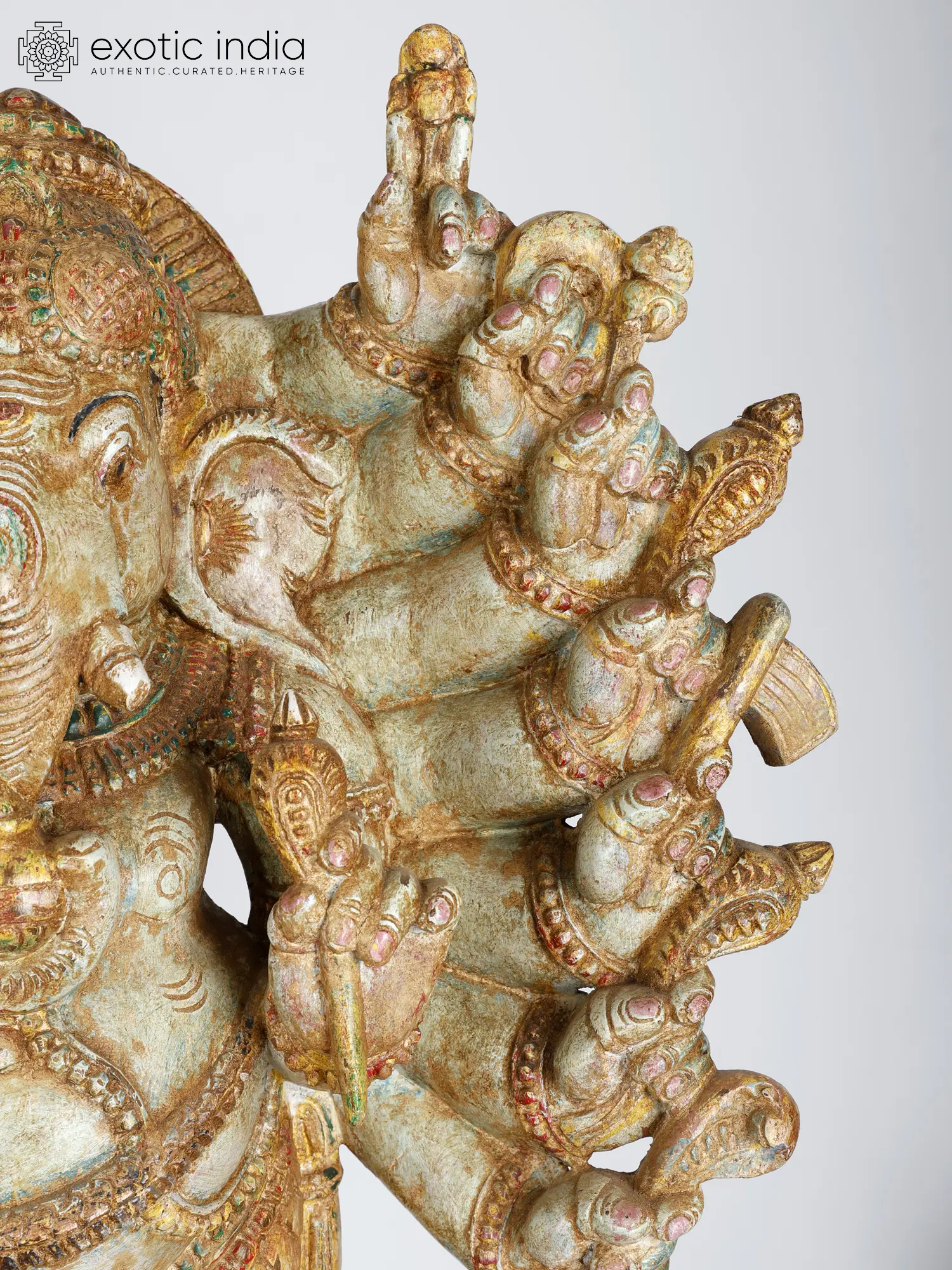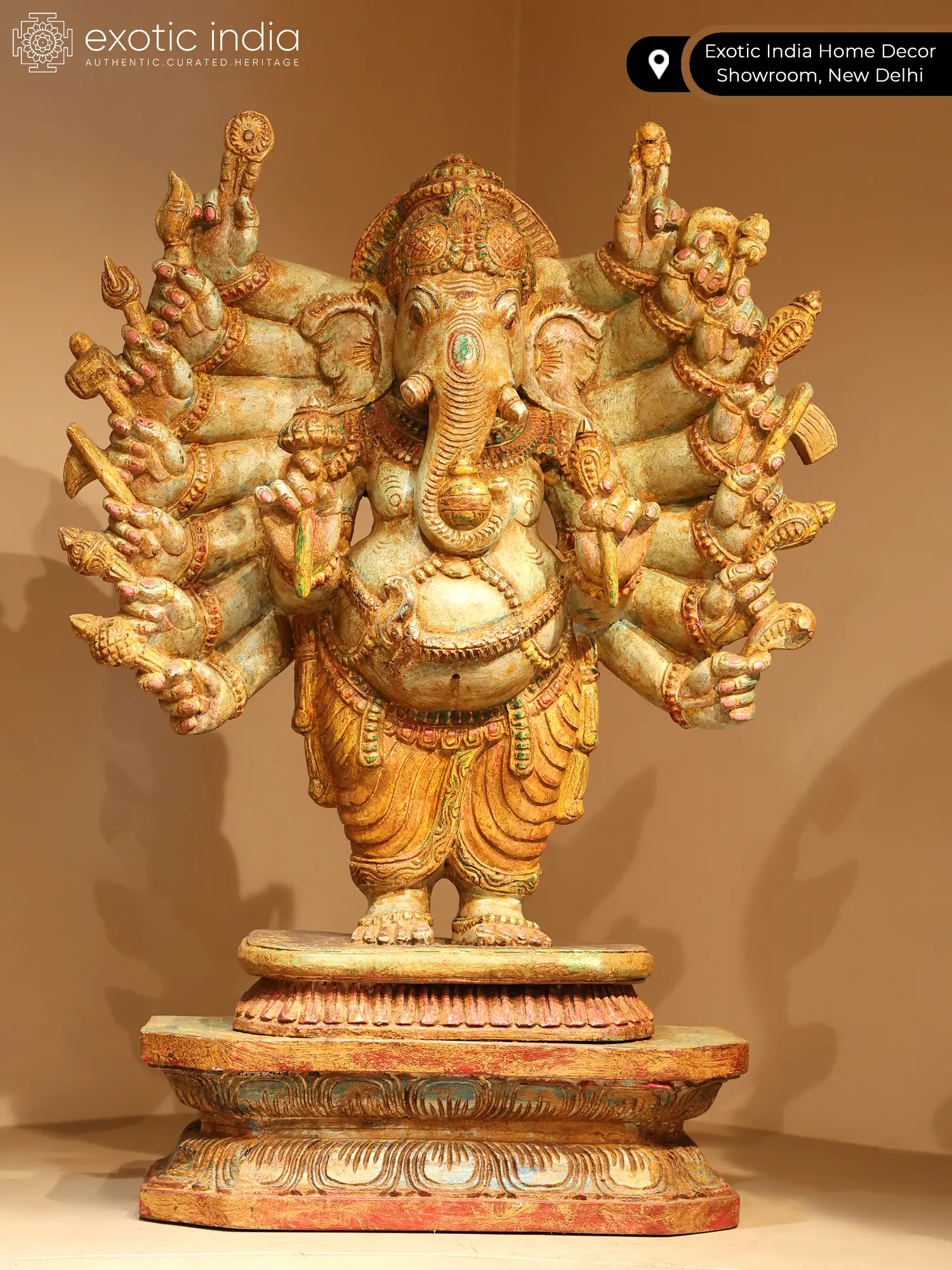 This exceptional wood carving of Bhagawan Ganesha in vintage finish, three feet in height but immeasurable in its magnificence and grandeur, defines his Vira Ganapati – the ‘valiant warrior’ form, one of his initial thirty-two classical forms which early texts, the eighth century Maudgalya Purana in special, have identified or conceived.