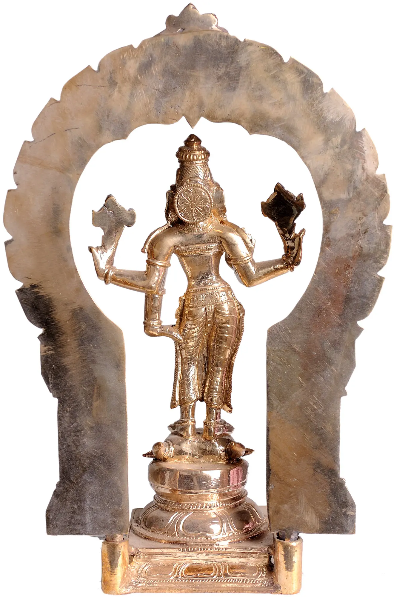 In Tamil hadu, where this bronze originated, Goddess Durga is widely perceived as the sister of Bhagwan Vishnu, whose attributes of chakra (discus) and shankh (conch) she is seen here holding. The goddess is a youthful figure, with her one front hand raised in the abhaya mudra of protection while the other rests gracefully against her thigh in a gesture of ease (katyavalambita murti). Her long dhoti is held in place with a jeweled girdle. She stands triumphantly in tribhanga on the head of the buffalo demon (Mahisha) severed by herself. An elaborate prabha frames the goddess, and is topped by a Kirtimukha the supreme symbol of auspiciousness.