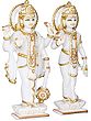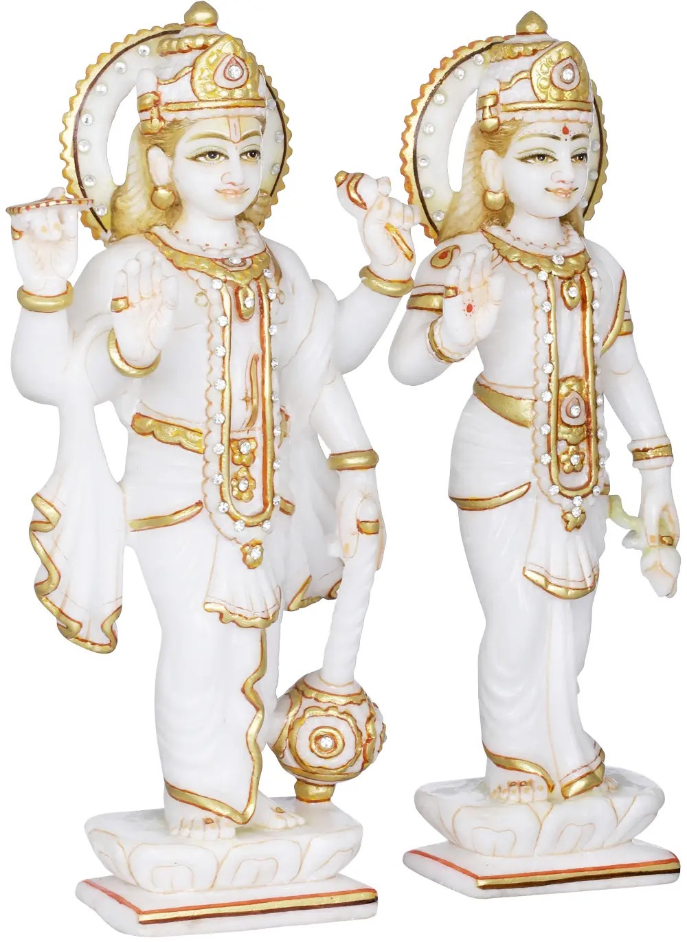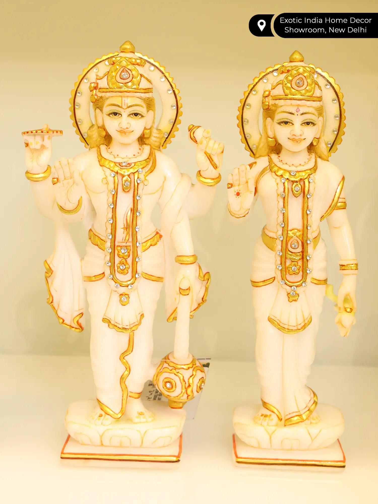 The chaturbhujadhari Lord Vishnu is in a silken dhoti, the hem of which grazes His feet. The angavastram floats about Him as He raises one of the anterior hands in blessing. In the other He holds, but not wields, a gada; the characteristic chakra and conch in the hands of His posterior arms. The crown on His haloed head and the shringar that graces His torso match those of His wife’s, the beauteous Devi Lakshmi’s.