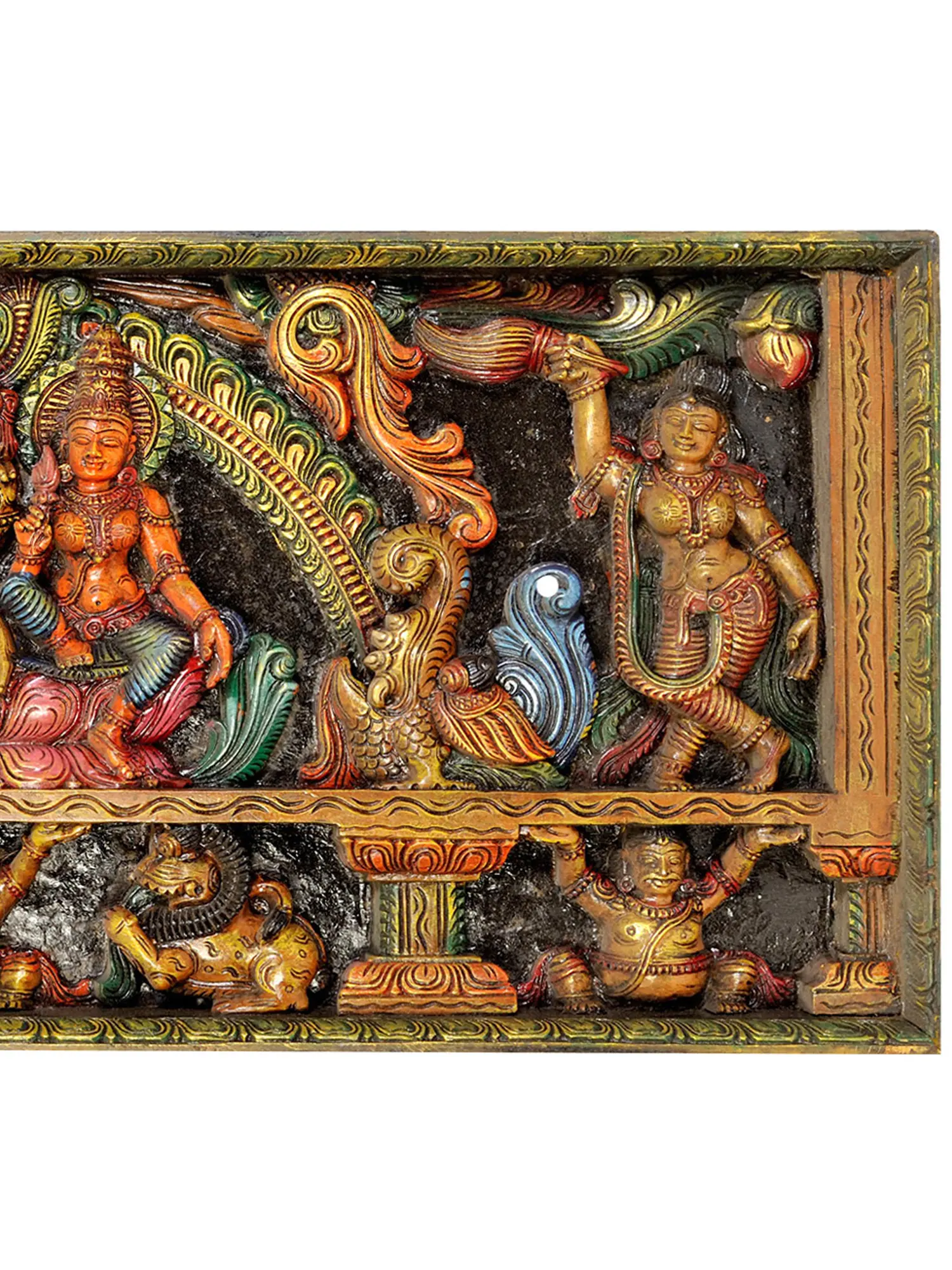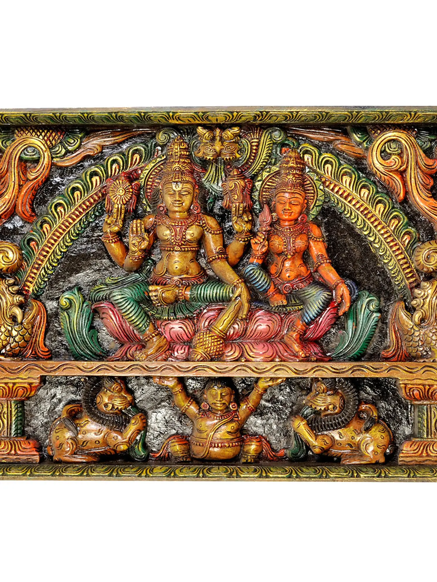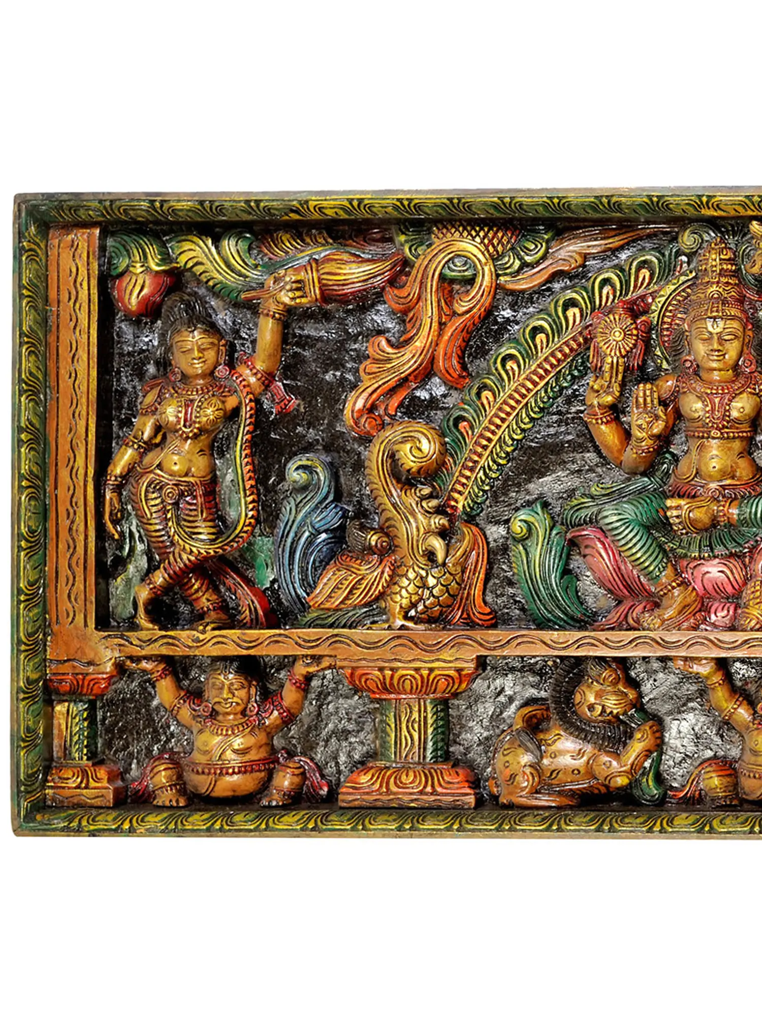 This remarkable piece is a testament to the enduring legacy of South Indian temple wood carving. The artisans, drawing upon generations of knowledge and spiritual devotion, have transformed a block of wood into a narrative of divine grace and cosmic order. Each chisel stroke reveals a deep understanding of form, proportion, and the spiritual essence of the deities. The vibrant, hand-applied colors add another layer of depth and artistry, making this panel a captivating centerpiece that invites contemplation and reverence. It is more than just a decorative object; it is a conduit to the divine, a tangible connection to the rich tapestry of Indian mythology and art.