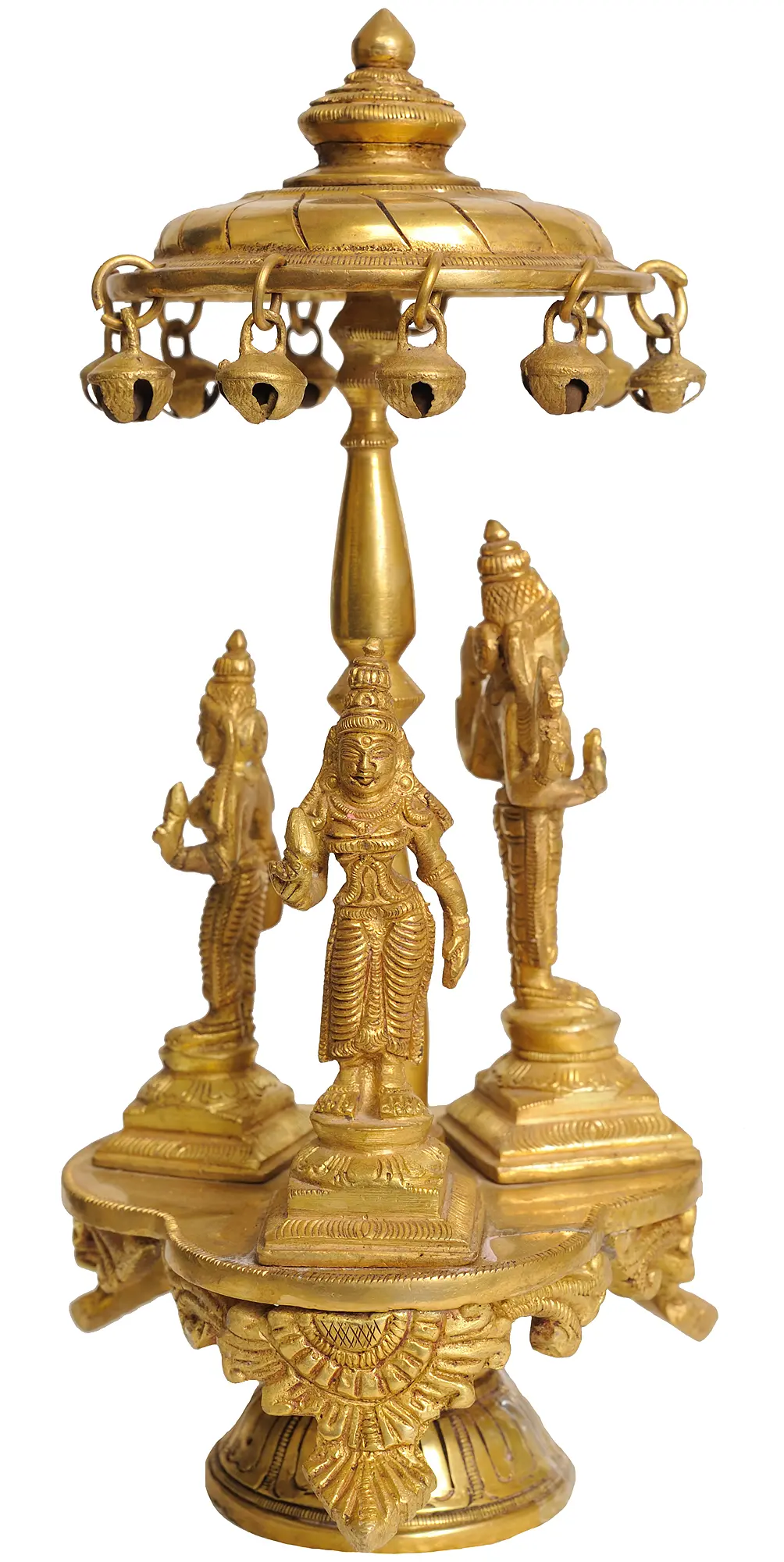 Crowning this divine tableau is a magnificent revolving parasol, a symbol of royalty, protection, and divine authority. Suspended from the edge of the parasol are numerous small, resonant bells. In Hindu culture, bells are often rung during prayers and rituals to awaken the deities and to signify the auspicious presence of the divine. The gentle tinkling of these bells, when the parasol is gently turned, creates an ethereal soundscape, invoking a sacred atmosphere and drawing one's consciousness towards the divine. The parasol itself, with its fluted design and tiered structure, resembles the grand architecture found in ancient South Indian temples, further anchoring the piece in its cultural context. The legend of Vishnu often involves him resting on the cosmic serpent Shesha, under a divine canopy, signifying his eternal vigil over creation. This parasol, therefore, can be seen as a miniature representation of that celestial resting place, symbolizing Vishnu's unending care for the universe. The inclusion of Shridevi and Bhudevi beneath this canopy emphasizes that prosperity and earthly well-being are intrinsically linked to the divine favor of Vishnu. This sculpture is not merely an object of art; it is a conduit for spiritual connection, a reminder of the divine presence in our lives, and a testament to the enduring power of faith.