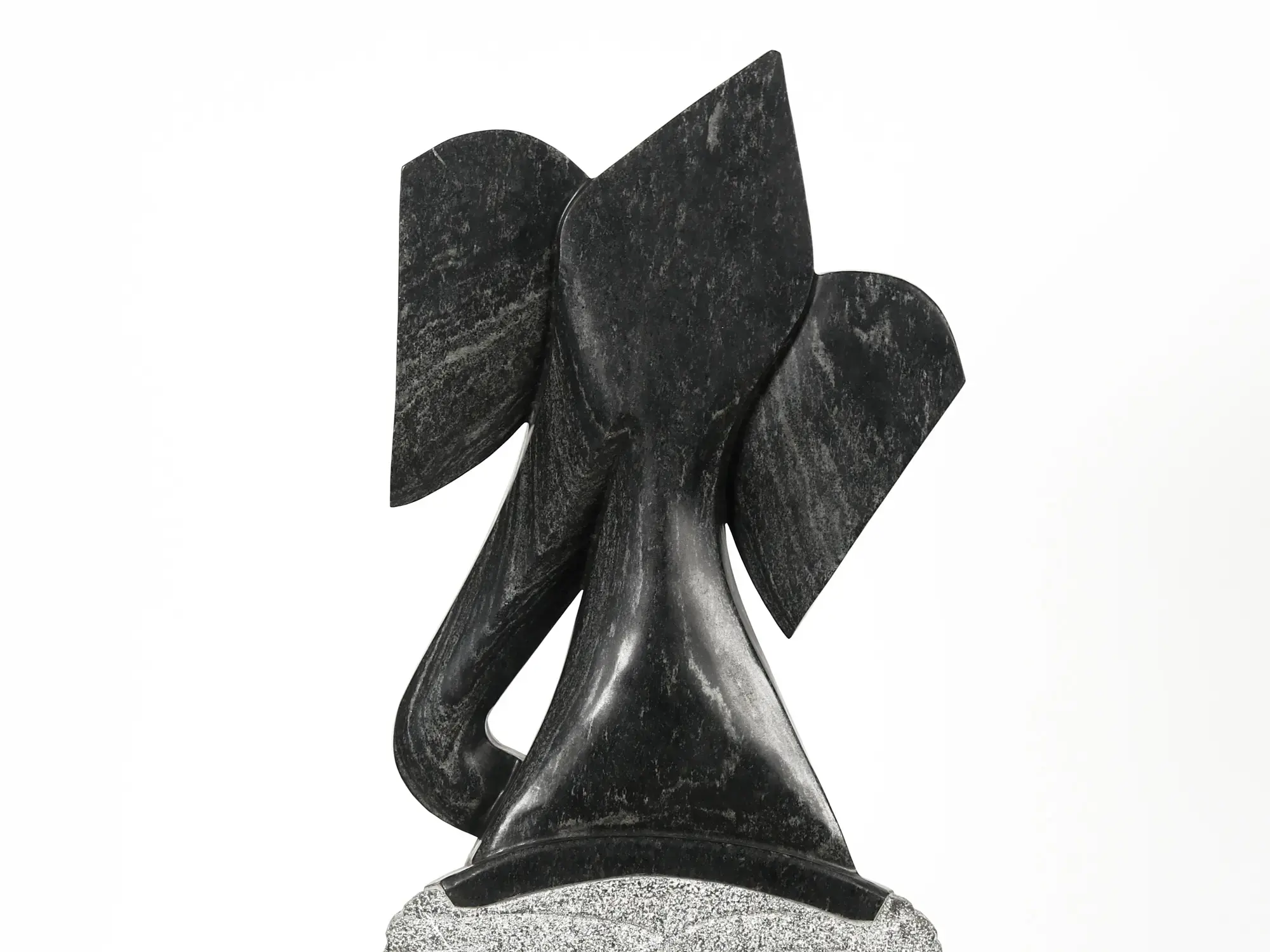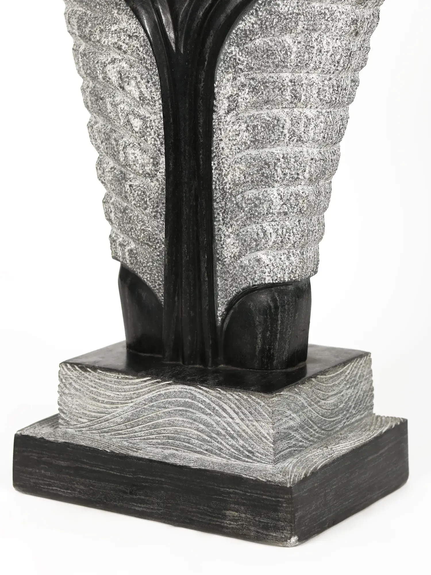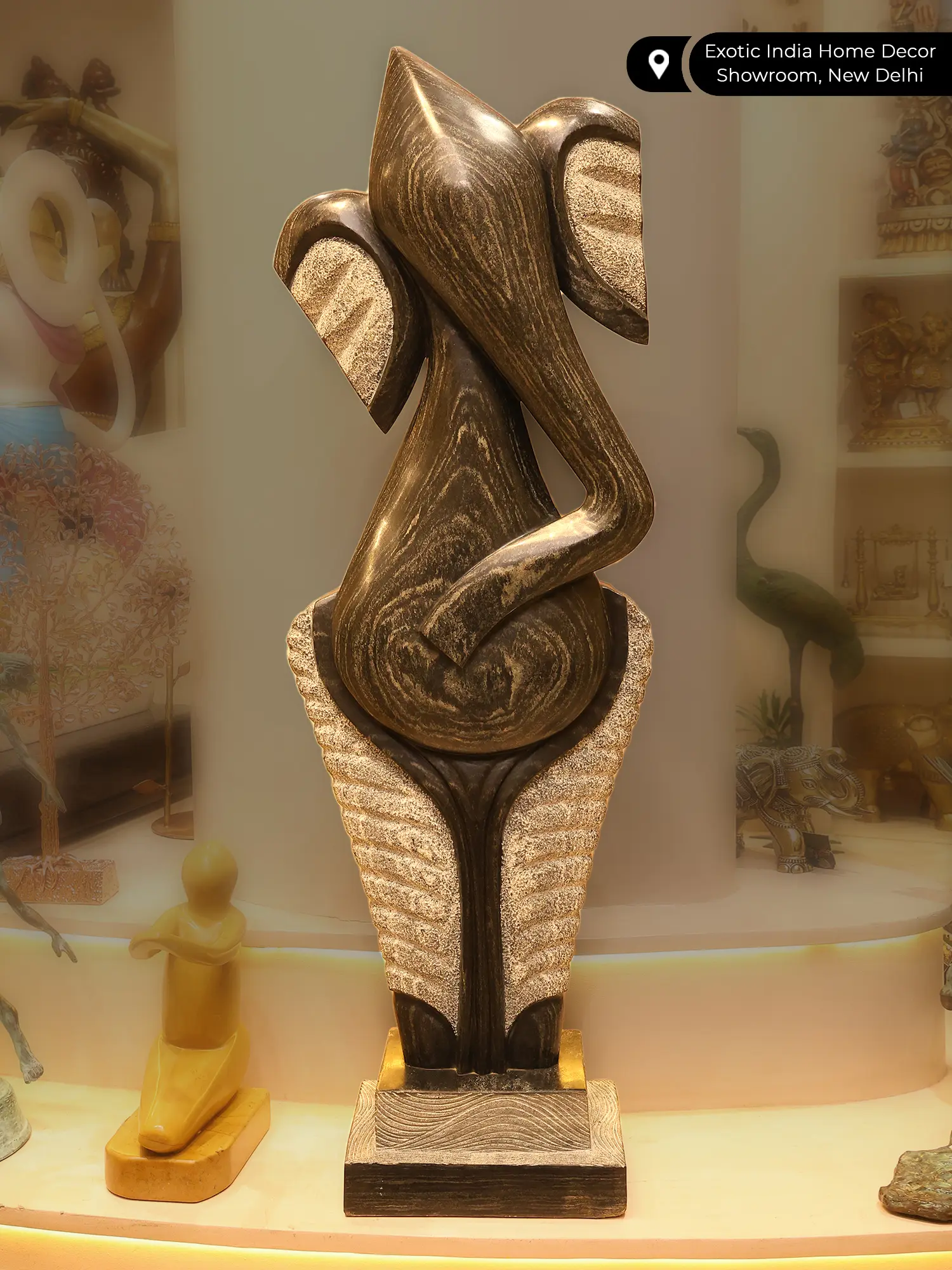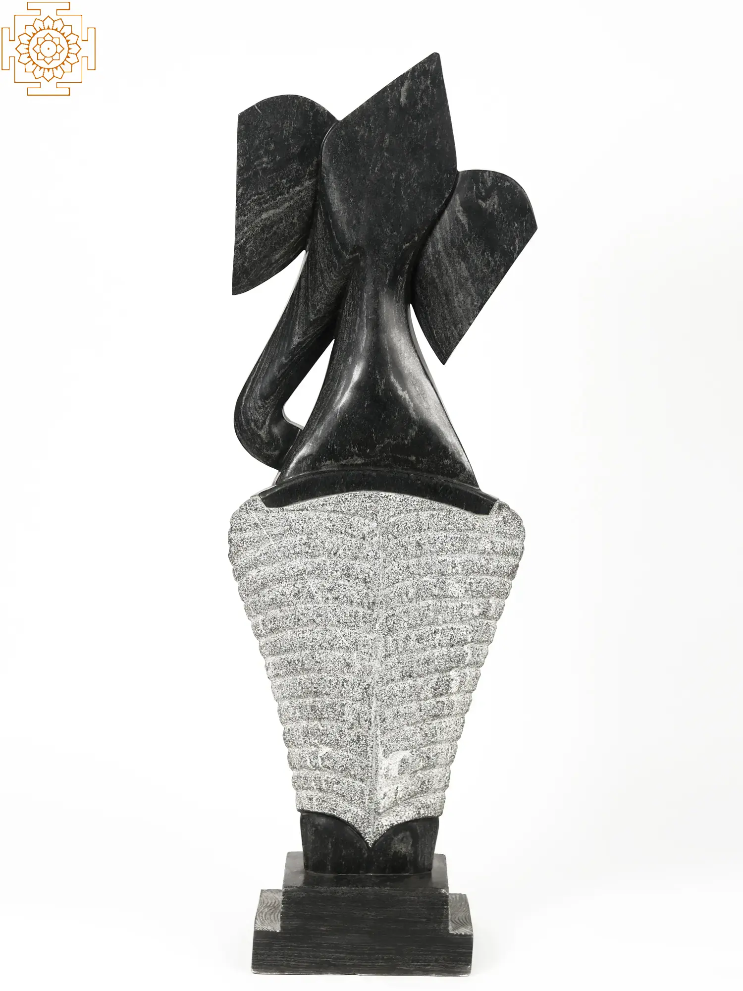 A masterful blend of divine presence and modern artistry, this abstract Ganesha sculpture is carved from richly veined black stone, with a contrasting textured base that heighten its dramatic appeal. Minimalist yet unmistakable, the figure captures the essence of Lord Ganesha through flowing contours and symbolic suggestion rather than literal form.