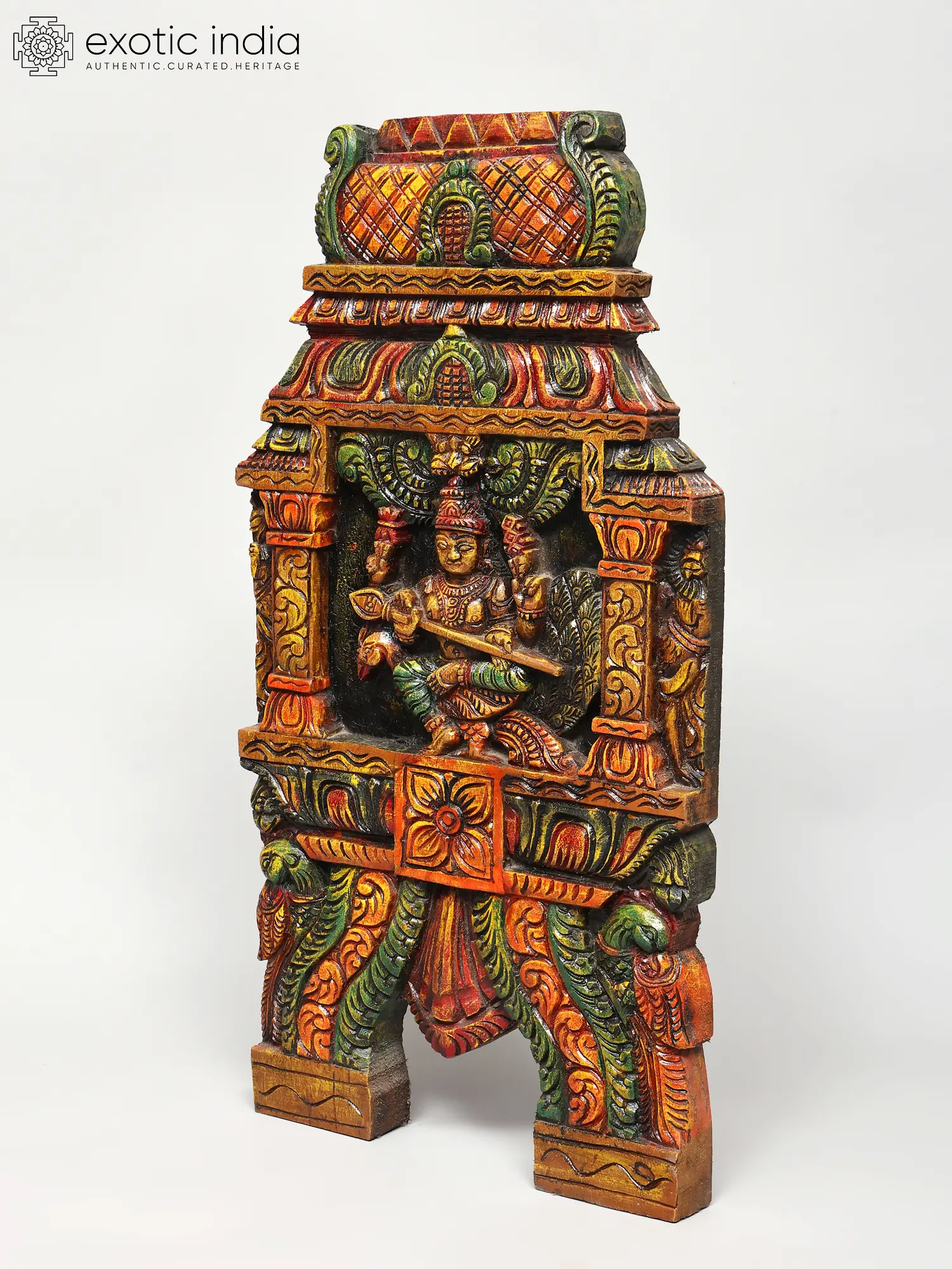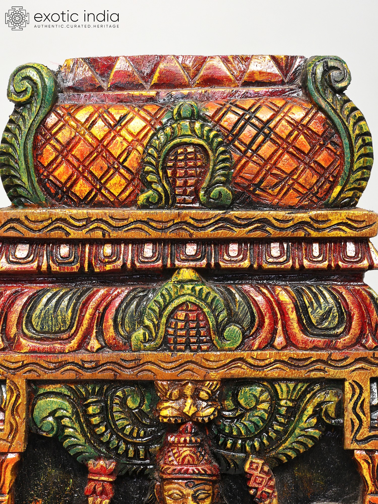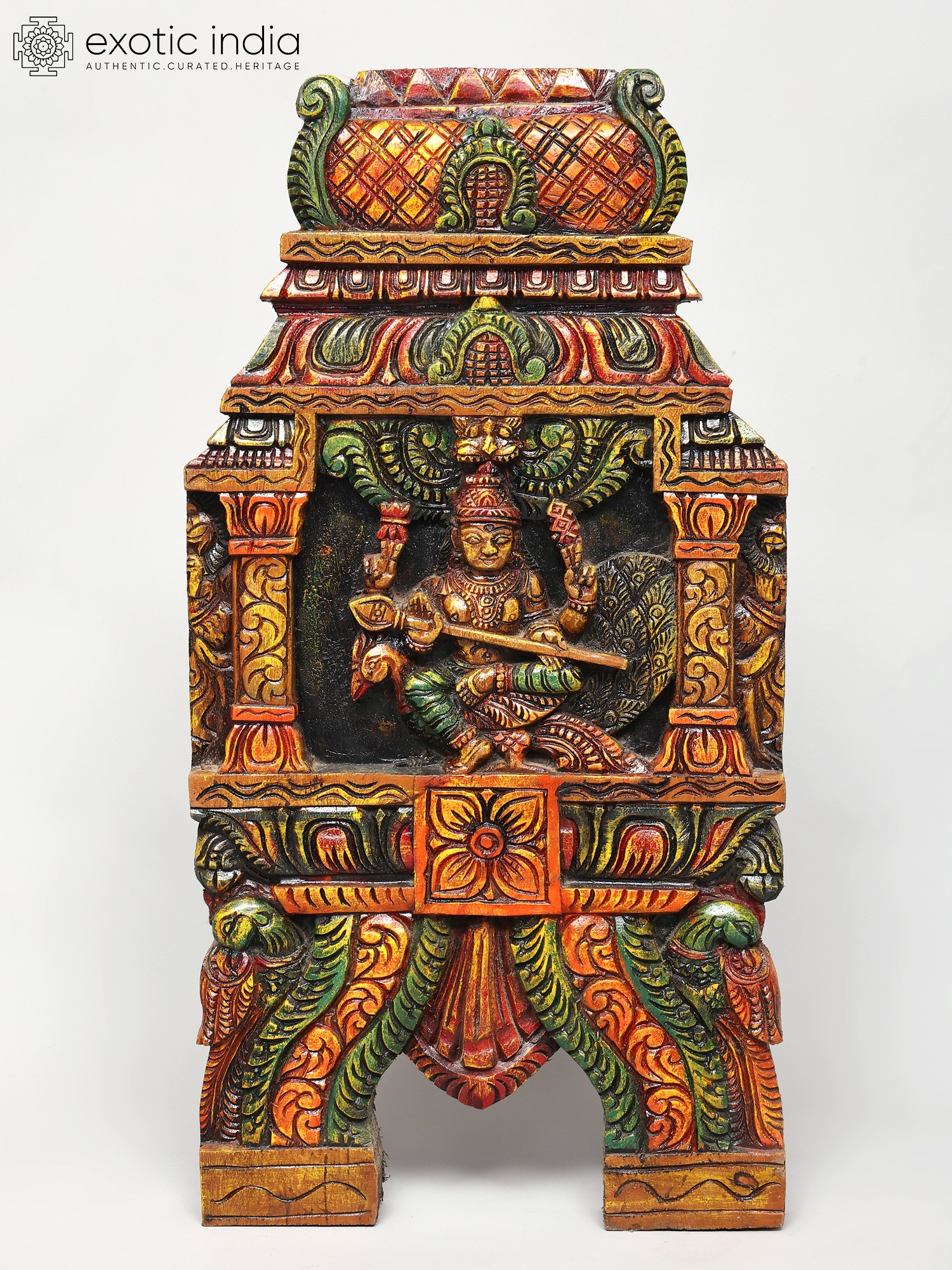 The artistry displayed in this Kavadi panel is truly remarkable. The South Indian temple wood carving tradition is known for its deep-rooted spiritual significance and the incredible precision with which artisans bring divine forms to life. Each curve, each etched detail, tells a story of devotion and craftsmanship passed down through generations. The vibrant hues adorning the panel are not merely decorative; they are often symbolic. The reds might signify energy and power, the greens represent life and auspiciousness, and the golds evoke divinity and prosperity. The textured finish adds depth and character, inviting closer examination of the intricate patterns and motifs that surround the central deity. This piece is more than just a decoration; it is a sacred object imbued with cultural and spiritual meaning.