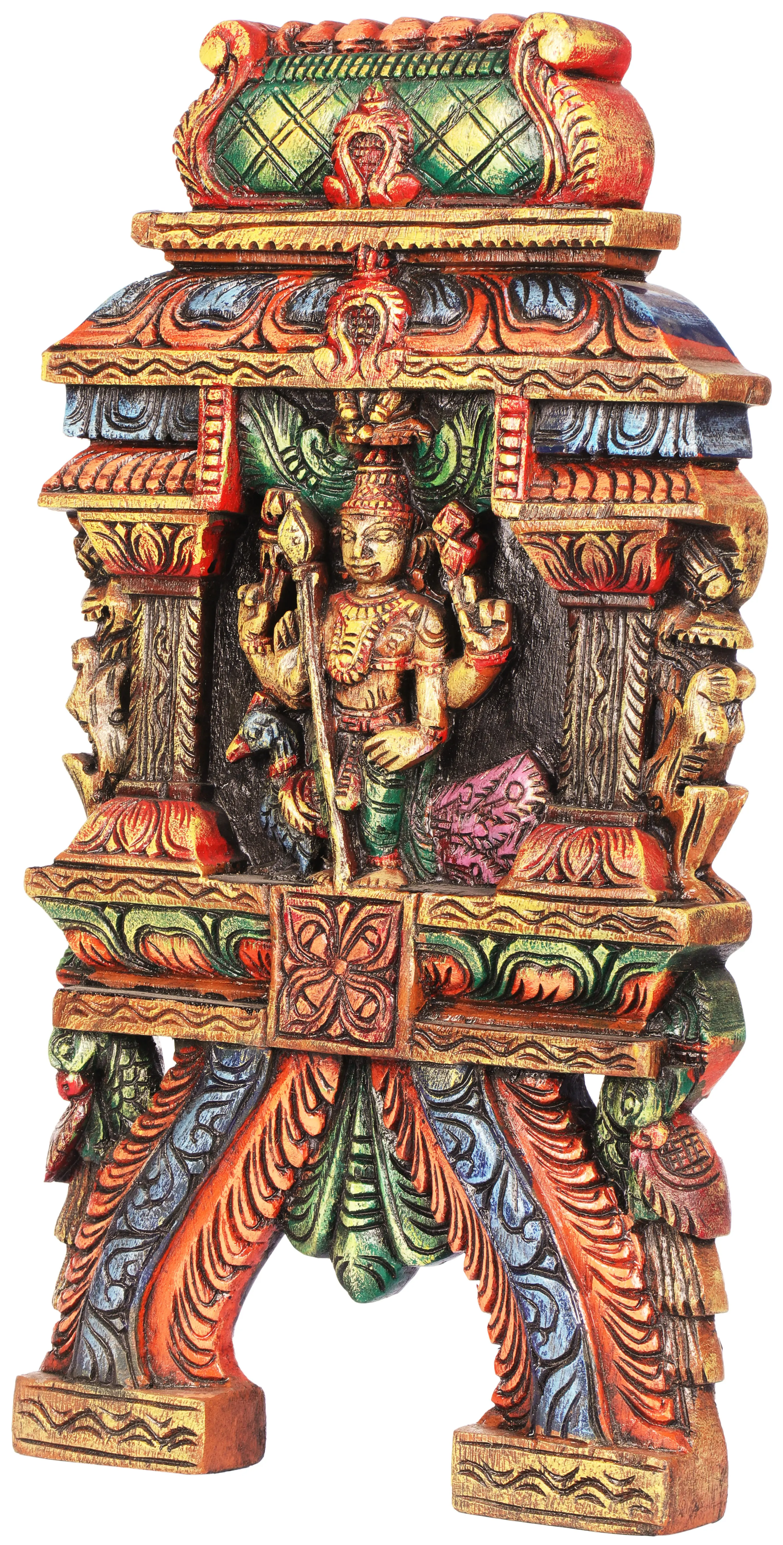 This wall hanging is a remarkable example of South Indian temple wood carving, a craft that has been passed down through generations. The vibrant colors and elaborate ornamentation speak to the rich artistic heritage of the region, where such carvings are integral to temple architecture and devotional practices. Each stroke of the chisel brings forth a sense of divine artistry, reflecting the artisans' deep understanding and reverence for the subject matter. The rich, earthy tones and the detailed rendering of textures and forms create a truly captivating piece that will be a focal point in any space. The intricate floral motifs and architectural elements surrounding the deity further enhance its visual appeal, evoking the grandeur of sacred temples.