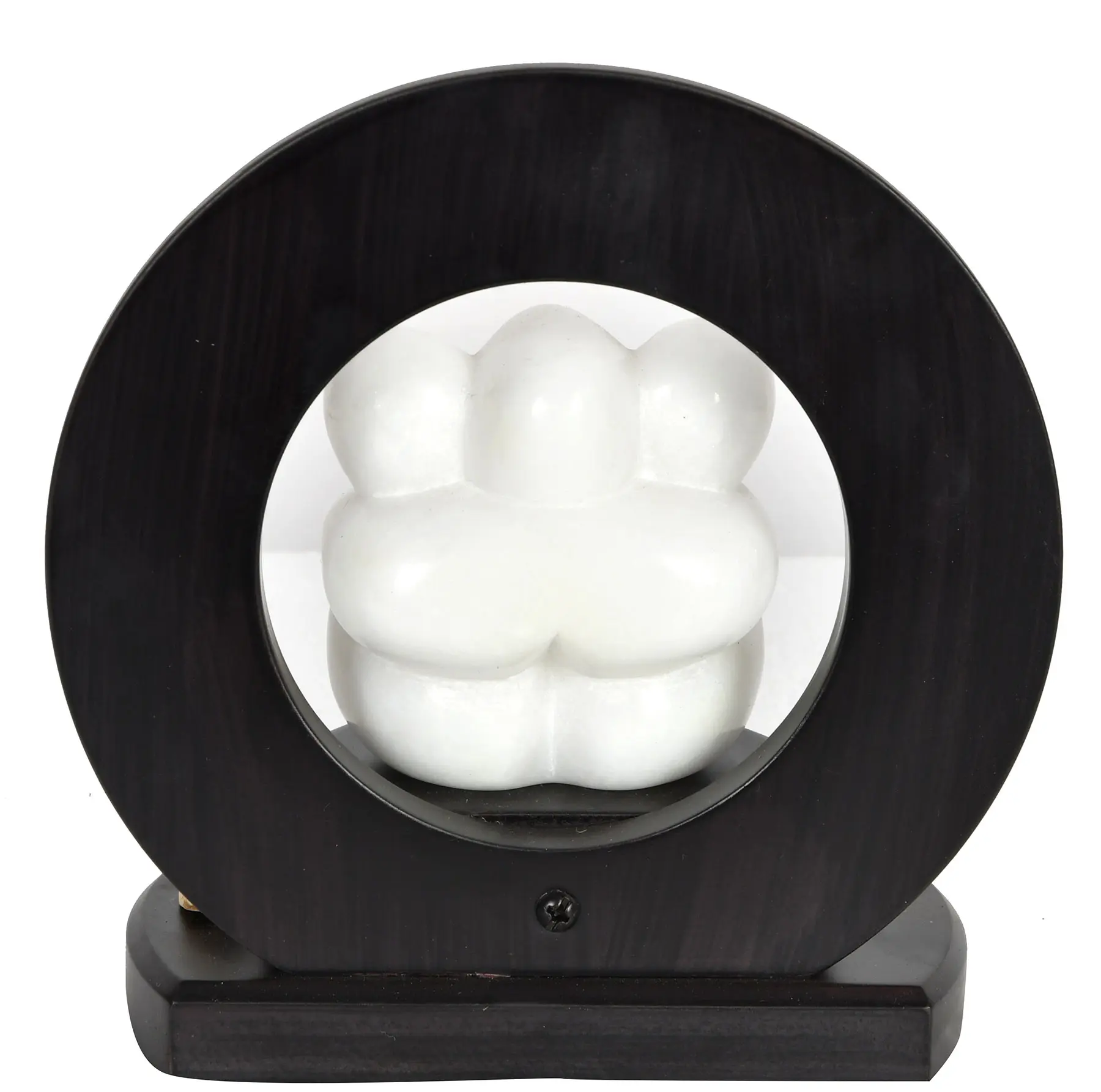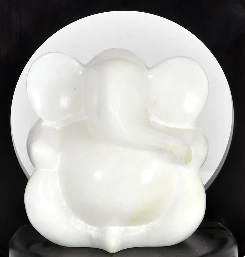 This Ganesha Seated on a Wooden Pedestal is a mesmerizing tribute to the moon-like complexioned Lord Ganesha. The white statue, devoid of features, exudes an enchanting aura, symbolizing purity and divinity. Against the black background, the contrast amplifies, making the white statue stand out with striking prominence, drawing attention to its ethereal presence.