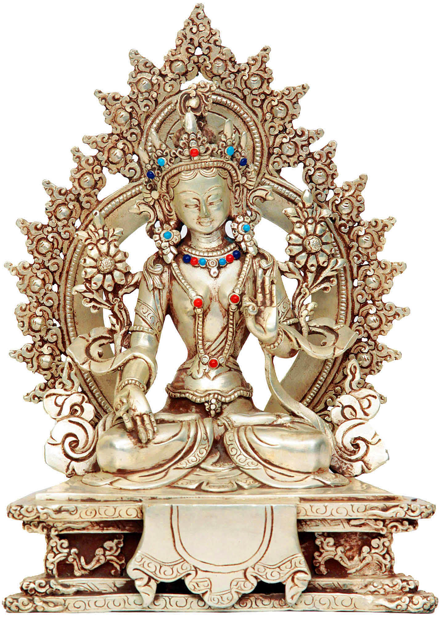 The cult of Tara in Buddhism seems to emerge during early centuries of the Common Era, which it might have adopted from aboriginal tribes. Being more impressive or effective and popular it might have absorbed other similarly prevalent cults and emerged as the mightiest. As perceive the Buddhist texts and the popular tradition, Tara had many versions, five of them identified as well distinct forms : ‘Sit’ or White Tara, Shyama or Green Tara, Bhrakuti or Yellow Tara, Ekajata or Blue Tara, and Kukukulla or Red Tara. These forms of Tara are further diversified; White Tara’s being seven diverse forms. Taras’ names are suggestive of their body-colours and thereby elements of the cosmos which such colours represented and these forms of Tara personified and believed to command. Obviously, this silver plated image, suggestive of the white body-colour, represents White Tara. Contended to emerge from the eye of the Bodhisattva Avalokiteshvara – his Compassion separated, White Tara is often seen as the Bodhisattva of Compassion. She is broadly the great Saviour, helper of every soul in torment and the kinetic power of compassion.