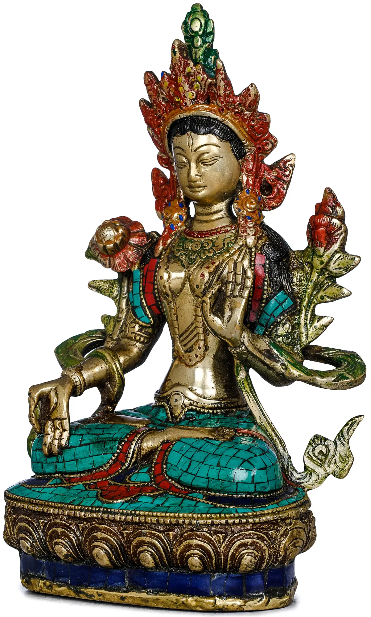 This exquisite brass statue depicts White Tara, a revered Tibetan Buddhist goddess embodying compassion, longevity, and healing. Her serene countenance, with eyes gently closed in meditation, emanates an aura of profound peace and wisdom. She is seated in the lotus posture, a symbol of spiritual purity and enlightenment, her body gracefully adorned with intricate jewelry and vibrant inlay work. The goddess's posture, with her right hand extended in the gesture of *varada mudra* (boon-granting) and her left hand holding the stem of a lotus, signifies her boundless generosity and her ability to offer solace and protection to all sentient beings.