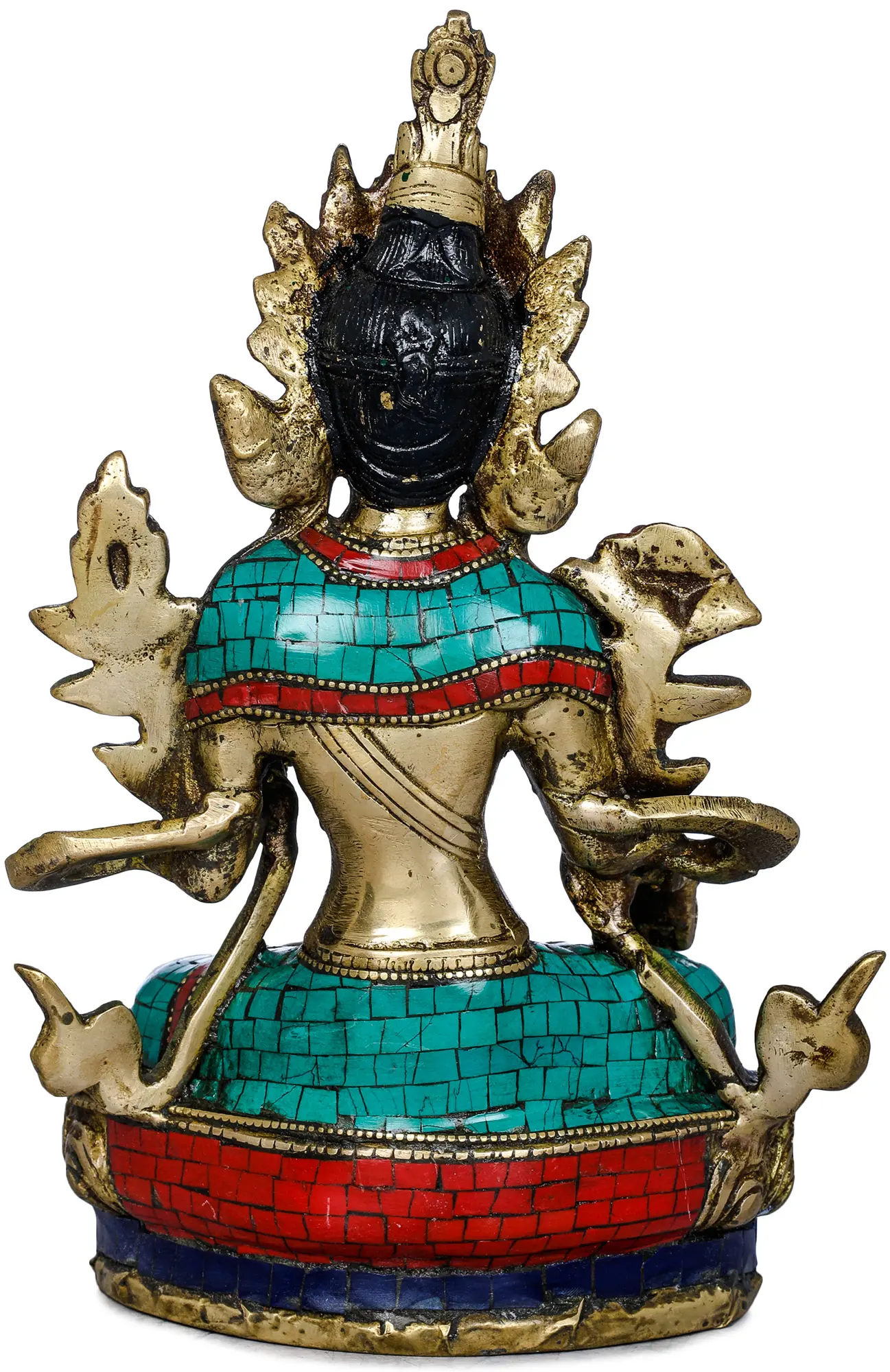 White Tara is one of the most popular deities in Tibetan Buddhism, a manifestation of the Bodhisattva of compassion, Avalokiteshvara. Legend has it that when Avalokiteshvara shed tears of sorrow for the suffering of the world, a white lotus bloomed from his tears, and from this lotus emerged the goddess Tara. White Tara, in particular, is associated with long life, good health, and the overcoming of obstacles and fears. Her white color symbolizes purity, serenity, and the realization of enlightenment. Devotees invoke her for protection, healing, and to gain the strength and wisdom needed to navigate life's challenges. This meticulously crafted statue captures the divine essence of White Tara. The lustrous brass, polished to a warm sheen, serves as a perfect canvas for the detailed inlay work. The vibrant turquoise and red stones adorning her robes and throne create a striking contrast, symbolizing the richness of her blessings and the vibrant energy she bestows. The delicate floral motifs and the symbolic lotus flowers are rendered with exquisite detail, reflecting the artistry and devotion poured into its creation.