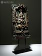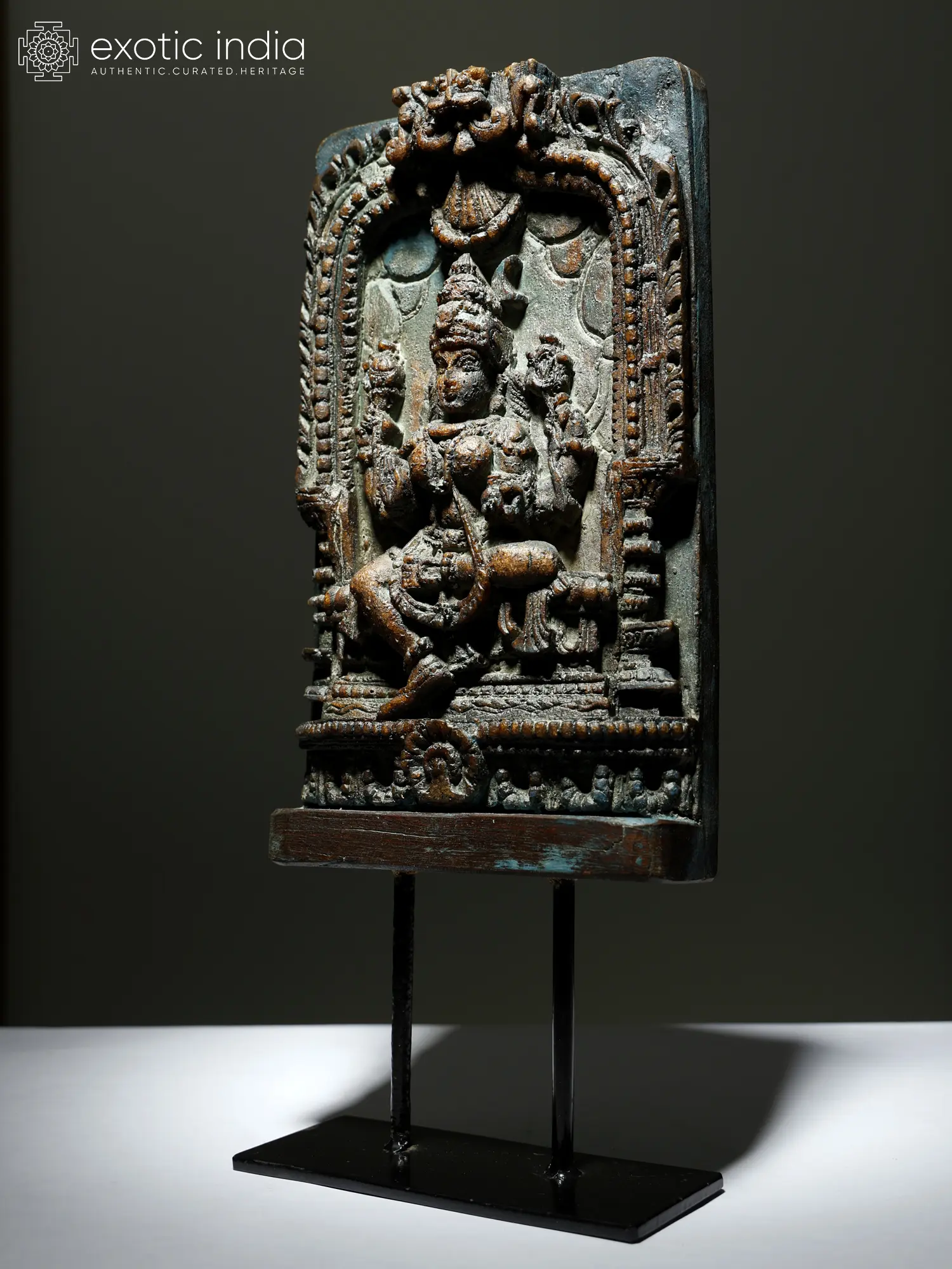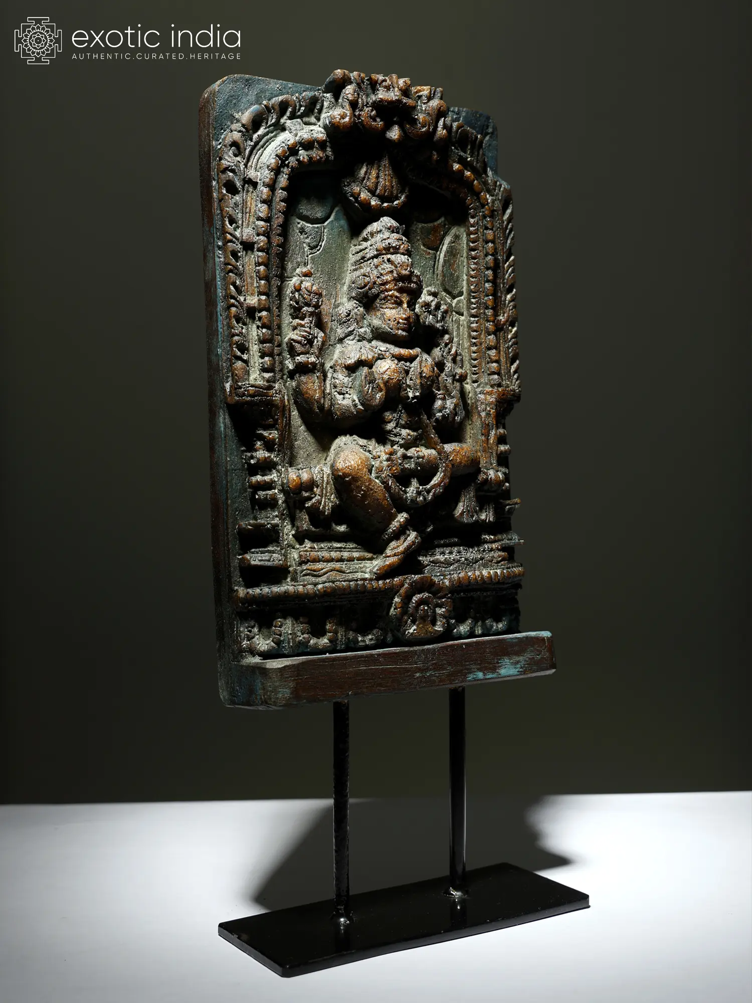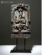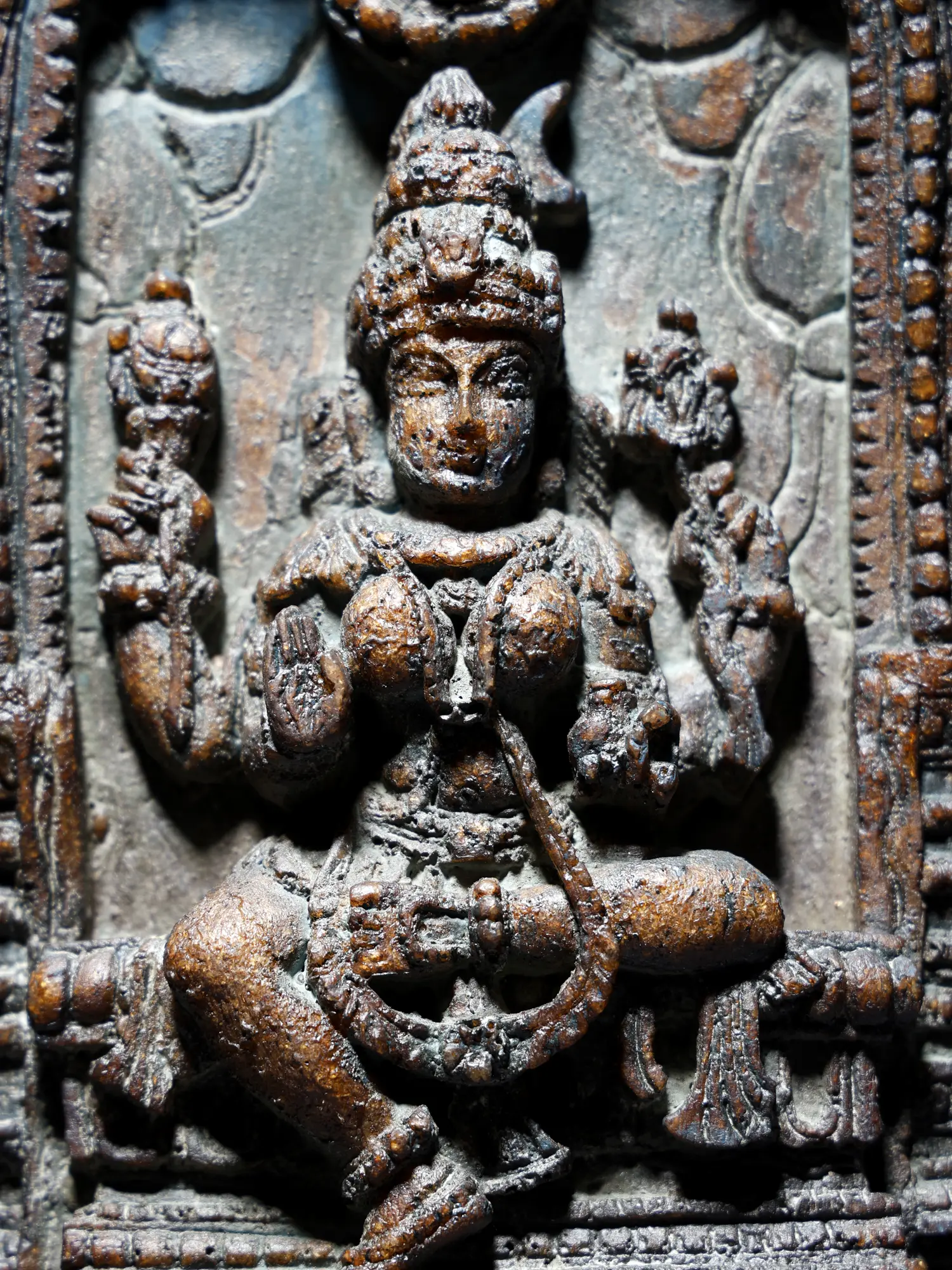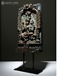 Raised by a minimal iron stand, the wooden tableau houses Mahadevi in a four-armed form, within a Kirtimukha aureole, adorned with the crescent moon, bejeweled ornaments and gently smiling. Despite the appealing antique finish of the piece, the details are immaculately carved.