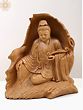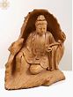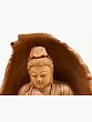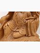 Delicately carved, this wooden statue Kuan-Yin statue is a visualization of the Bodhisattva, seated under a curved tree trunk- probably a willow tree. In this form, Kuan-Yin is shown with a stem of the willow tree in her hand, as seen in this statute. The branch is believed to drive away sickness and is a part of the forty-two insignias of Kuan-Yin. In her right hand, the Bodhisattva holds a rosary.
