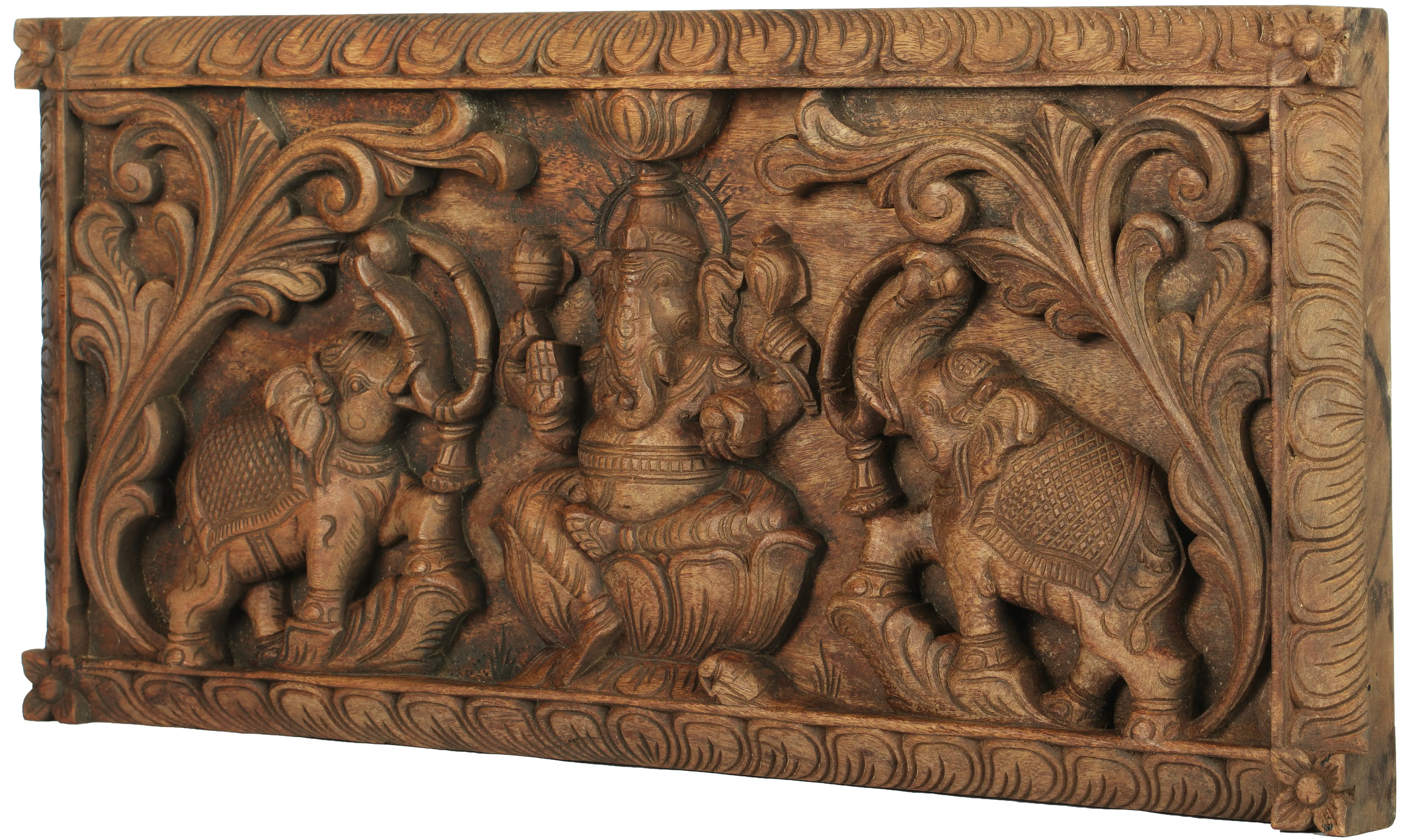 Lord Ganpati, also known as Gajanan, seated gracefully upon a lotus throne, exudes serenity and power. His right hand, in the “Abhaya Mudra”, radiates blessings, while his upper hands hold a symbolic goad and noose, symbolising control over desires and obstacles. Two majestic elephants, with profound reverence, offer fragrant garlands, echoing devotion and adoration. This South Indian temple wood carving, steeped in ancient tradition, serves as a profound reminder of Ganesh's benevolence, protection, and the eternal cycle of creation and dissolution.