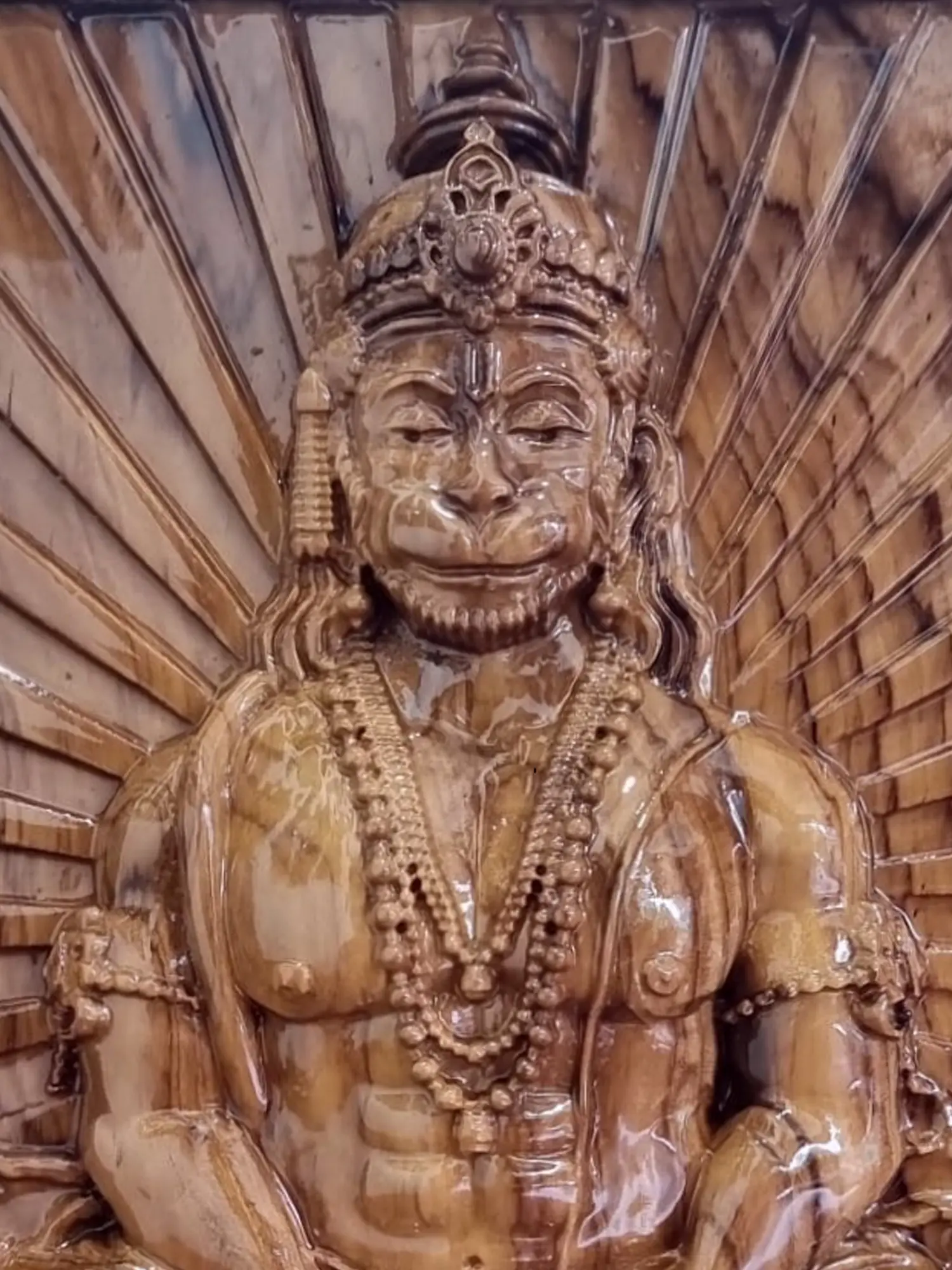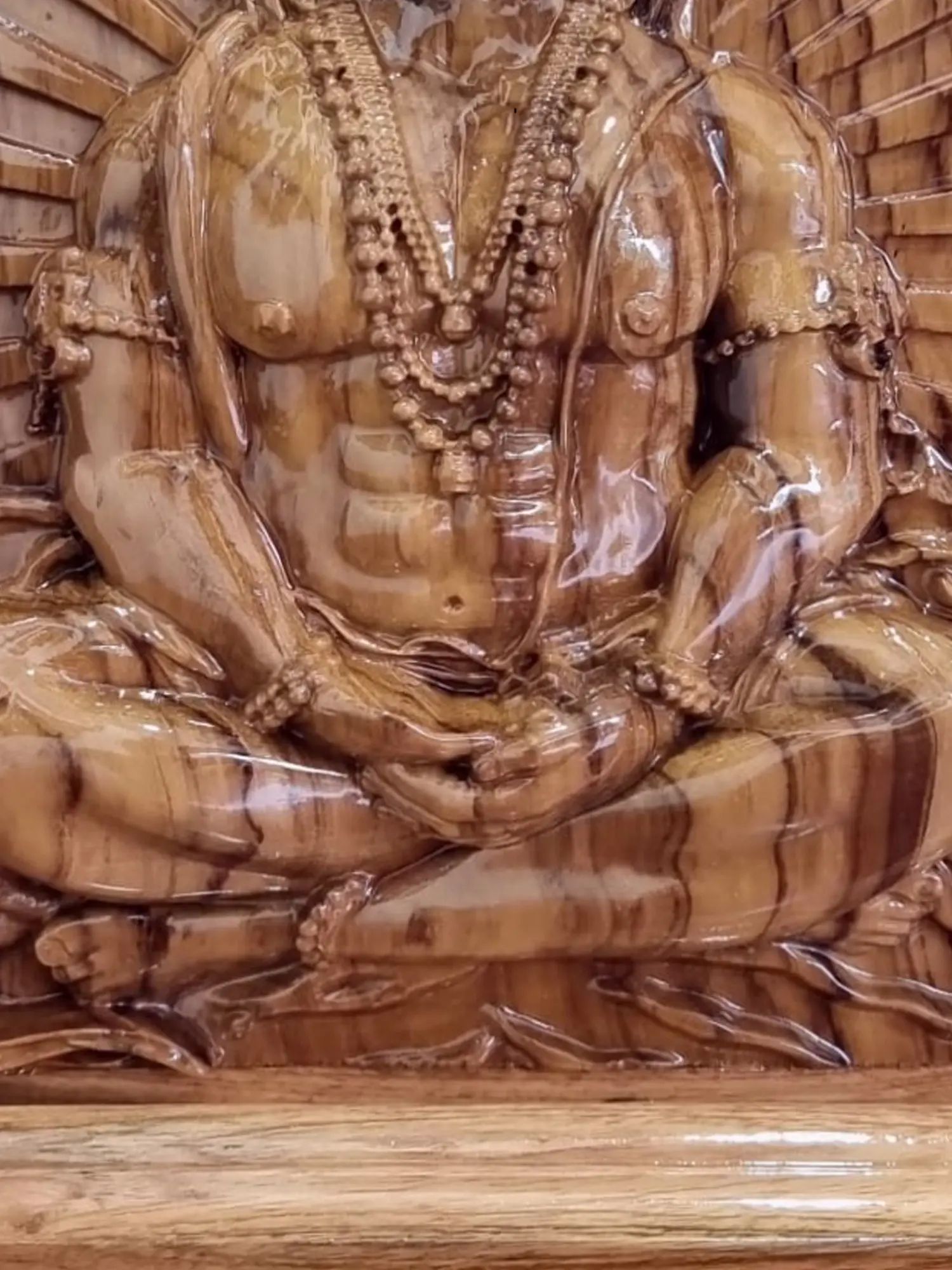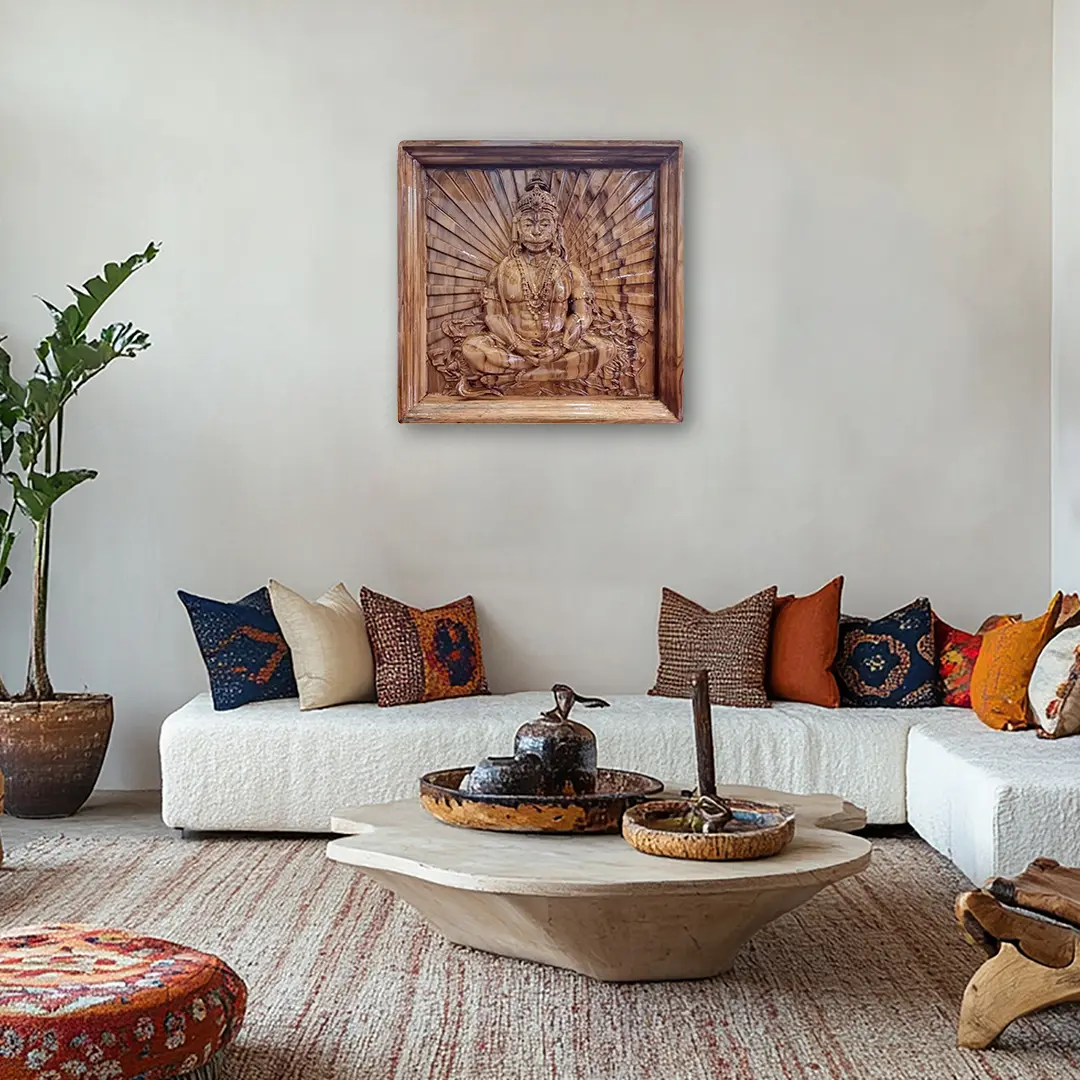 With impeccable craftsmanship and a lustrous “PU glossy polish”, this work of divine reverence exudes an enchanting aura. Here, “Lord Hanuman”, the symbol of devotion and strength, sits in “Dhyan Mudra”, his form a mesmerising blend of elegance and spiritual grace. The deep, rich grain of “Teak Wood” embodies strength, echoing Hanuman’s unwavering devotion and might. As the wood whispers tales of ancient devotion, this wall hanging, transcends its earthly confines, transporting the beholder to a sacred realm, where the divine meets artistry, and serenity reigns in the presence of the mighty Hanuman.