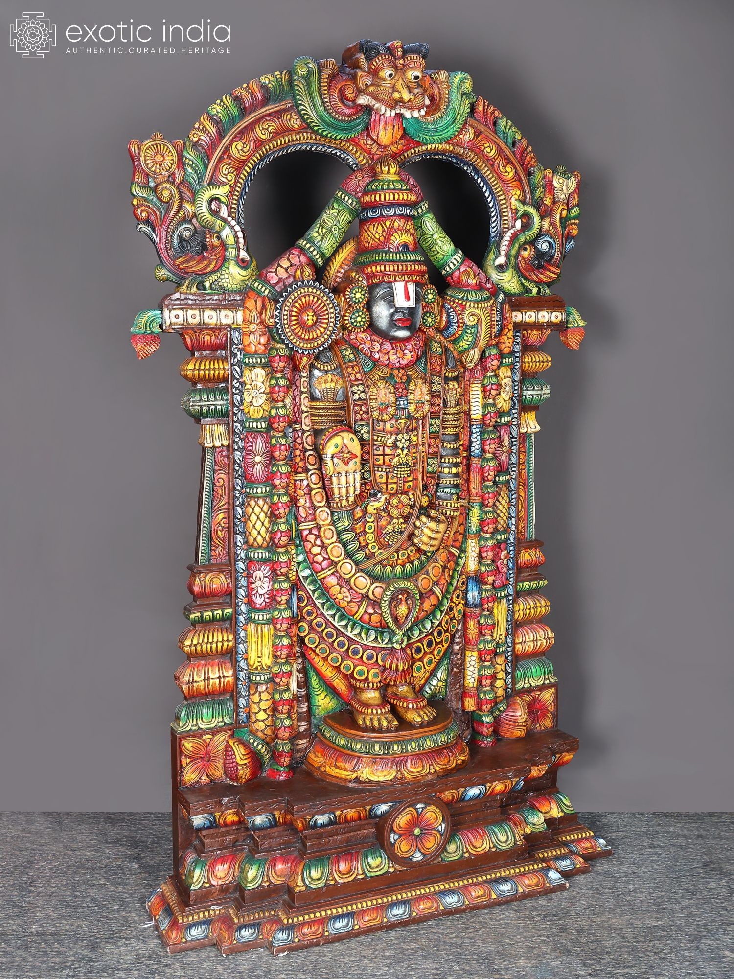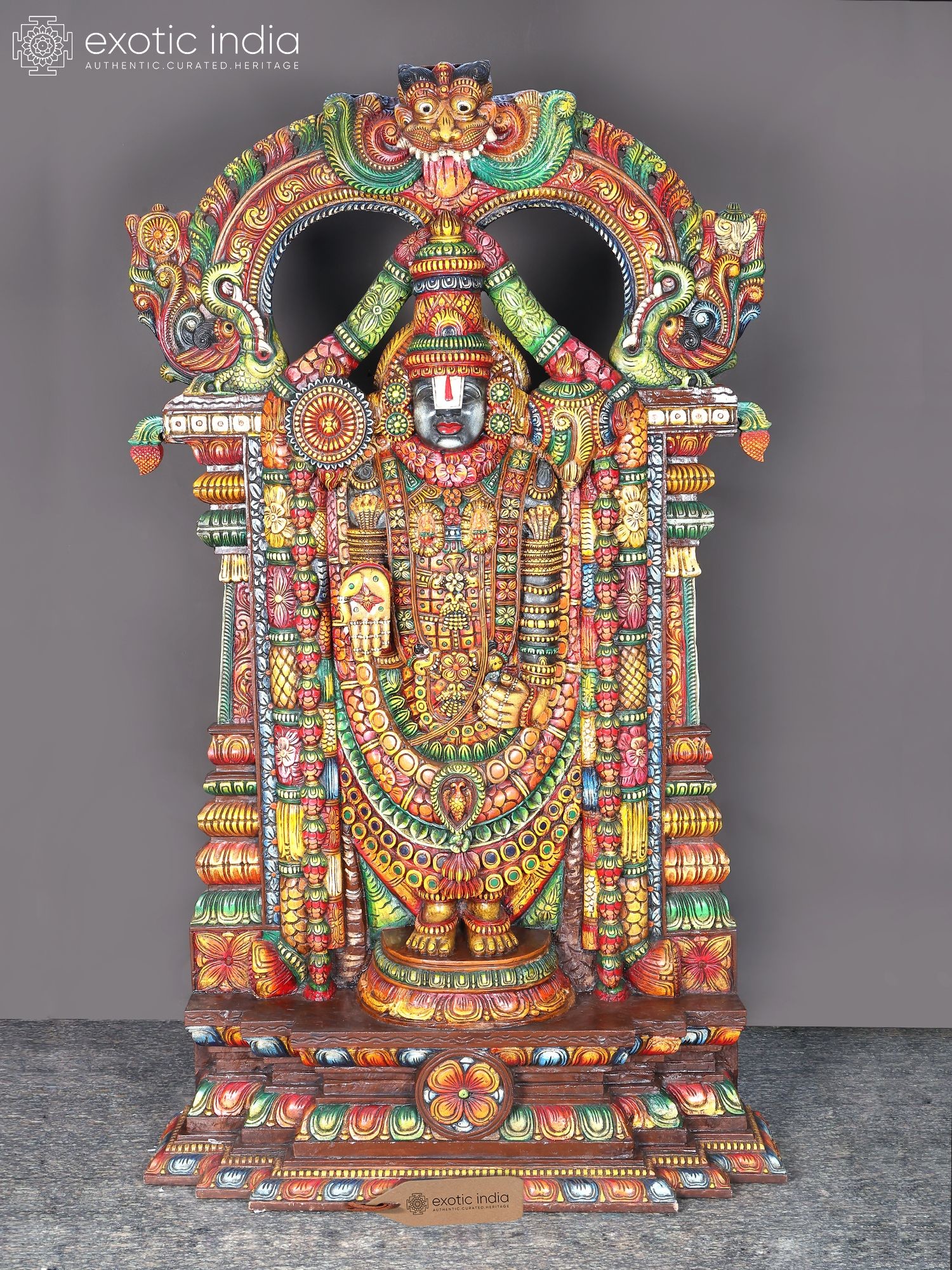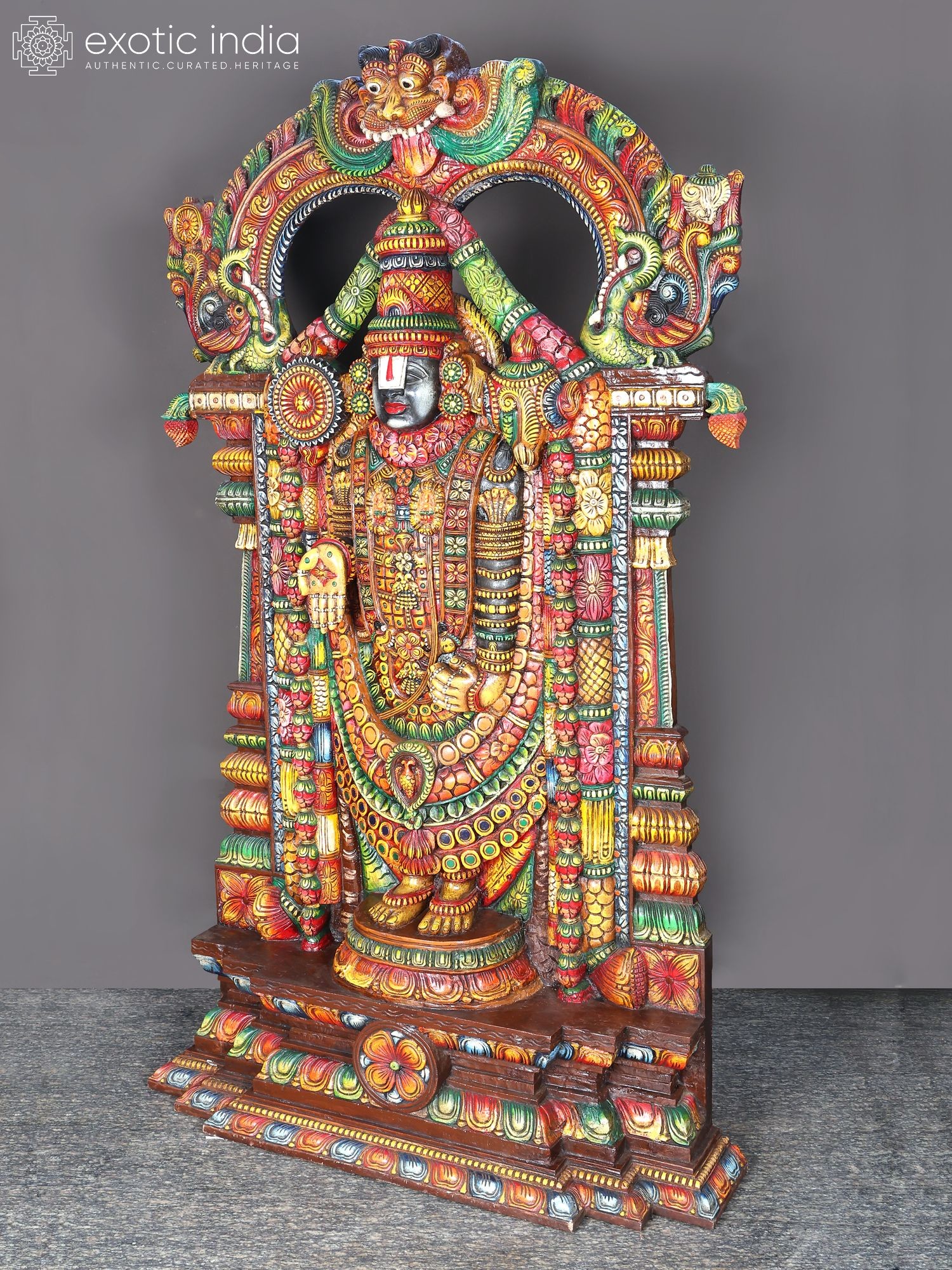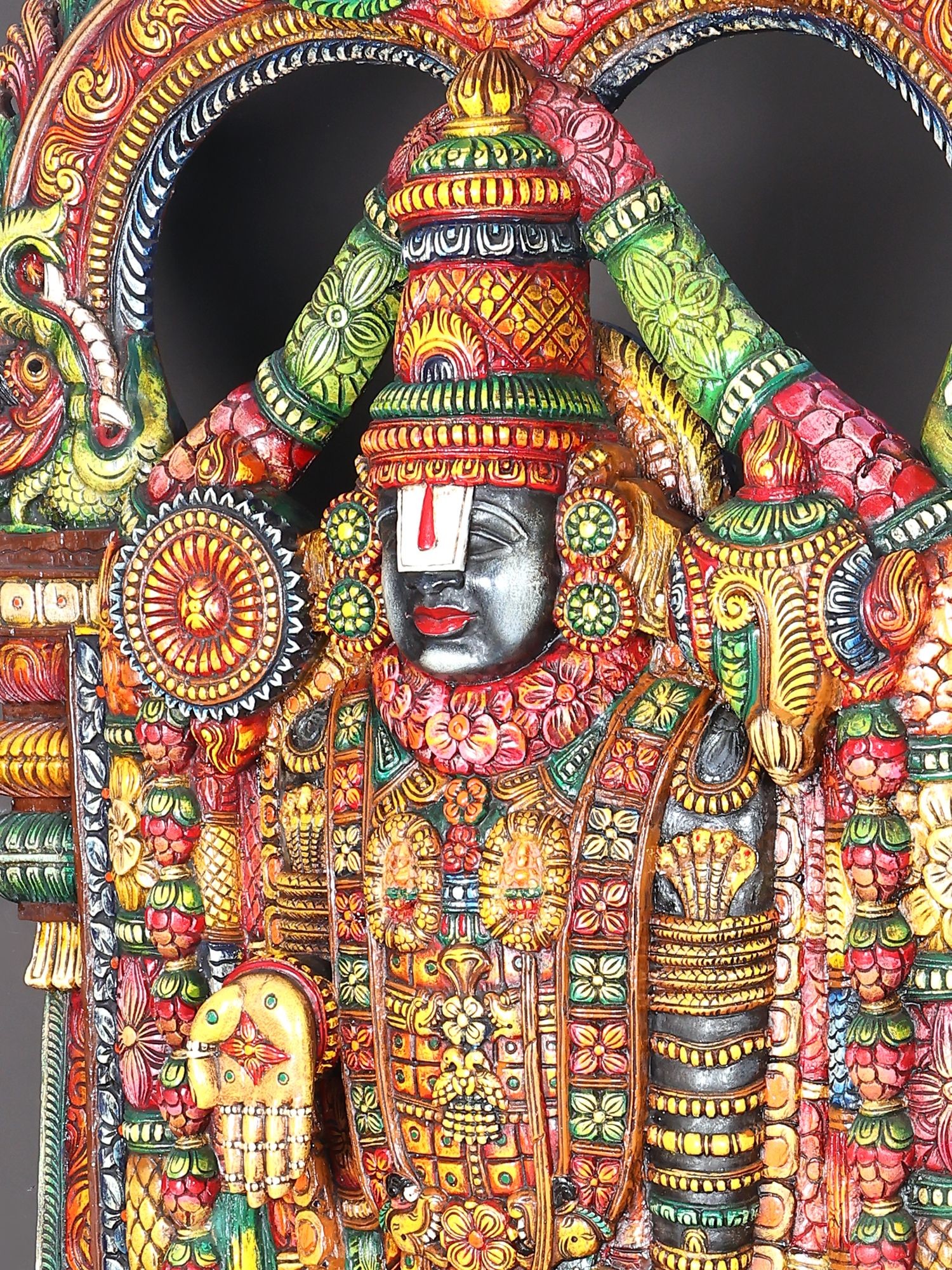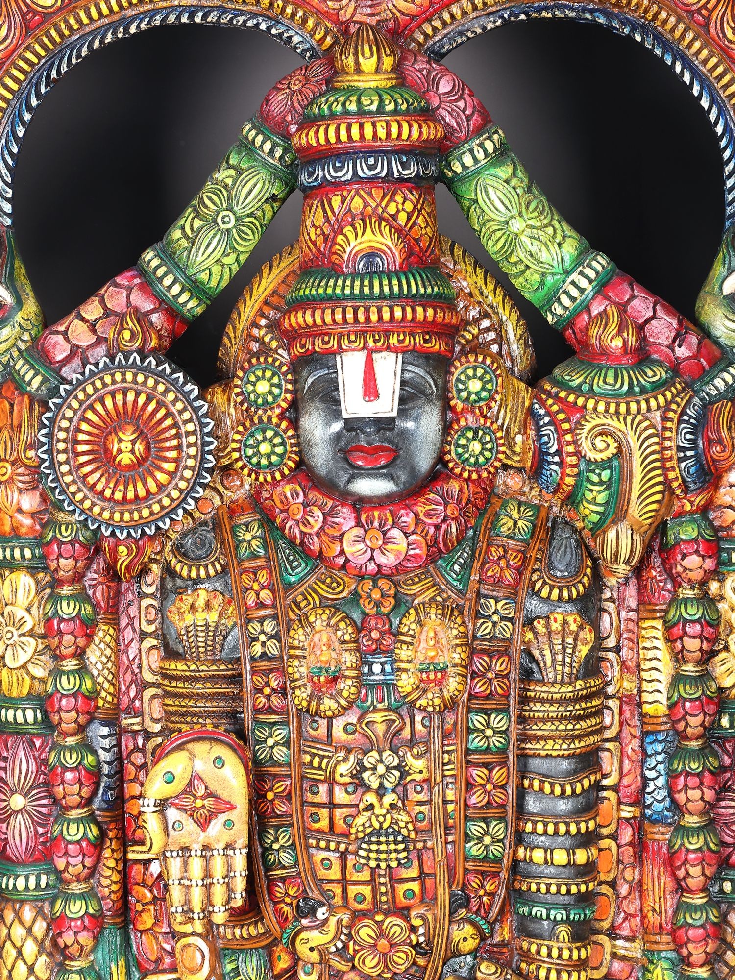 42" Large Colorful Tirupati Balaji (Venkateshvara) Wood Carving with Kirtimukha Arch