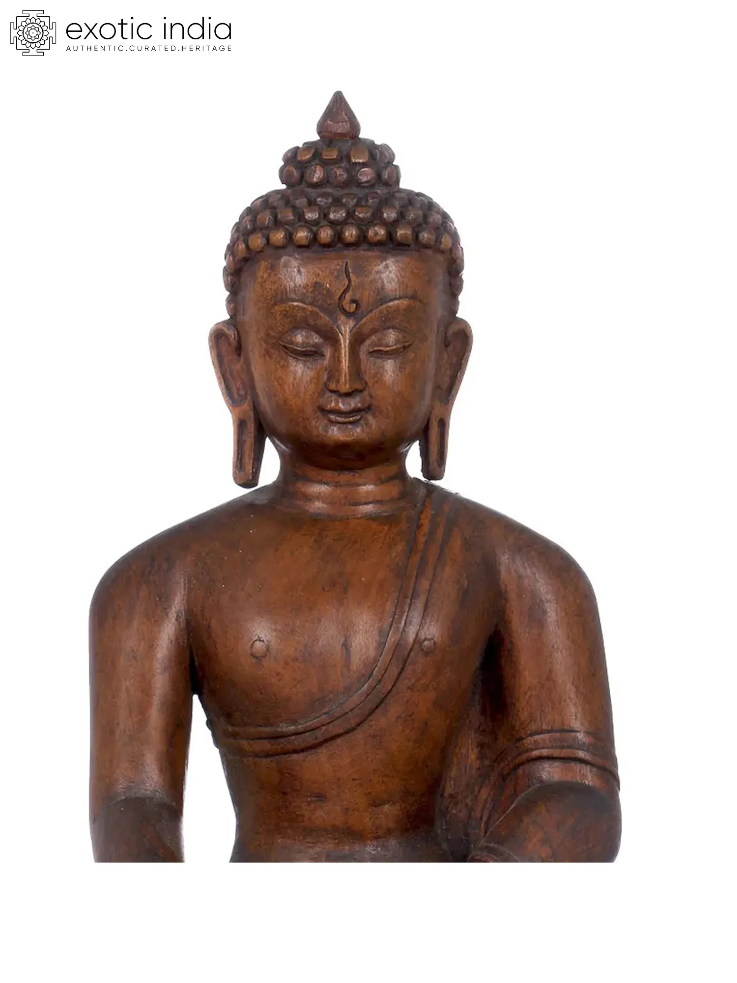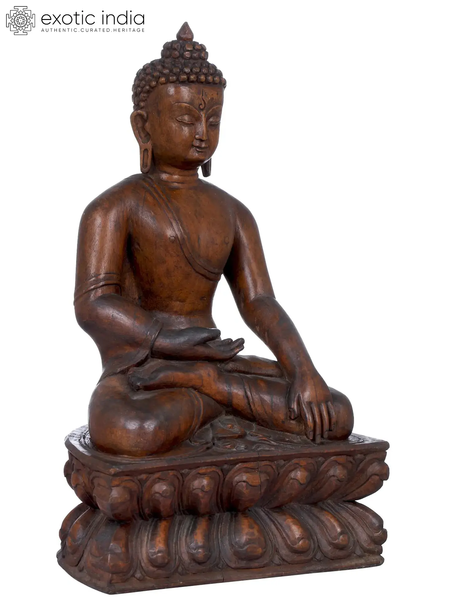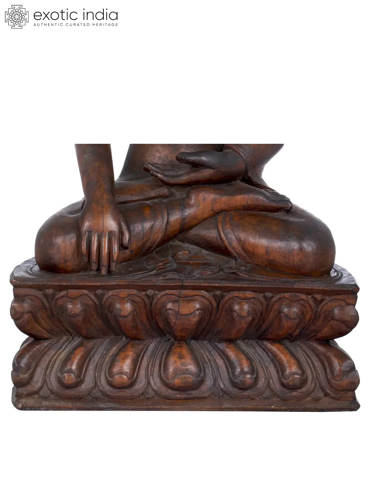Carved from a block of pure homegrown wood, the composition is a deep earthy monotone. Perfect symmetry pervades the Buddha’s shoulders and limbs, from the thoroughly immersed countenance to the lotus pedestal He is seated on. The sheer skill of the sculptor could be deduced from the frontal curvature of the figure’s abdomen and the finesse of the digits.