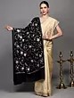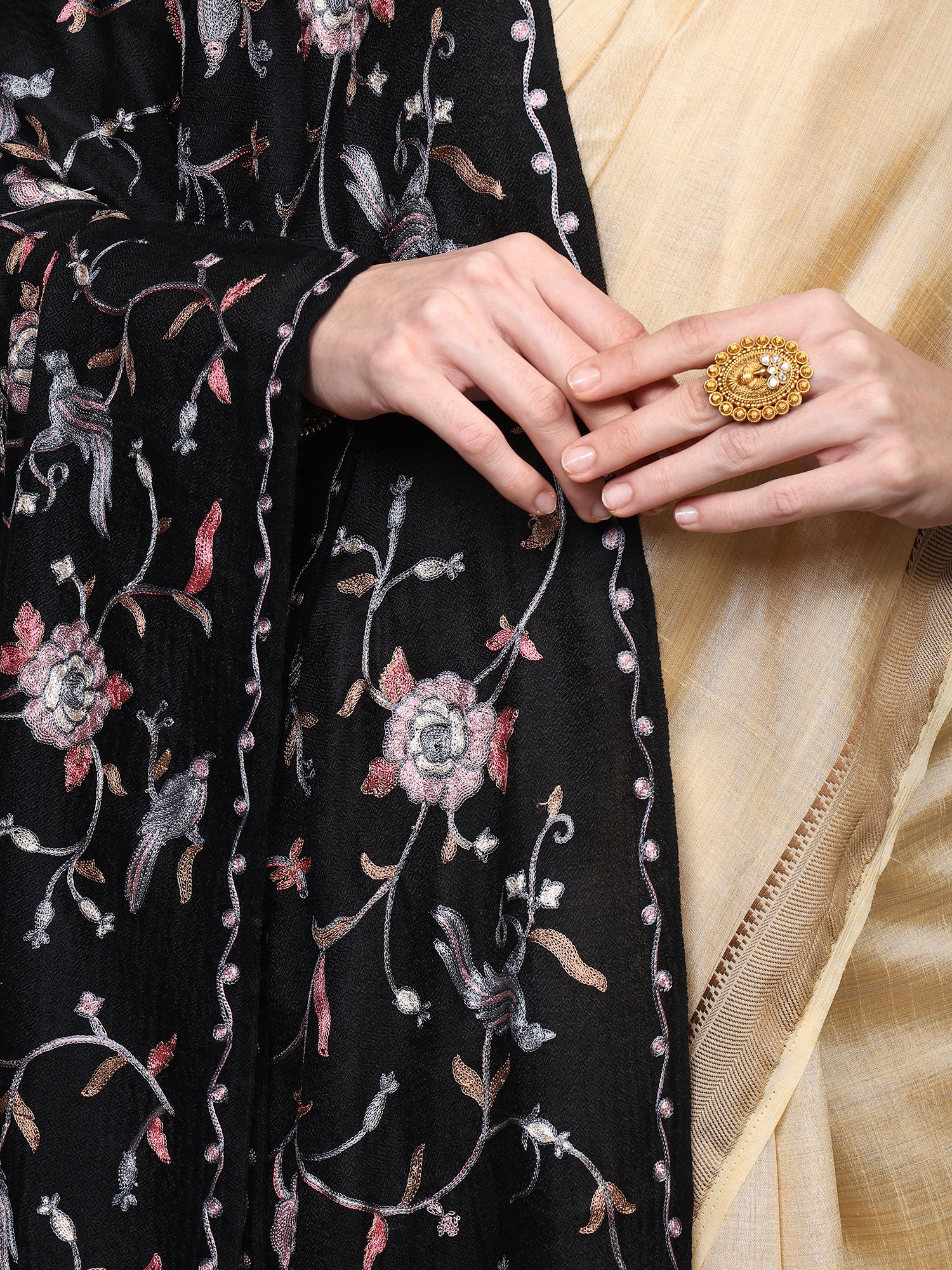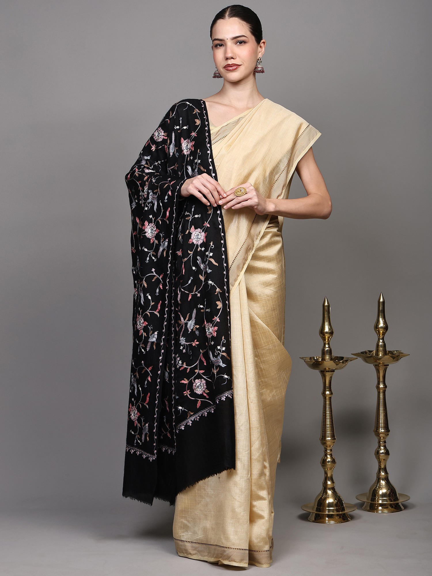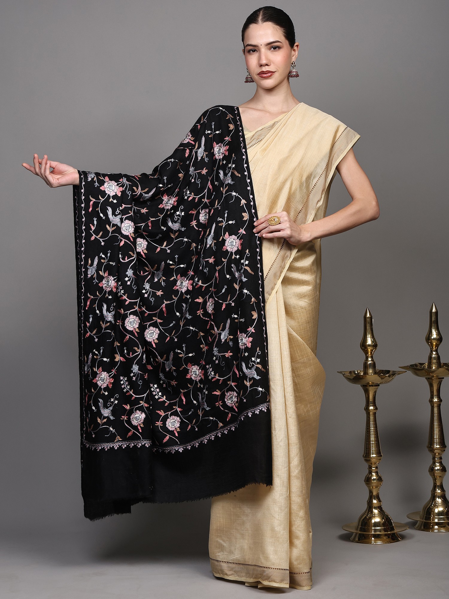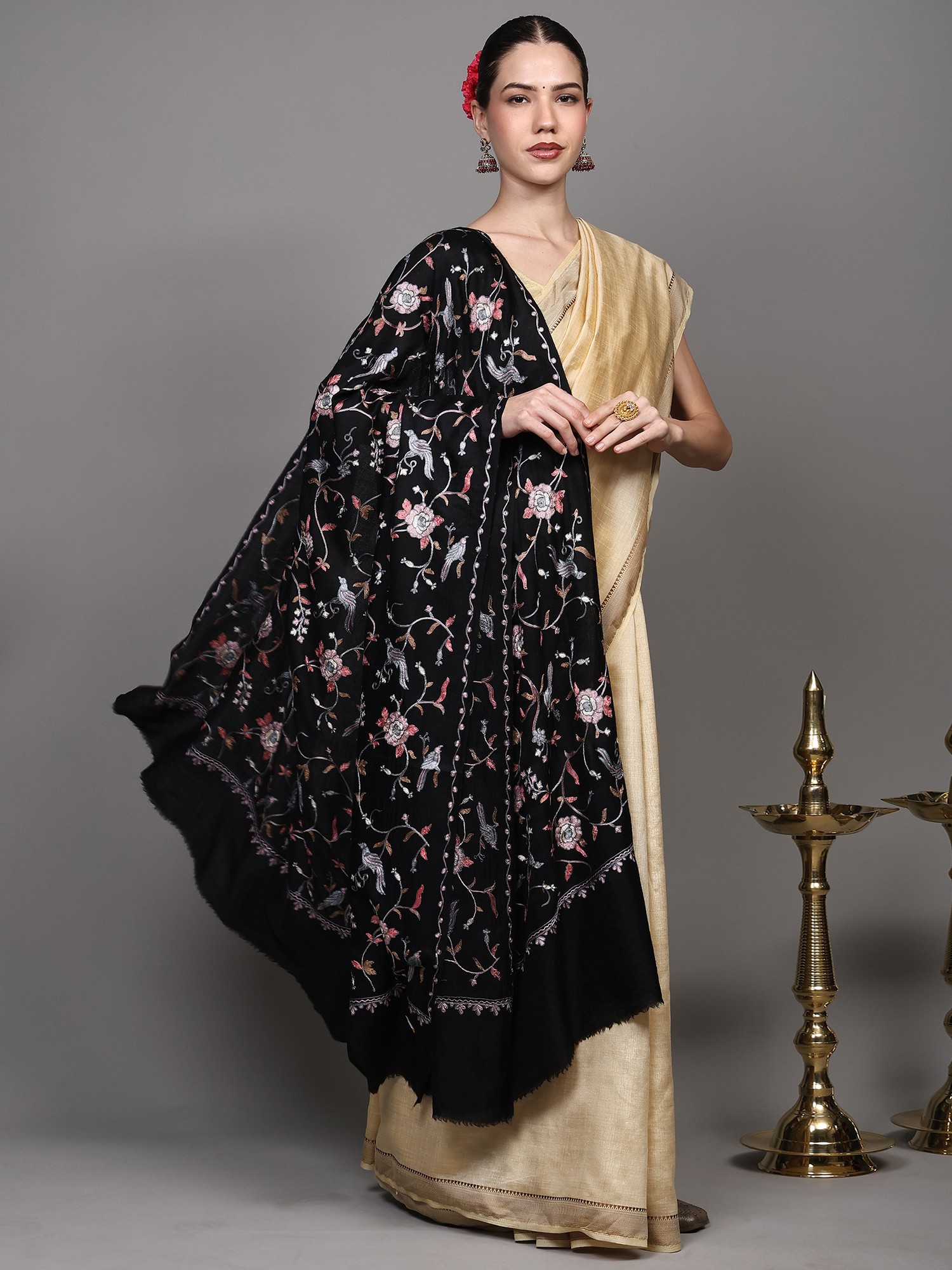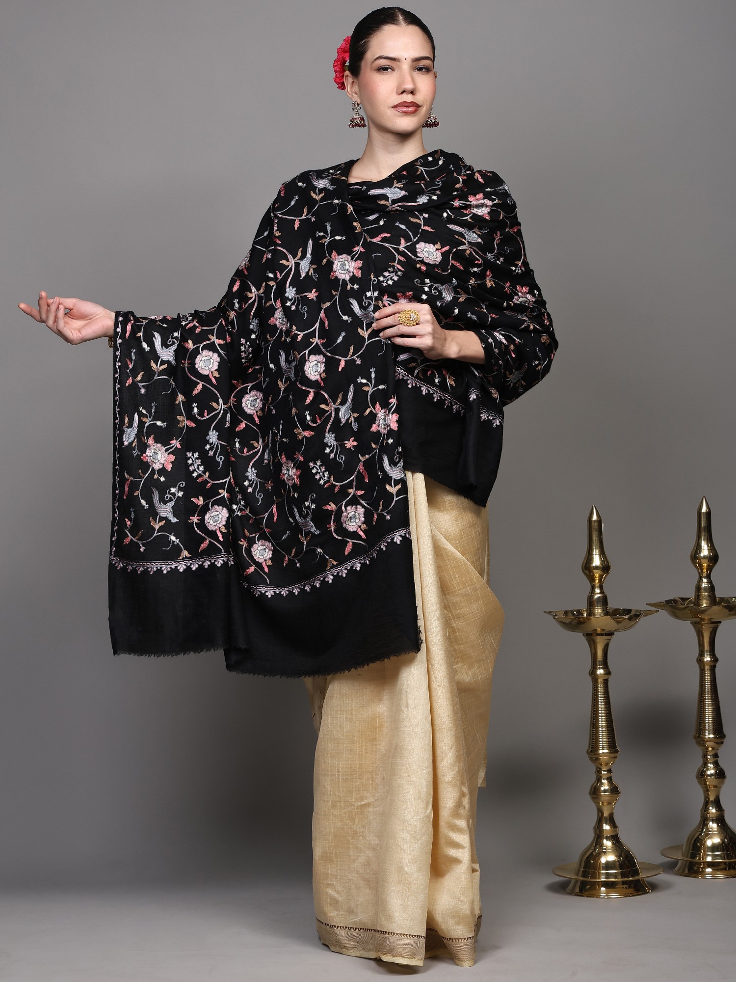 Adorn yourself with a masterpiece of traditional Indian artistry. This exquisite woolen shawl is a testament to the rich heritage of Amritsar, renowned for its intricate Aari embroidery. The deep black canvas of the shawl serves as the perfect backdrop for a vibrant and delicate dance of nature, meticulously brought to life by skilled artisans.