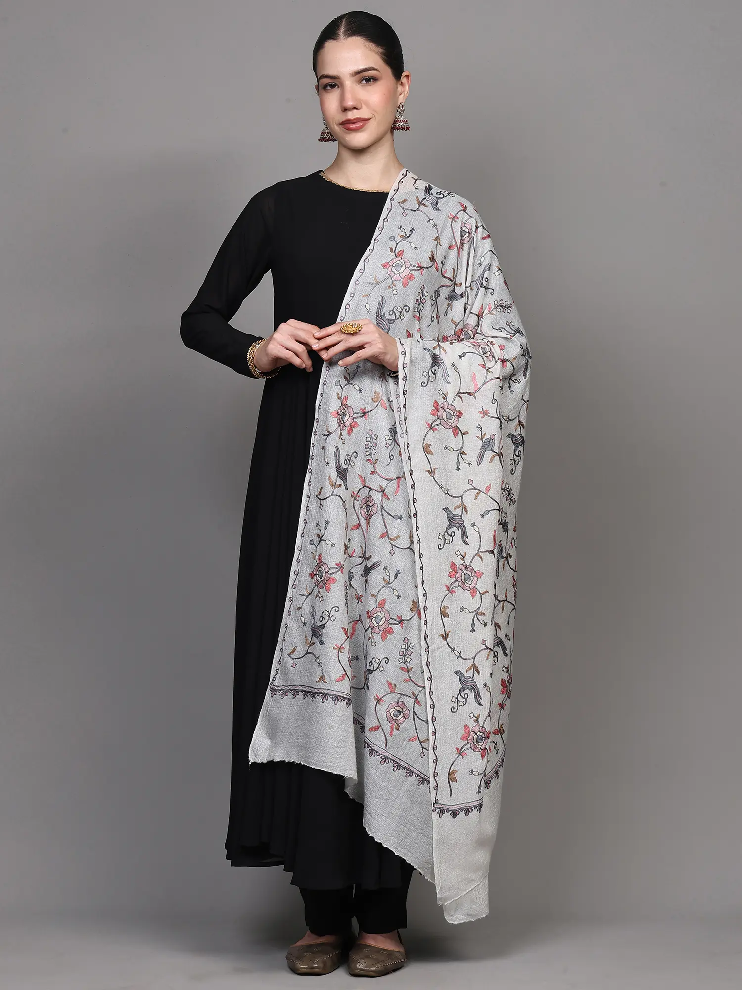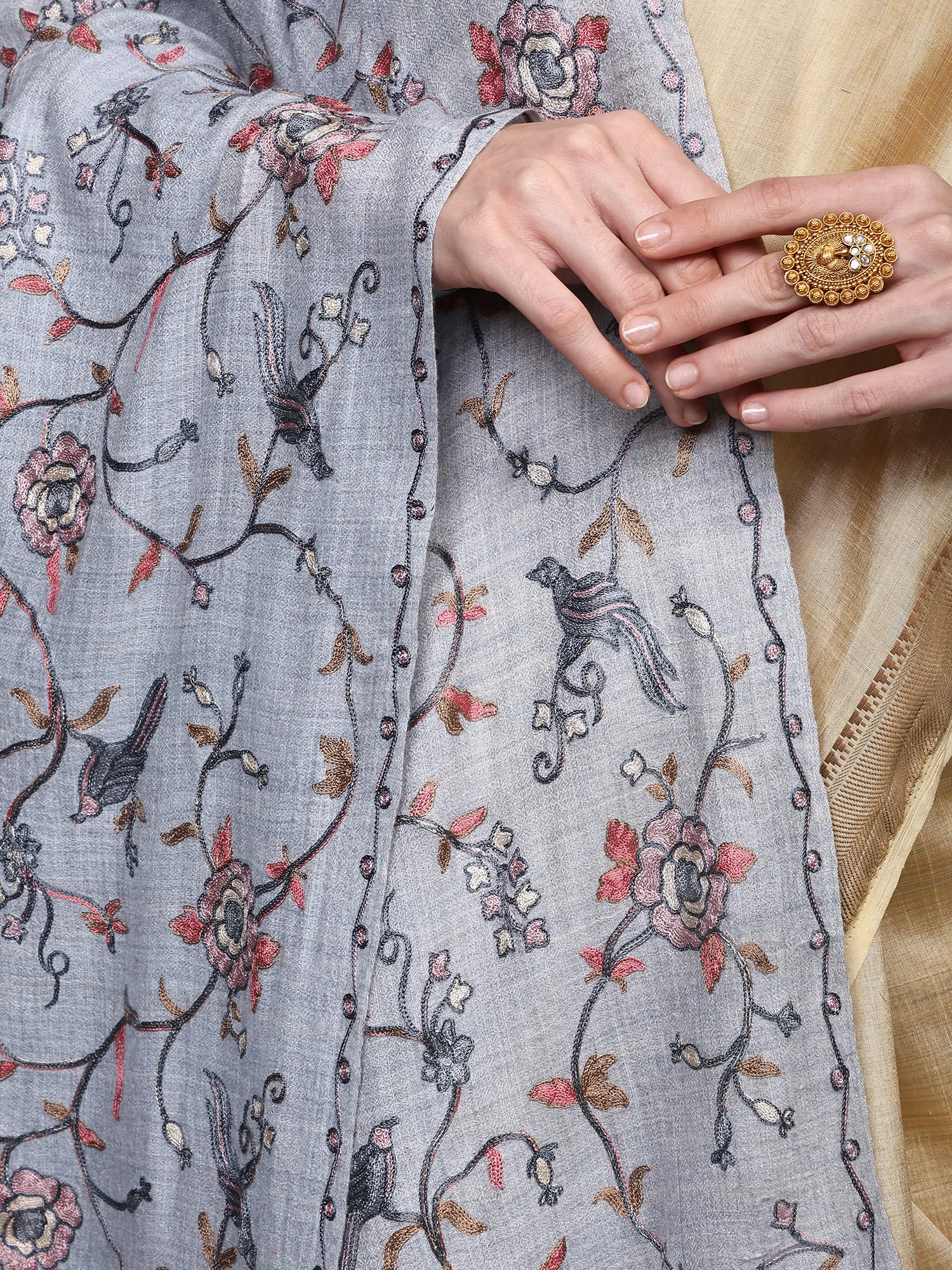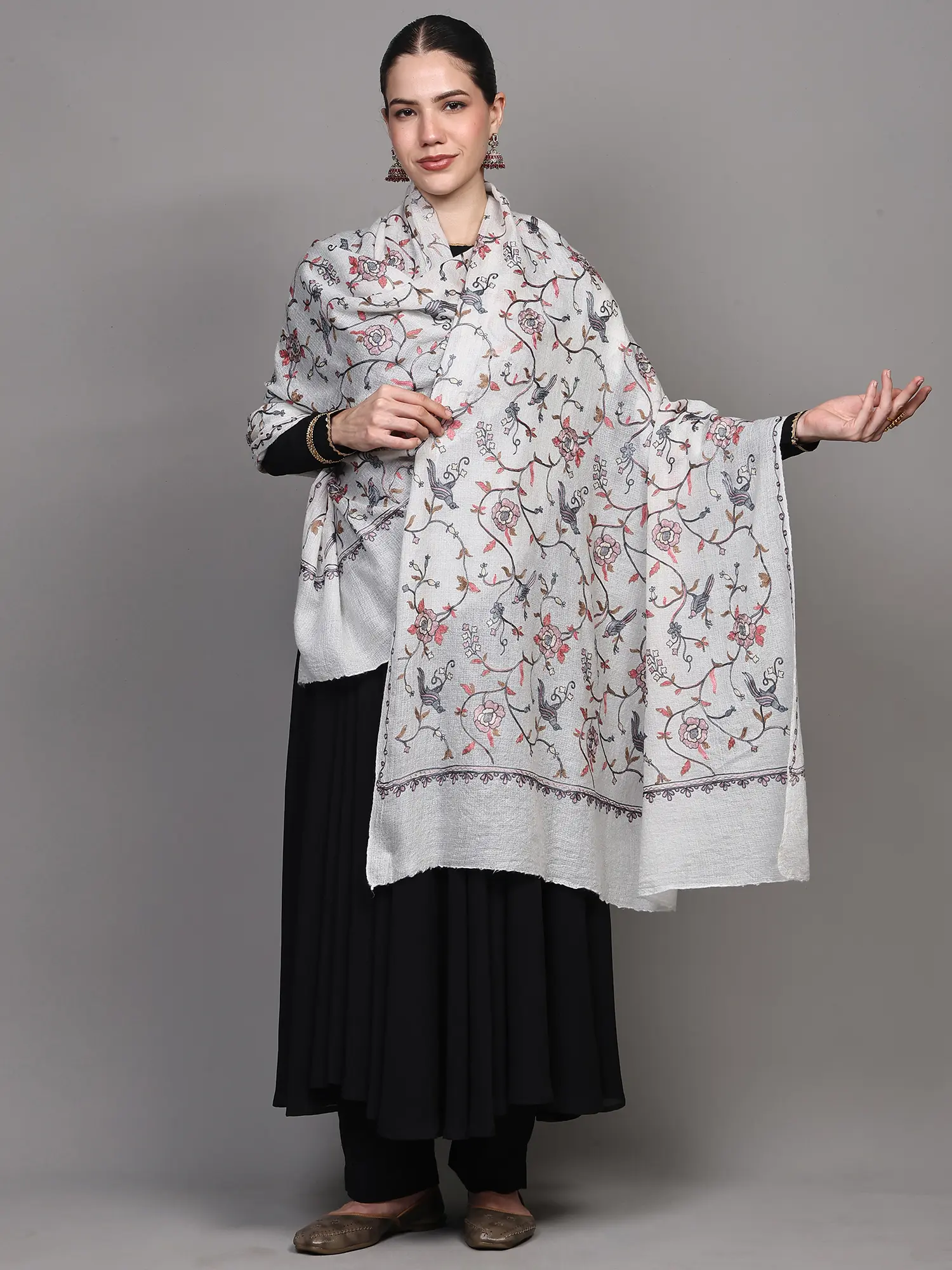 The surface of the shawl is adorned with a captivating motif of birds perched on whimsical tree branches. Delicate floral patterns bloom with an array of soft pinks, whites, and subtle greens, interwoven with the graceful forms of small birds. Each stitch of Aari embroidery is a testament to precision and dedication, creating a textured tapestry that is both visually stunning and luxuriously soft to the touch. The fine threads capture the light, adding a subtle shimmer to the overall design, making it a truly eye-catching accessory. The intricate detailing extends to the border, framing the elaborate design with a refined elegance.