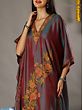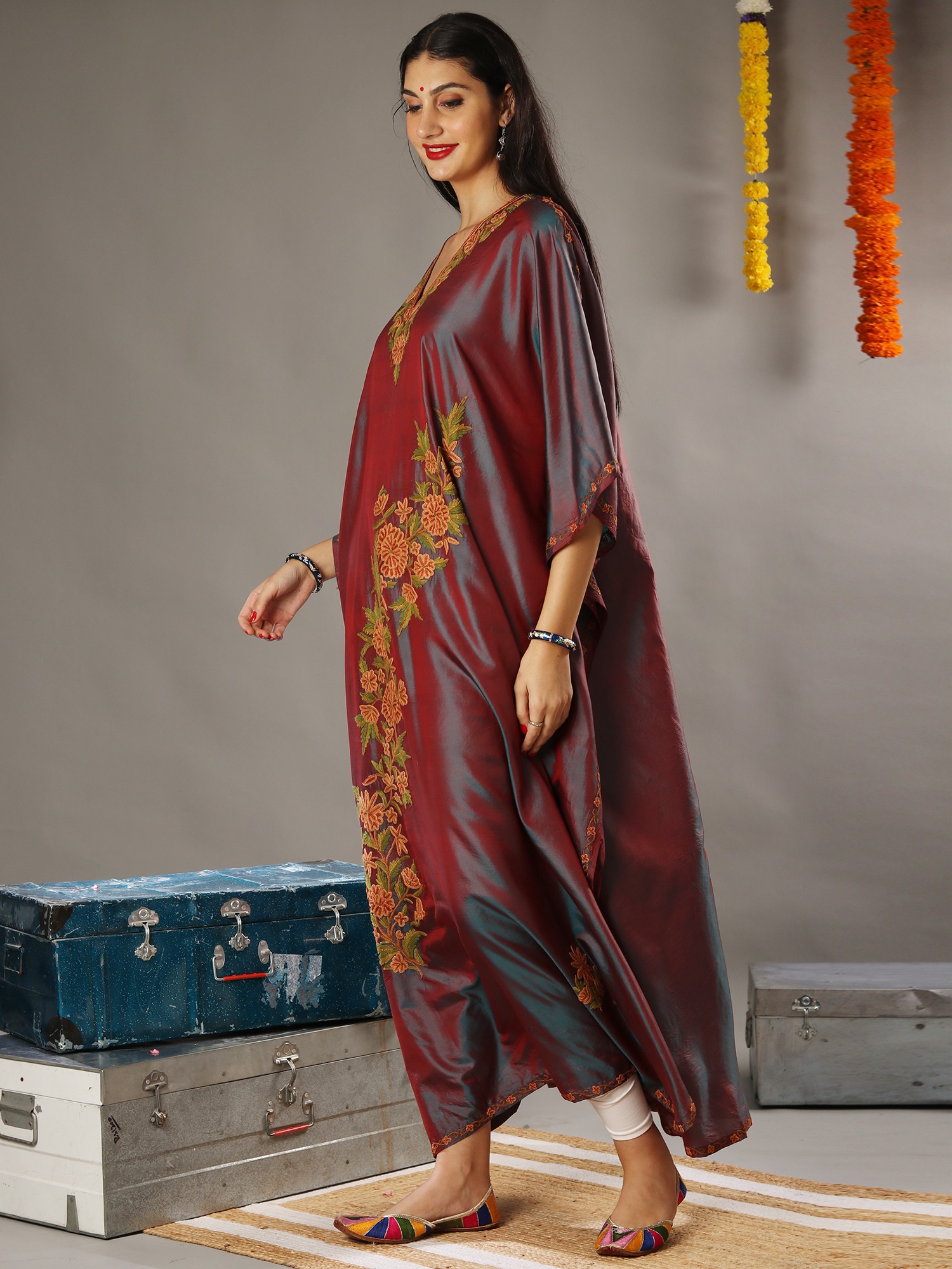 Aari Floral Embroidery Iridescent Satin Kaftan with Detailed Colorful Traditional Kashmiri Motifs