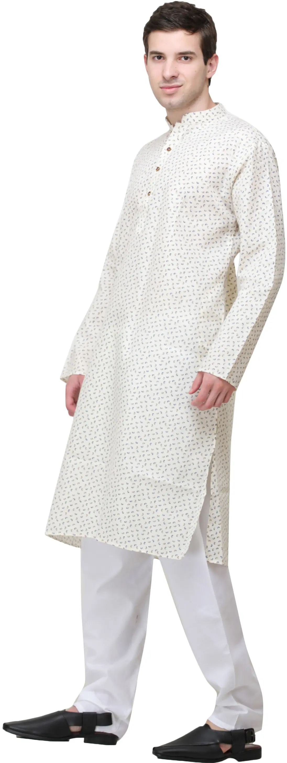 This “Kurta Pajama” is made of pure cotton and comes in a stunning Afterglow shade that enchants. The charm is in the beautiful printed paisleys dispersed throughout, which bring a sense of heritage to modern casual wear. The airy fabric is excellent for casual events and provides maximum comfort.