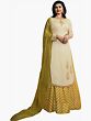 The kameez is paired with a striking long skirt, designed with a vibrant yellow and white chevron pattern. This bold yet sophisticated pattern adds a dynamic contrast to the understated elegance of the kameez, creating a truly eye-catching outfit. The skirt is cut to create a graceful flow, moving beautifully with every step. Completing this magnificent ensemble is a chiffon dupatta in a soft, olive green hue. The dupatta is generously sized and beautifully finished with scattered gold glitter and delicate embroidery, mirroring the motifs found on the kameez. The sheer transparency of the chiffon adds an ethereal quality, allowing the embellished patterns to subtly peek through, enhancing the overall allure of the outfit.