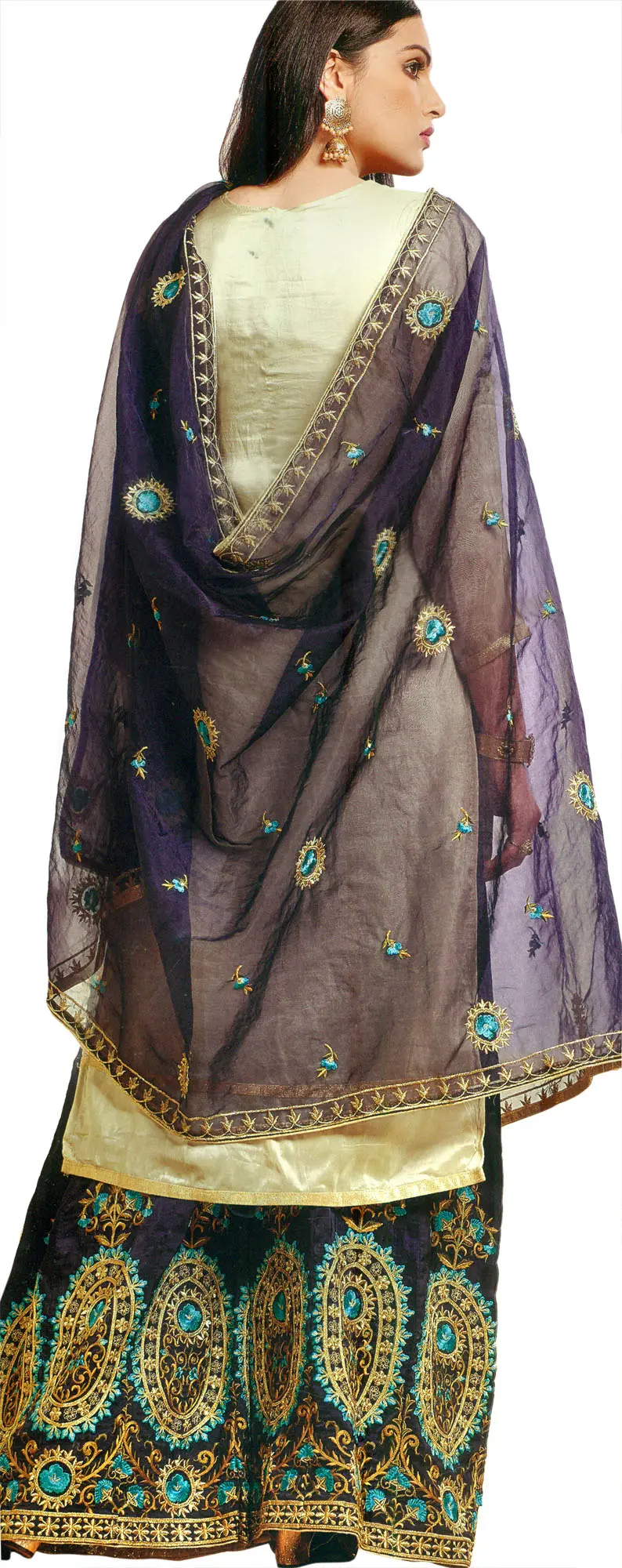 The Agate-Gray palazzo salwar kameez suit epitomizes elegance with its refined design. The agate-gray hue lends a sense of sophistication, perfectly complemented by intricate embroidery adorning the suit. The palazzo pants add a contemporary twist to the traditional ensemble, ensuring it is elevated further with a stunning blue net dupatta, completing the look gracefully. This outfit is a harmonious blend of traditional craftsmanship and modern aesthetics, making it an ideal choice for those seeking a tasteful and refined ethnic attire that stands out in any cultural or celebratory setting.