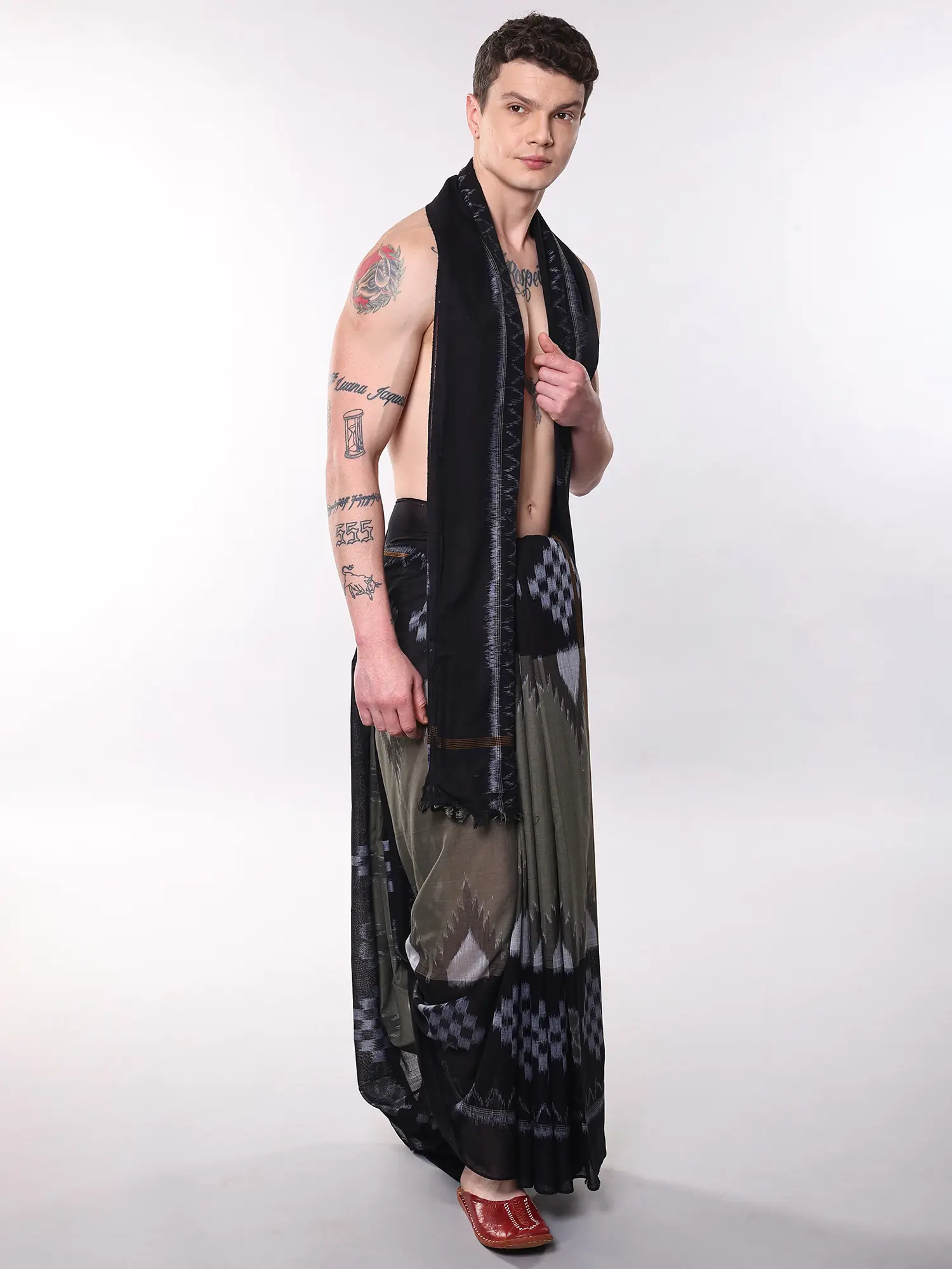 Experience the refined drape and intricate artistry of a garment that speaks to tradition and contemporary style. This ensemble is designed to offer unparalleled comfort and a distinguished presence, perfect for moments of quiet contemplation or grand celebration. You'll find yourself drawn to its understated luxury and the way it moves with you.