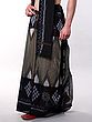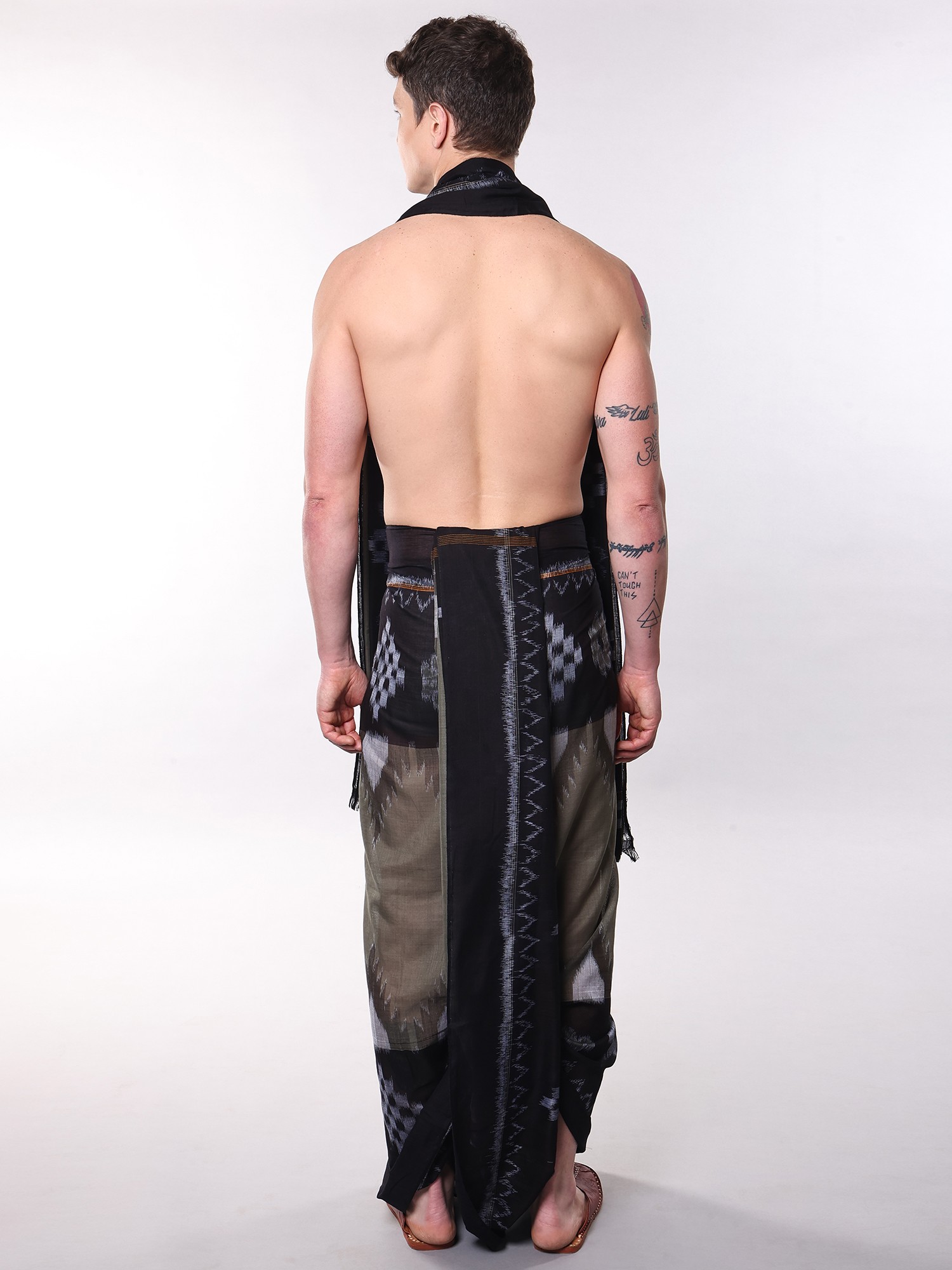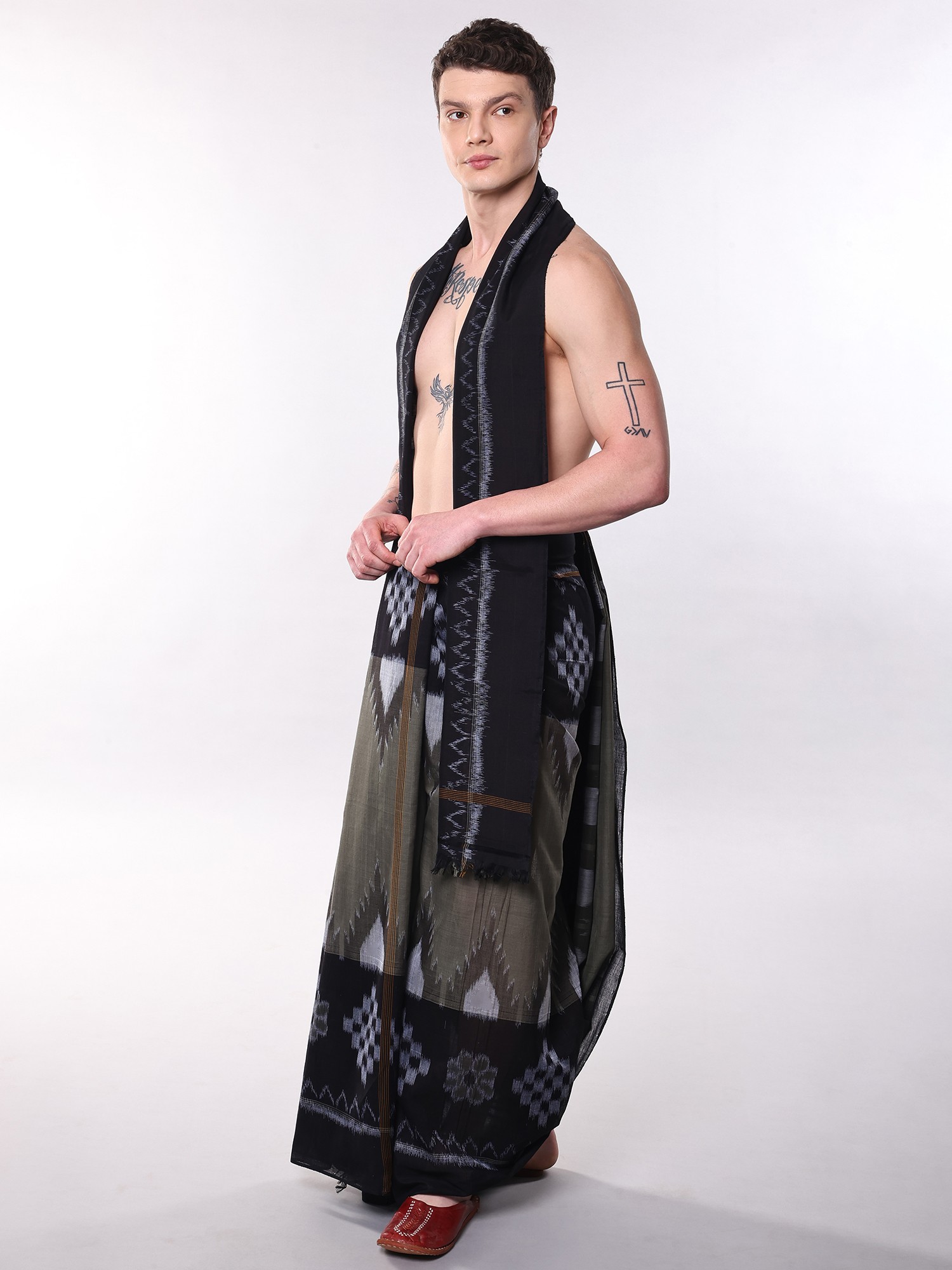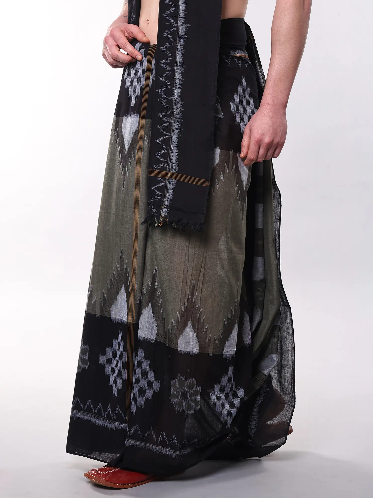 The rich agave-green hue of the dhoti provides a sophisticated foundation, adorned with a captivating Ikat pattern that showcases a harmonious blend of earthy tones and charcoal grey. Complementing this is the accompanying Angavastram, which features a striking contrast black temple border. This border, intricately designed with subtle grey accents, adds a touch of regal grandeur, while the fringed edges lend a touch of playful sophistication to the overall silhouette.