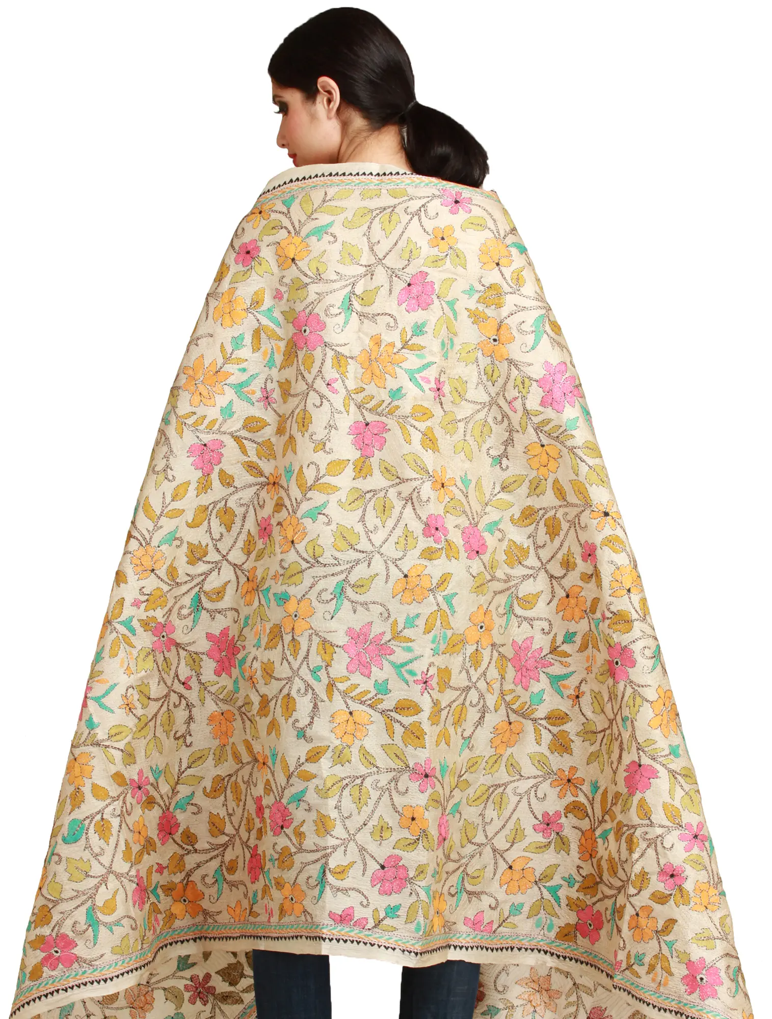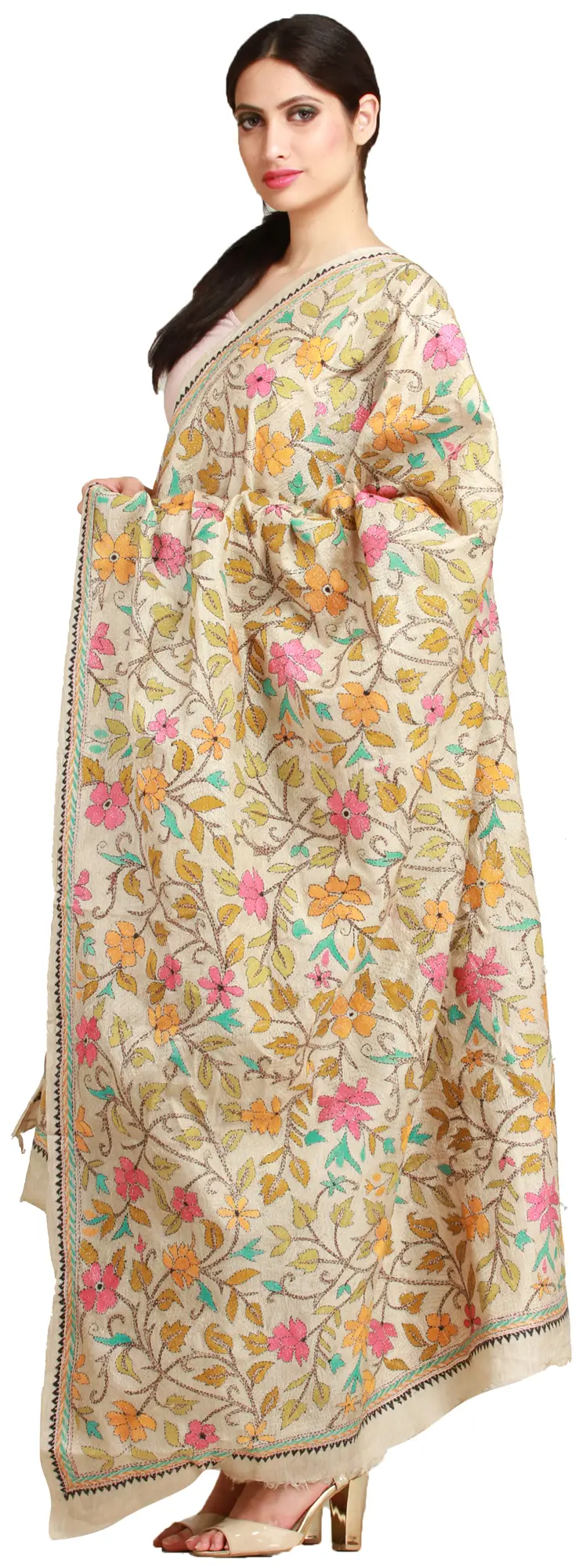 Experience the artistry of Kolkata with this exquisite pure silk dupatta, a masterpiece of traditional Kantha embroidery. The soft, creamy silk forms the canvas for a vibrant tapestry of hand-embroidered foliage. Delicate floral motifs, rendered in cheerful hues of pink, orange, and yellow, are interwoven with a network of verdant leaves and stems, creating a breathtaking display of natural beauty. Each stitch tells a story, a testament to the skill and dedication of the artisans who brought this piece to life. The intricate detail of the embroidery, from the delicate petals of the flowers to the flowing lines of the leaves, is truly captivating.