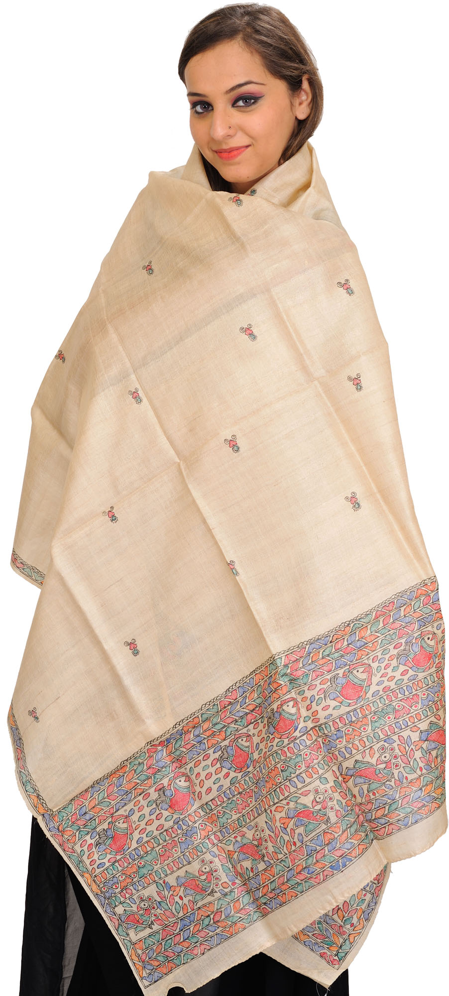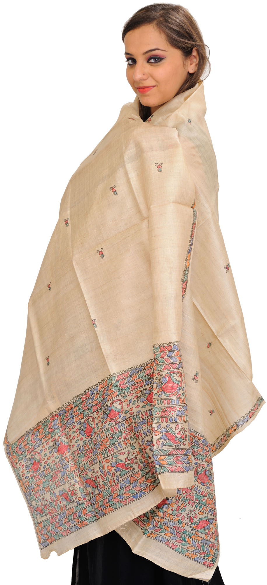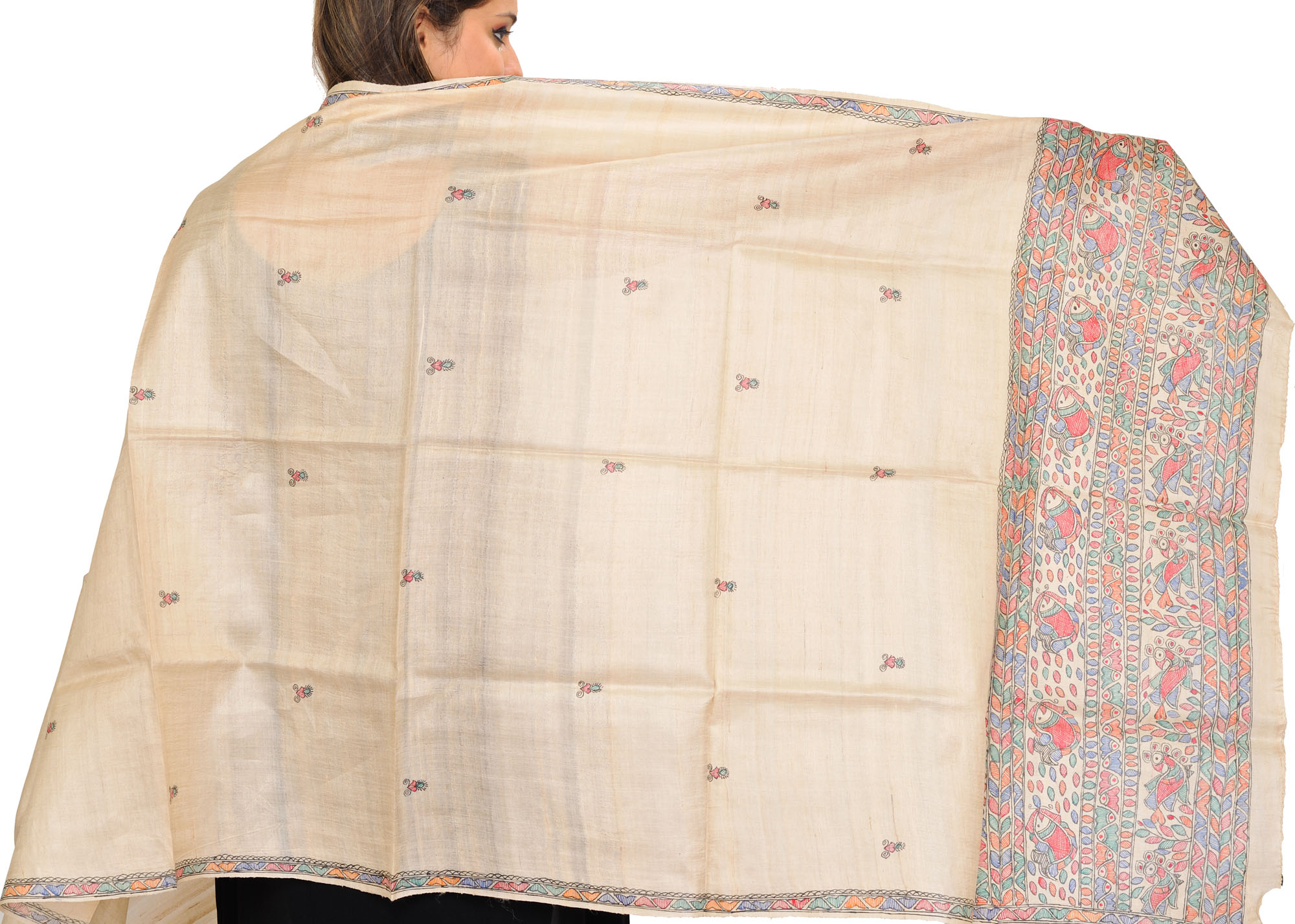Alabaster-Gleam Madhubani Hand-Painted Dupatta from Bihar with Bootis