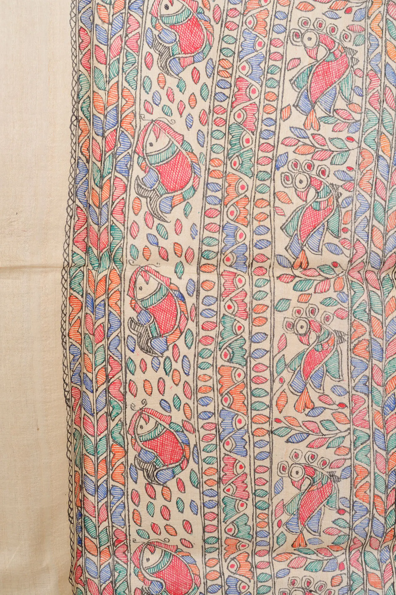 Madhubani Art Dupatta with Printed Marriage Procession and Fishes