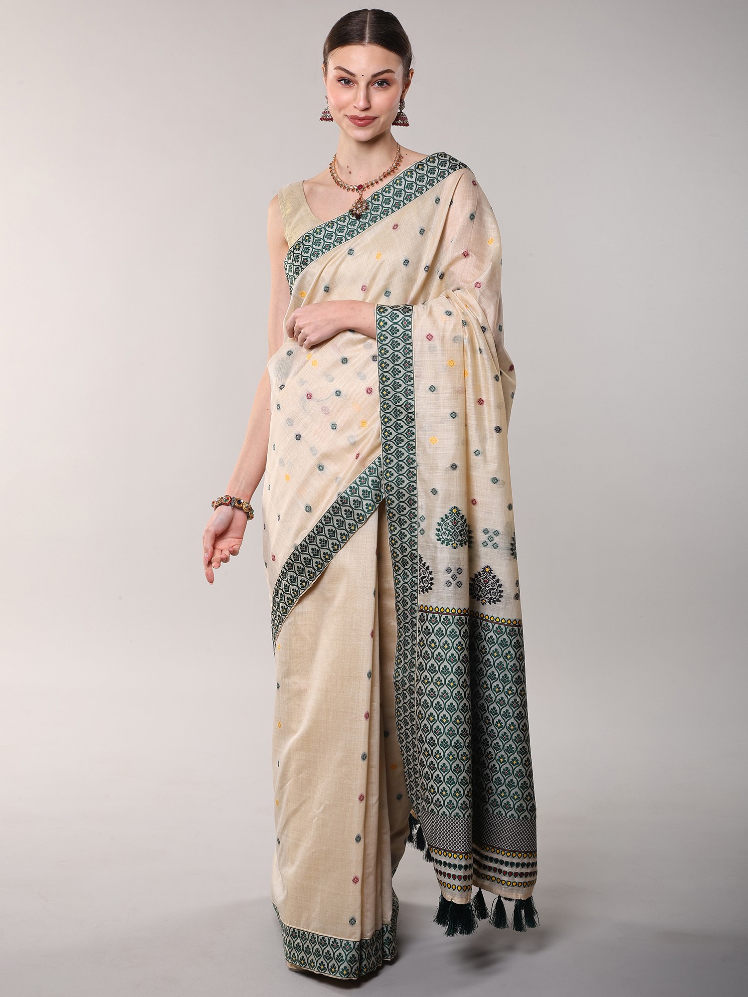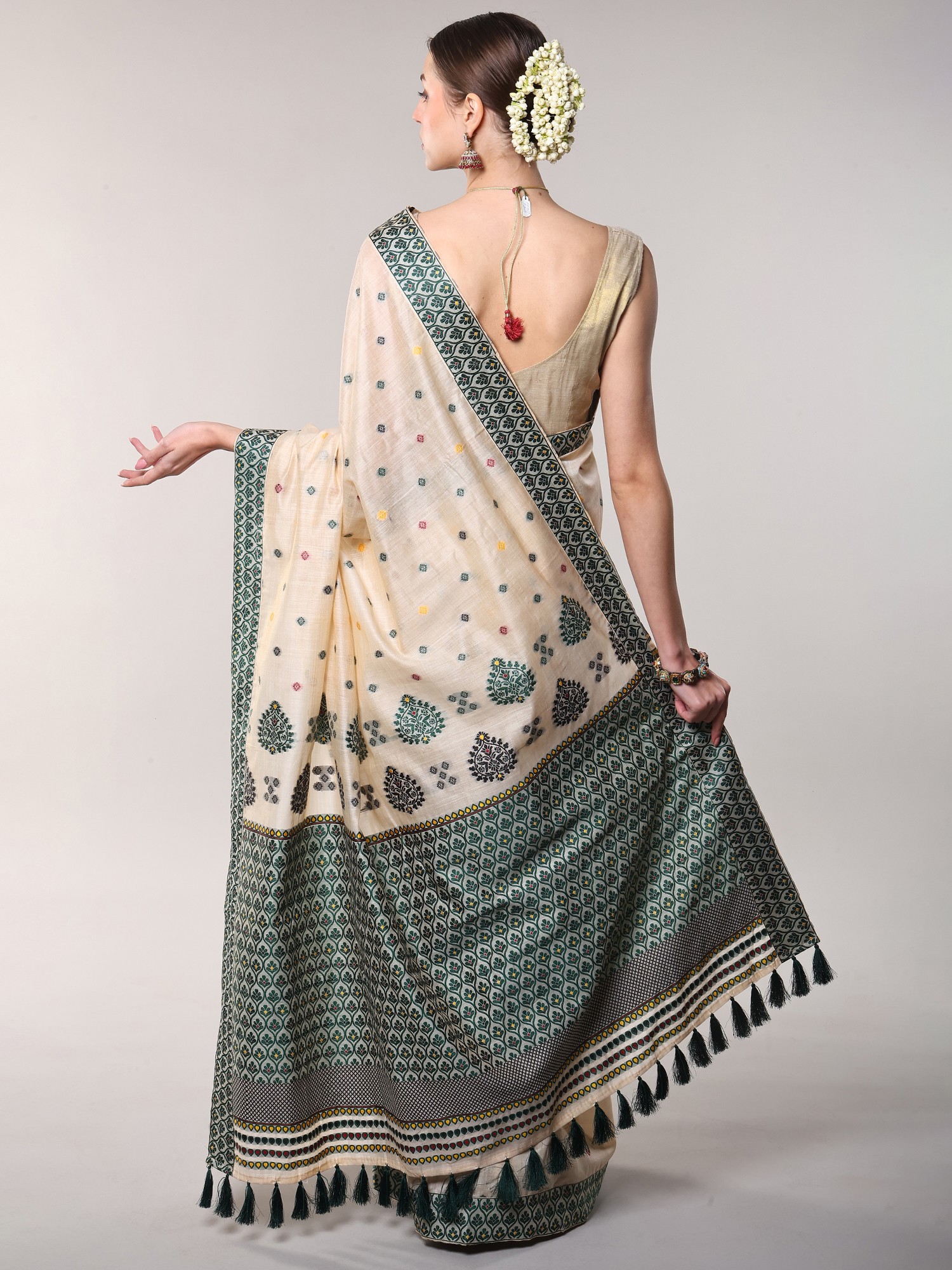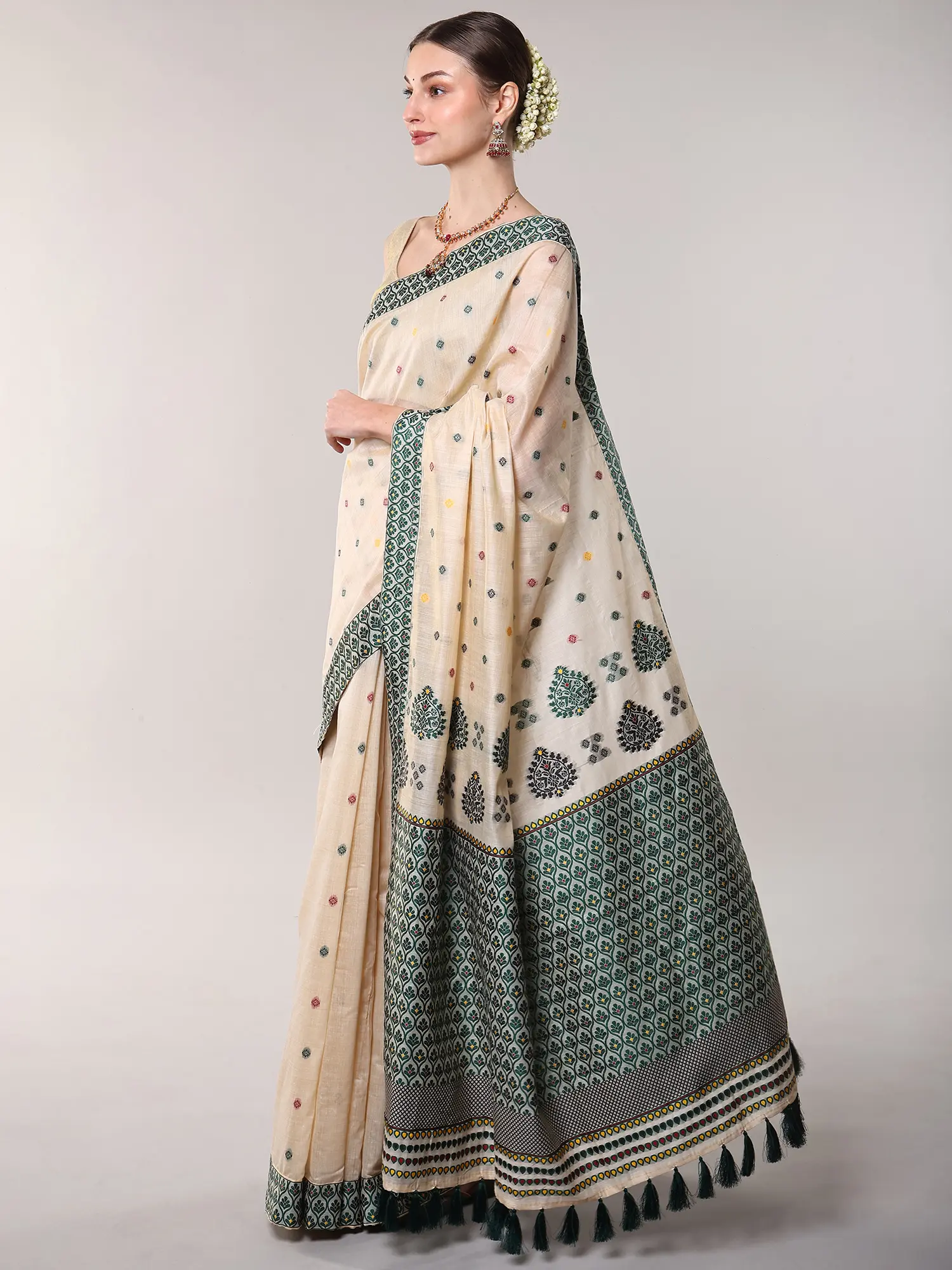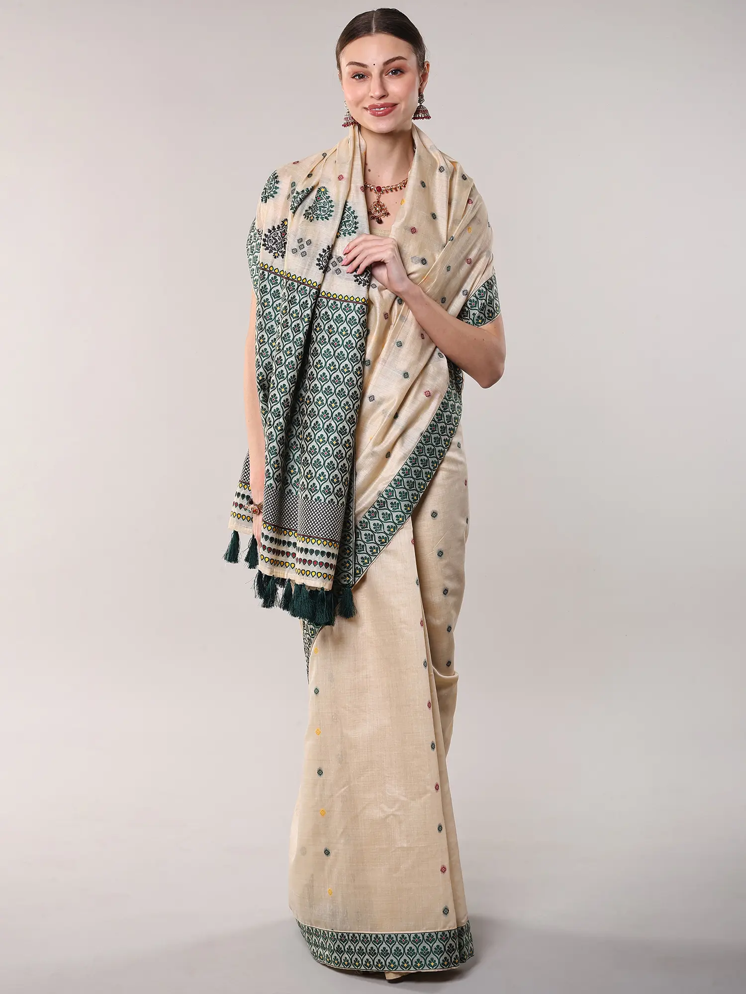 Alabaster-Gleam Pure Cotton Bootis woven Saree with Tassels Border from Assam