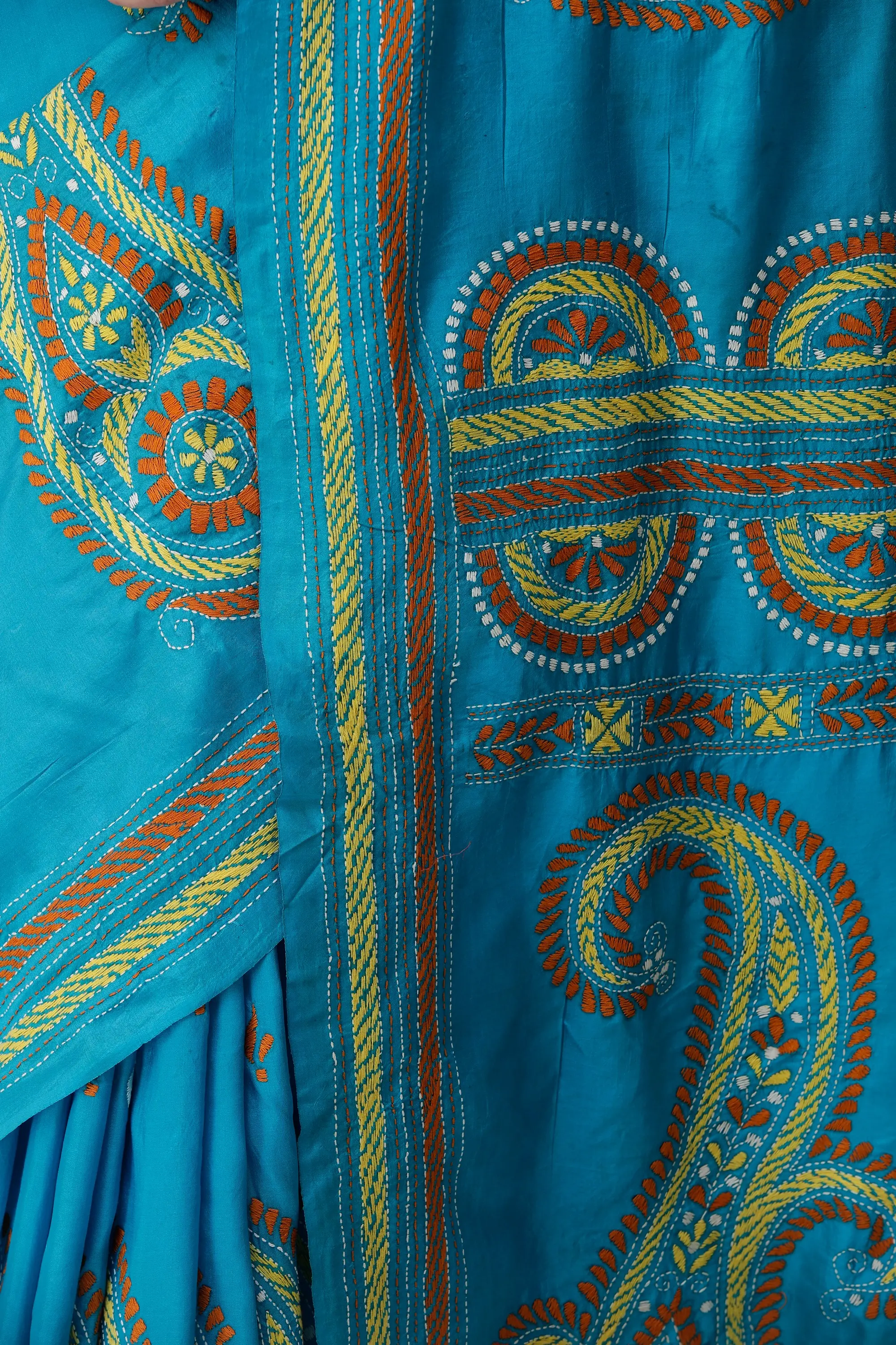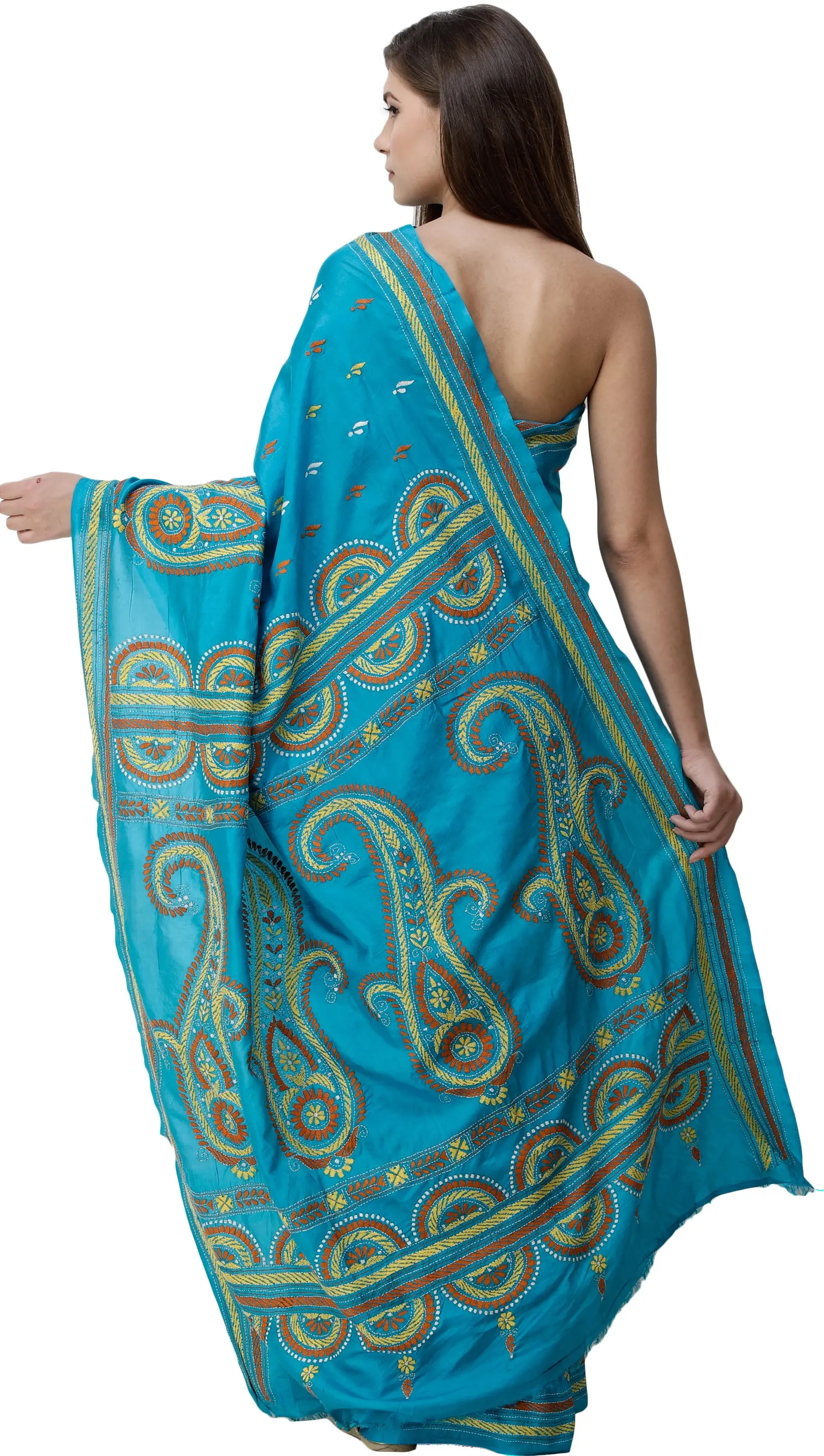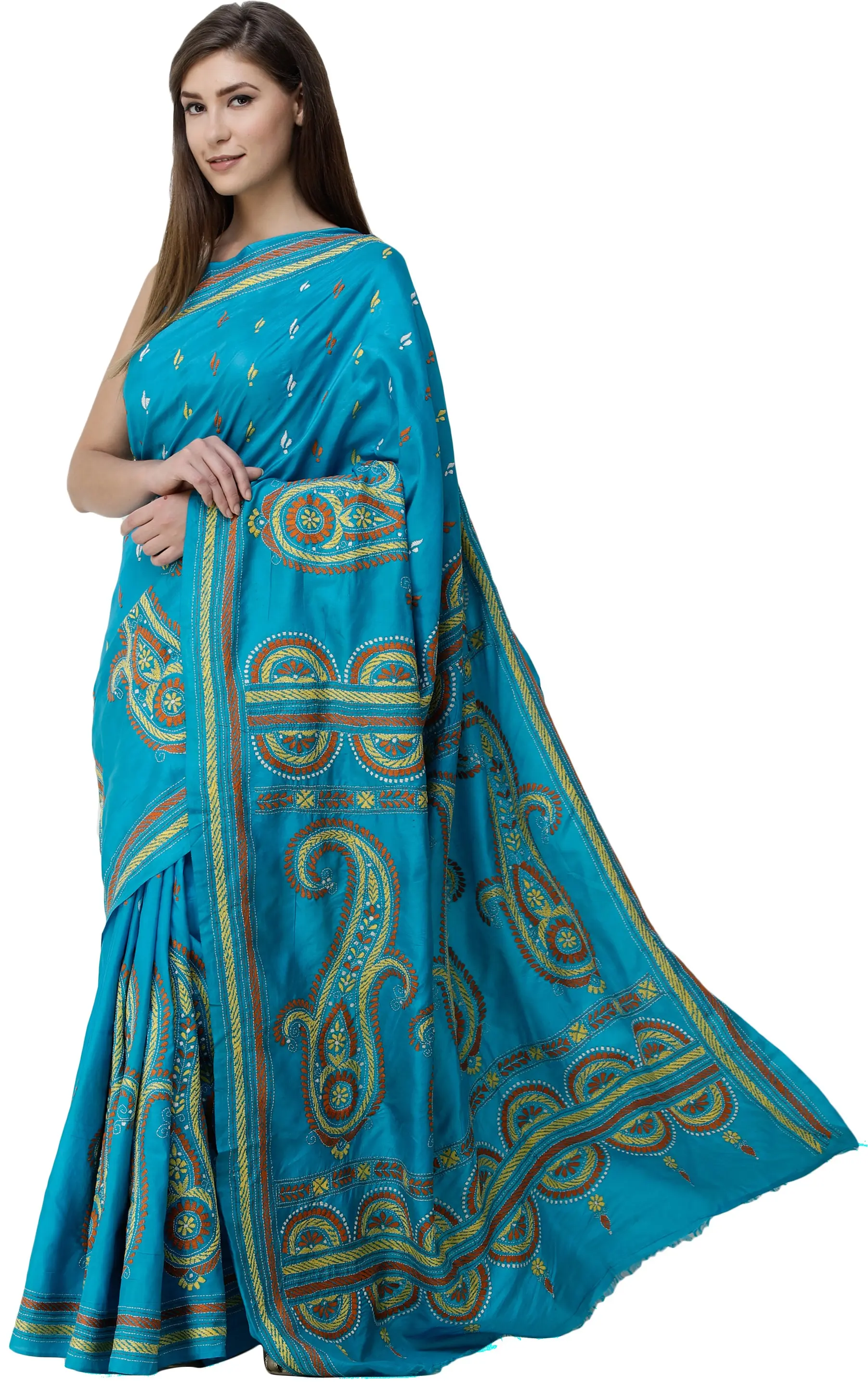 The Algiers-Blue Sari from Kolkata is a masterpiece of artistry and tradition. Its silken canvas is meticulously adorned with Kantha-embroidered giant paisleys, creating a captivating contrast between the subtlety of the delicate silk and the intricacy of the stitched motifs. Tiny motifs grace the body, offering understated elegance, while eye-catching patterns on the pallu add a dramatic flourish. This saree epitomizes timeless attire, where every stitch tells a story of heritage and craftsmanship. When draped, it's not just a garment; it's a living testament to the rich cultural tapestry of Bengal, blending subtlety and exquisiteness with timeless grace.