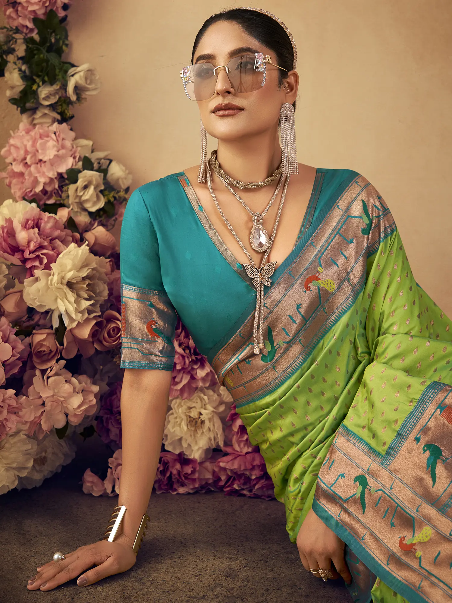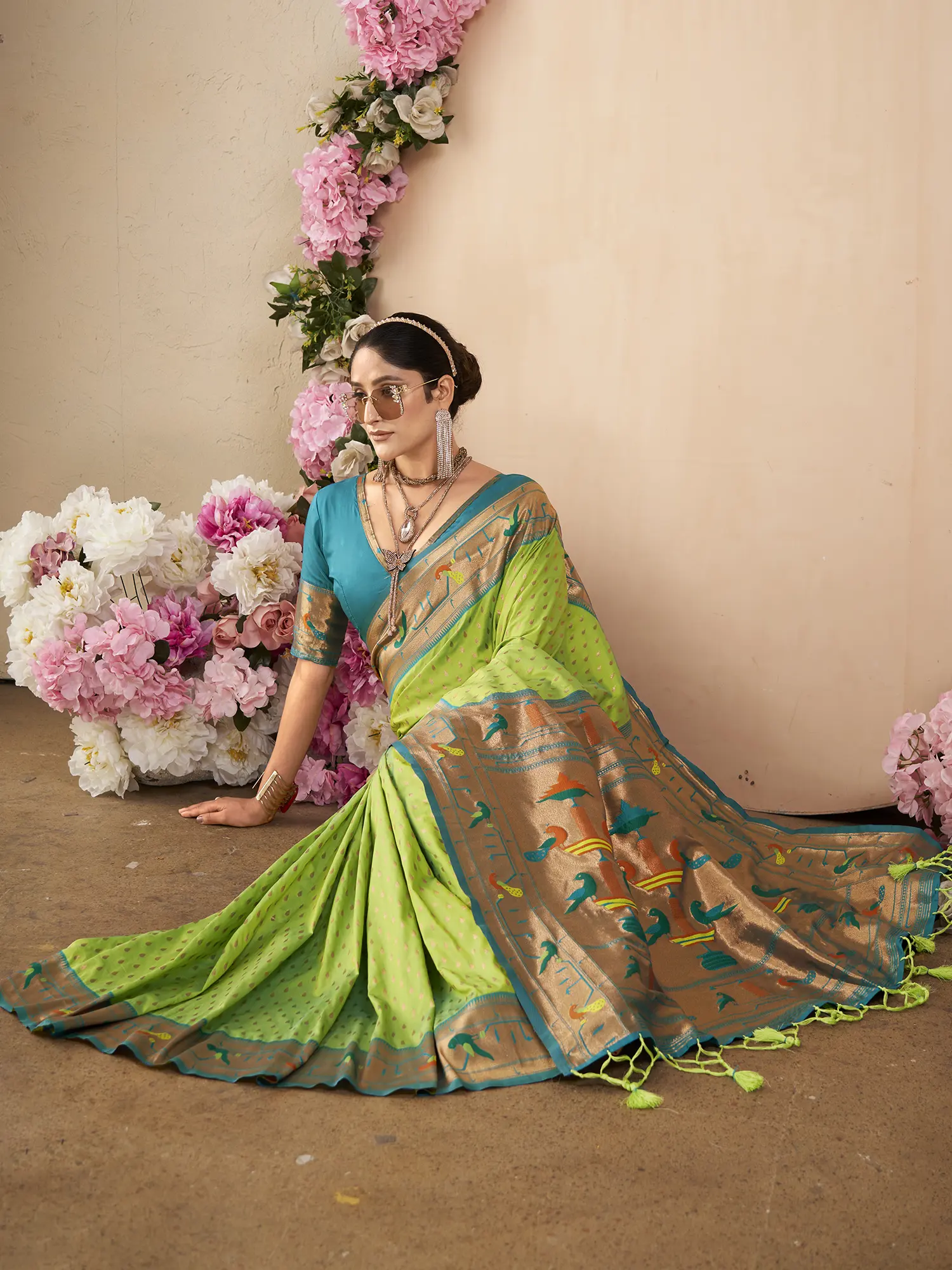 Immerse yourself in the exquisite artistry of this Paithani silk saree, a testament to India's rich weaving heritage. The vibrant lime green hue, punctuated by a delicate all-over
