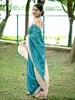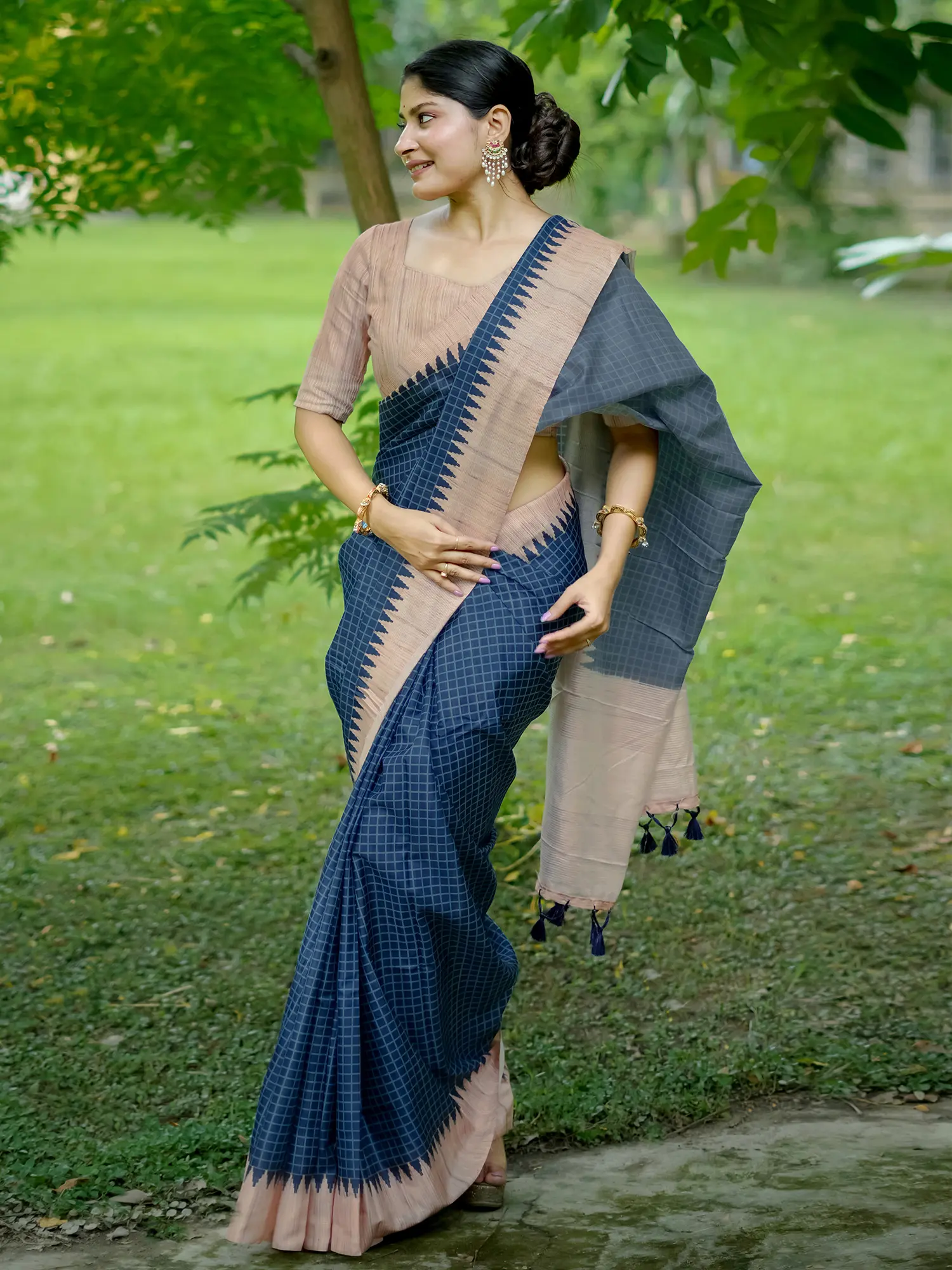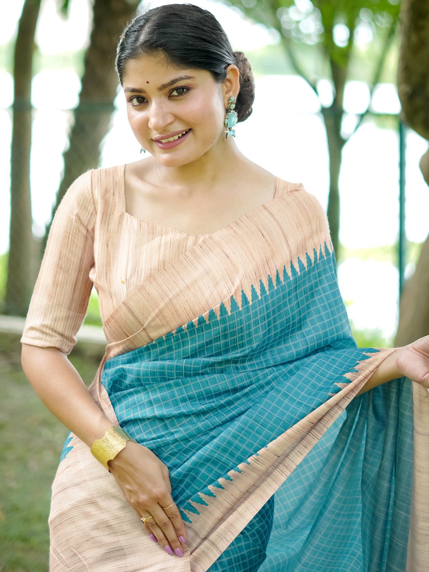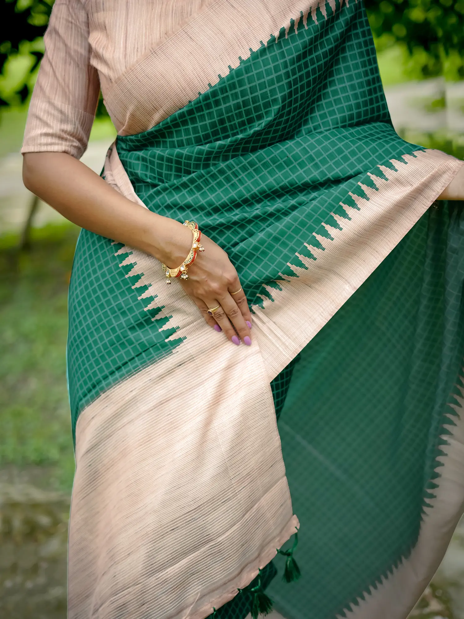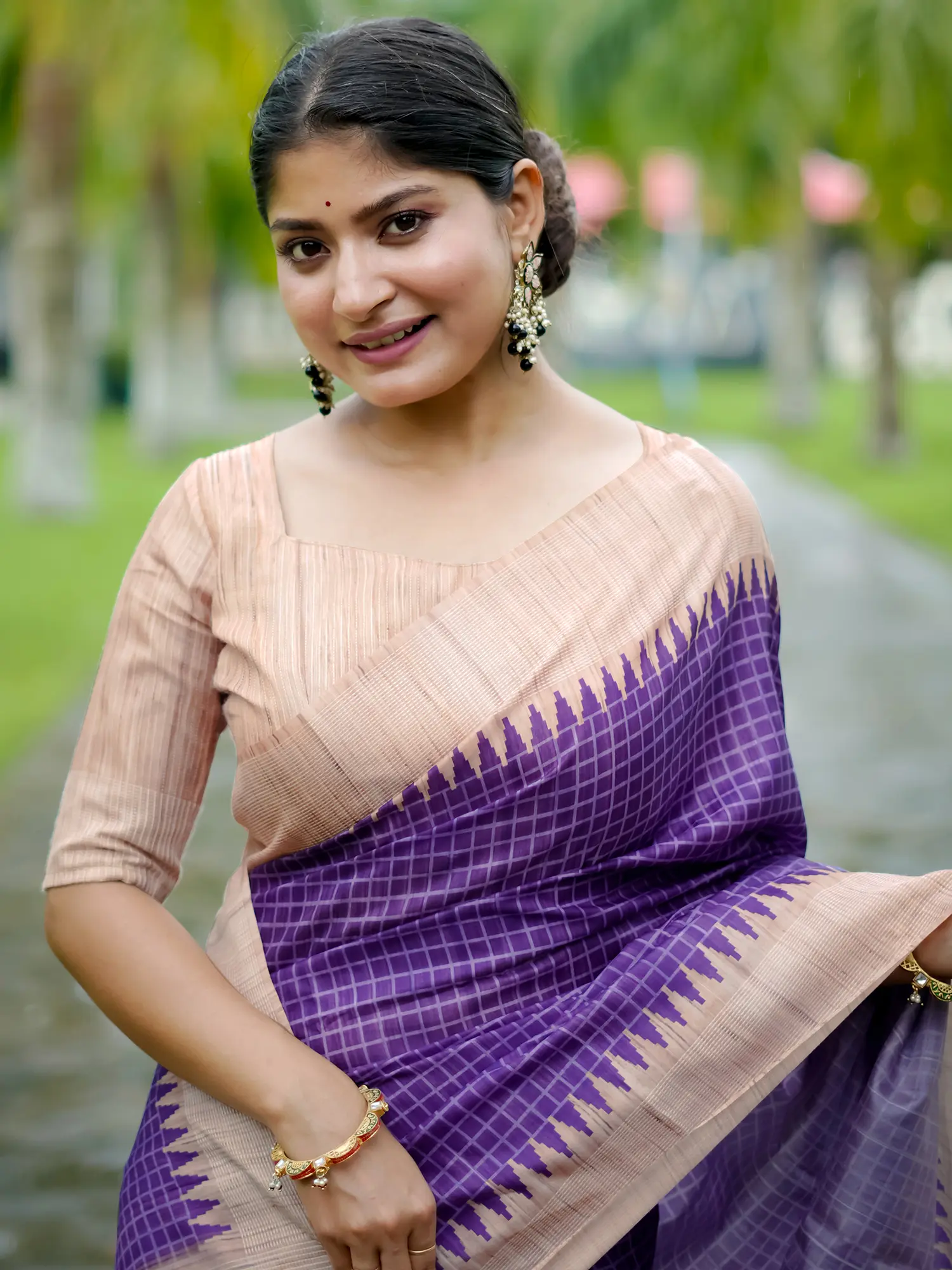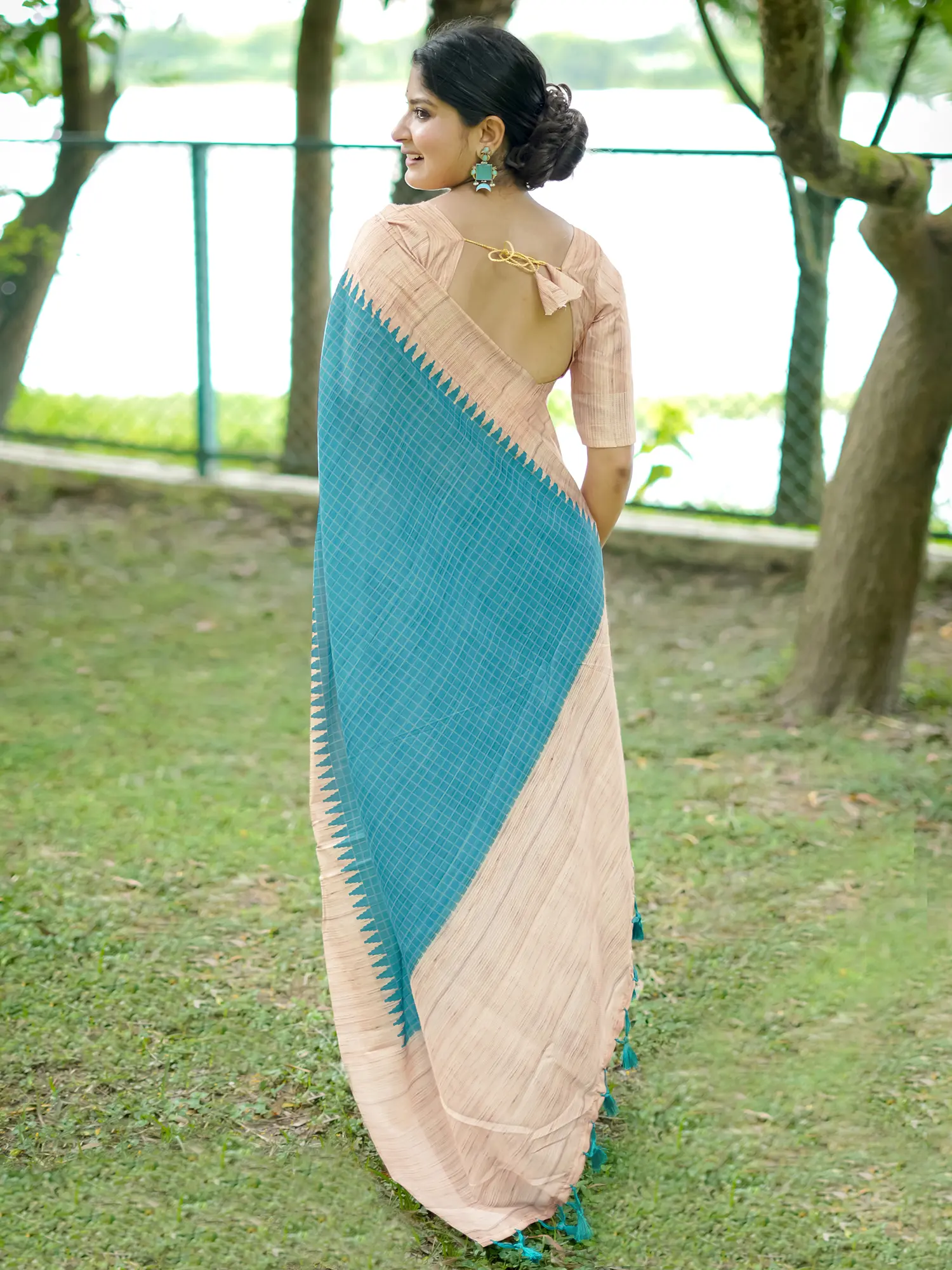 Tri-Color Pure Cotton Sambalpuri Handloom Saree from Odisha with Woven Ikat Patterns and Temple Border
