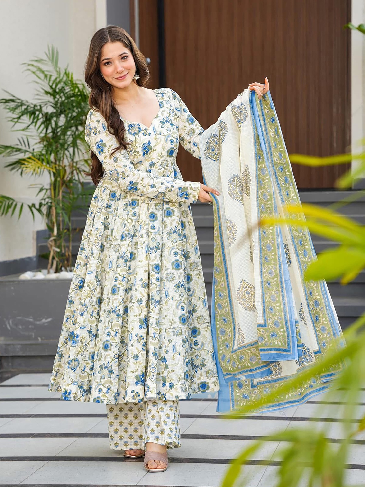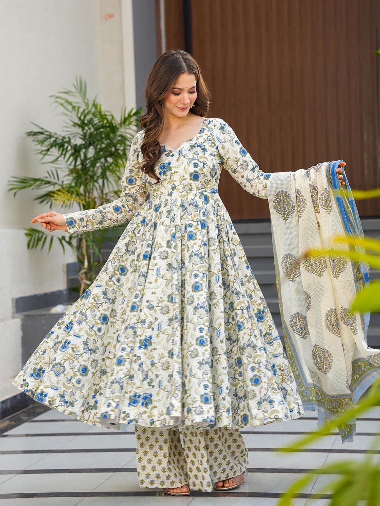 Step into a world of timeless grace with this exquisitely designed Anarkali suit set. This three-piece ensemble is the perfect blend of traditional charm and contemporary style, ideal for those who appreciate intricate detailing and luxurious comfort. The flowing silhouette and delicate floral print make it a standout choice for any special occasion or festive gathering.