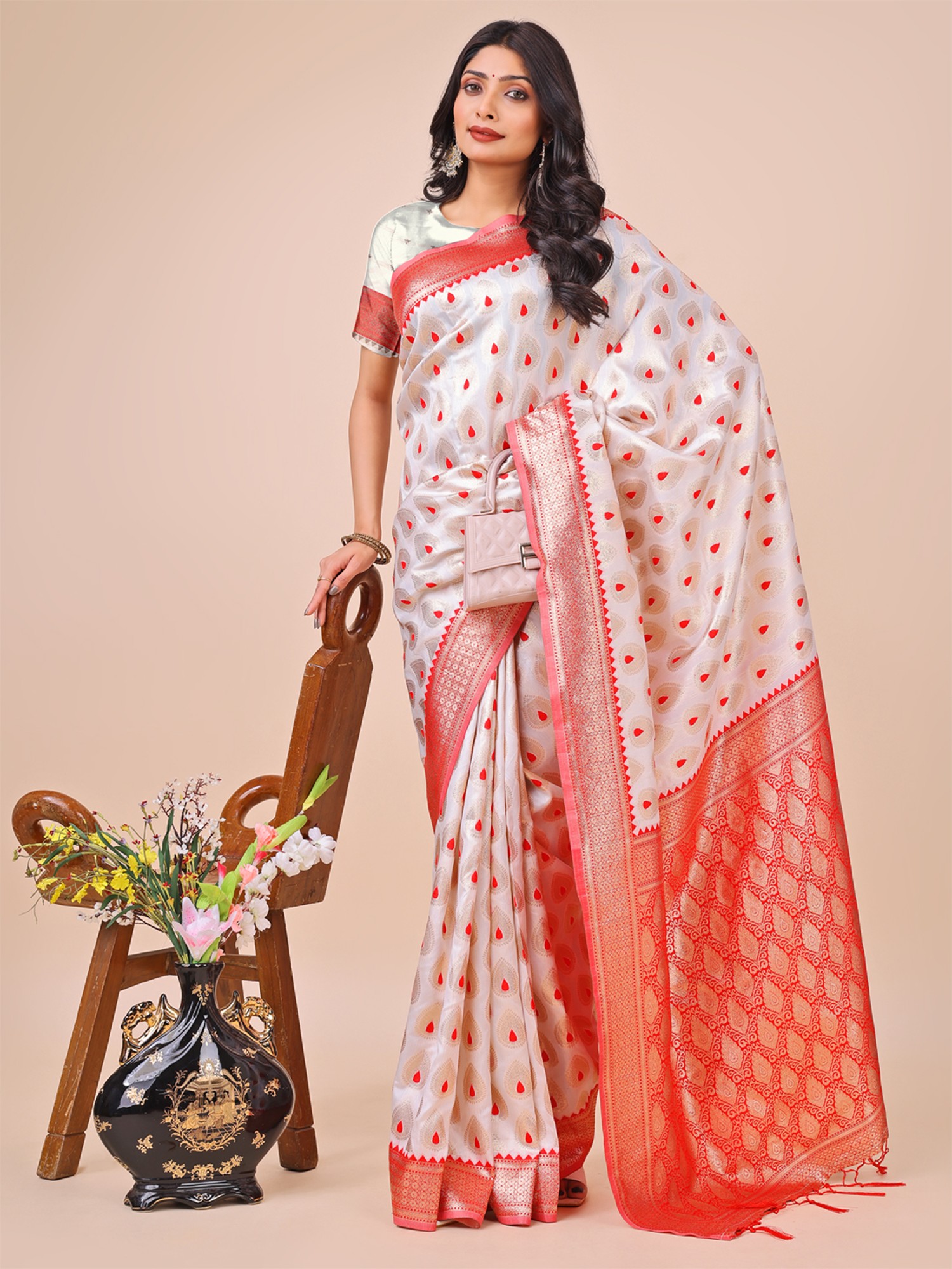 Banarasi Saree with All-over Zari Woven Bootis and Floral Vine Contrast Border-Pallu