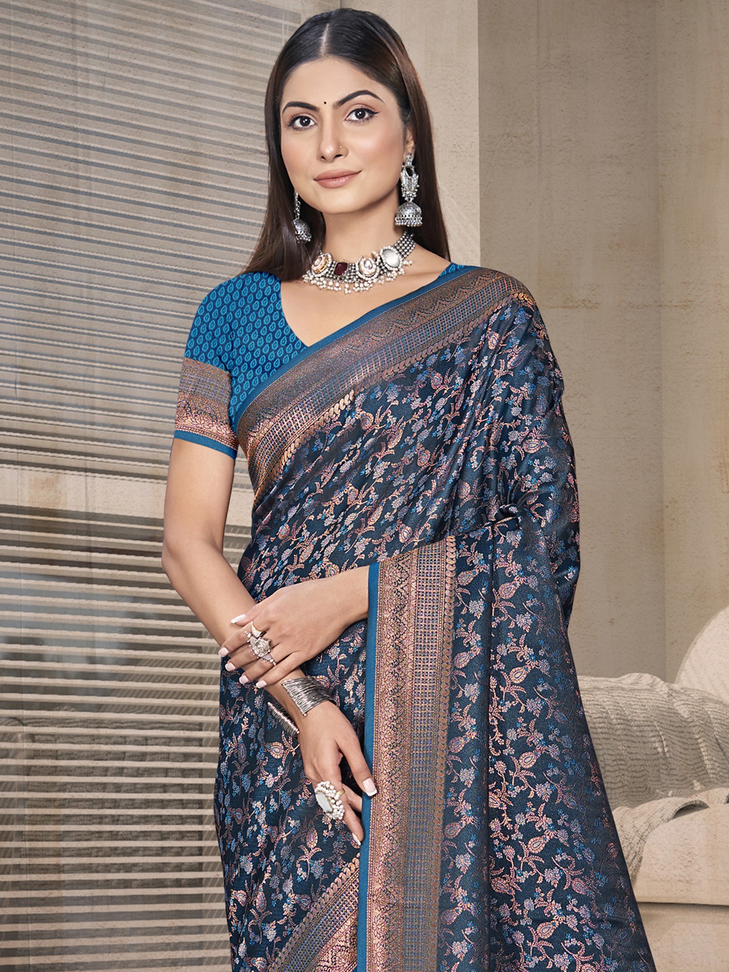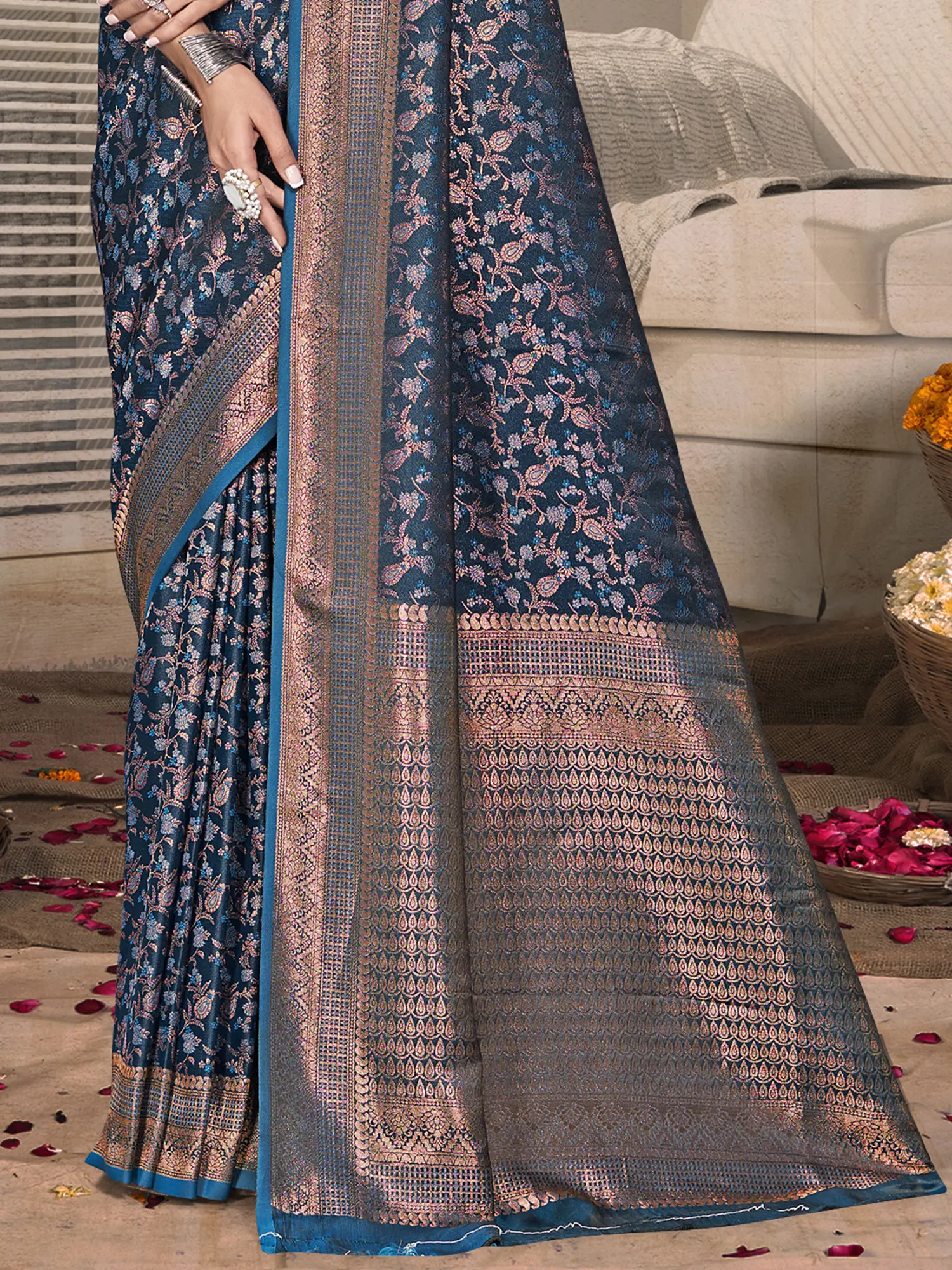 Dual Shade Pure Silk Saree with Golden Zari Woven Peacock-Elephant Motif Broad Border and Bold Aamra Motif on Pallu