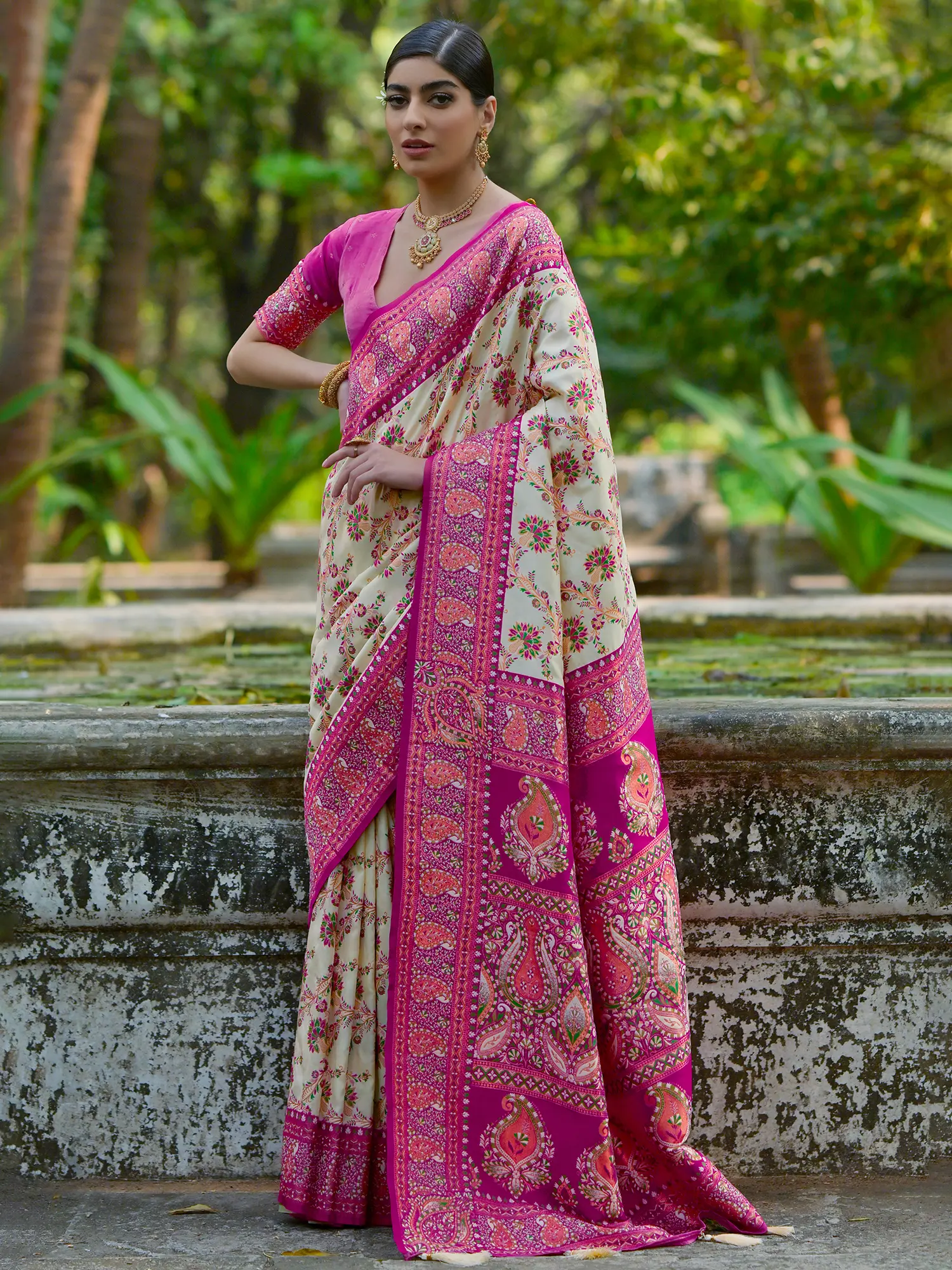 This saree is crafted from high-quality pashmina silk, known for its exceptional softness, smoothness, and luxurious drape. The intricate thread work woven throughout the saree adds a touch of opulence and sophistication, showcasing the skill and artistry of the artisans who created it. The pallu is a stunning example of this meticulous craftsmanship. The vibrant magenta color pops against the ivory background, while the woven patterns add depth and richness. The attention to detail is evident in every aspect of this saree, from the delicate floral patterns to the perfectly finished edges. The richness of the material and the intricate work are a testament to the quality you can expect.