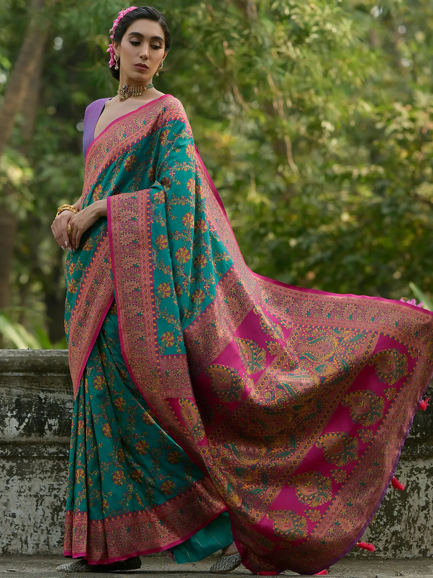 This stunning pashmina silk saree is a true masterpiece of craftsmanship. The ivory base is adorned with a delicate floral pattern, creating a beautiful and timeless look. The vibrant magenta pallu (border) features intricate woven work, adding a touch of elegance and sophistication. The contrast between the soft ivory and the bold magenta creates a striking visual appeal that is both captivating and refined. This saree is perfect for weddings, special occasions, or any event where you want to make a statement. Its luxurious feel and intricate detailing will leave you feeling confident and beautiful. The saree drapes gracefully, highlighting the wearer’s figure while maintaining a sense of effortless elegance.