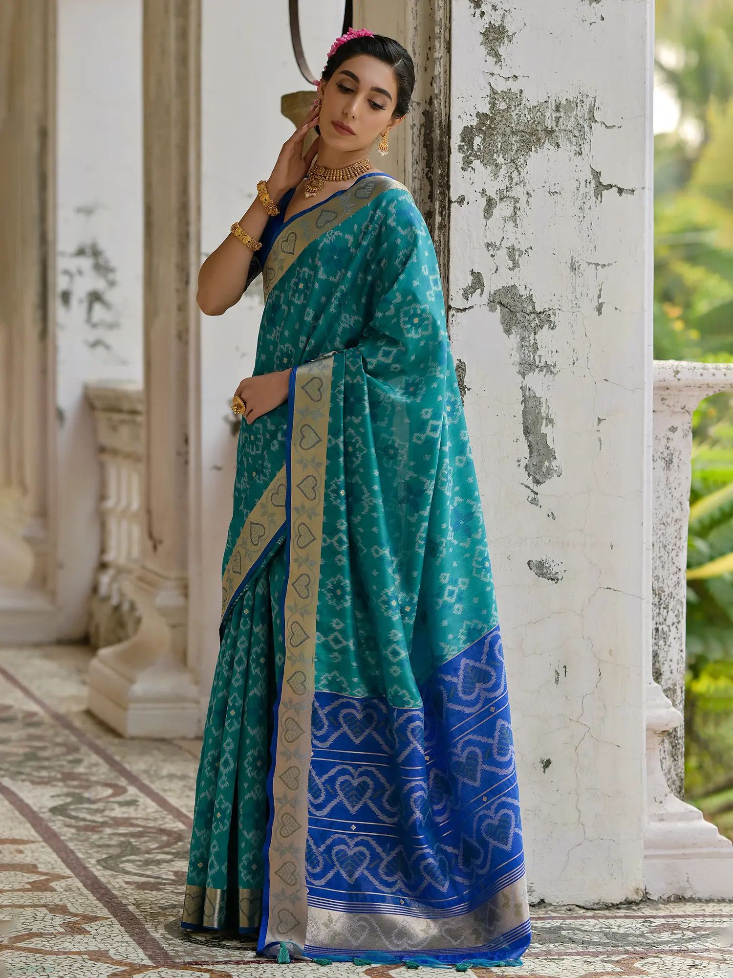 Jade-Lime Chanderi Saree with Hand Woven Flowers and Golden Border