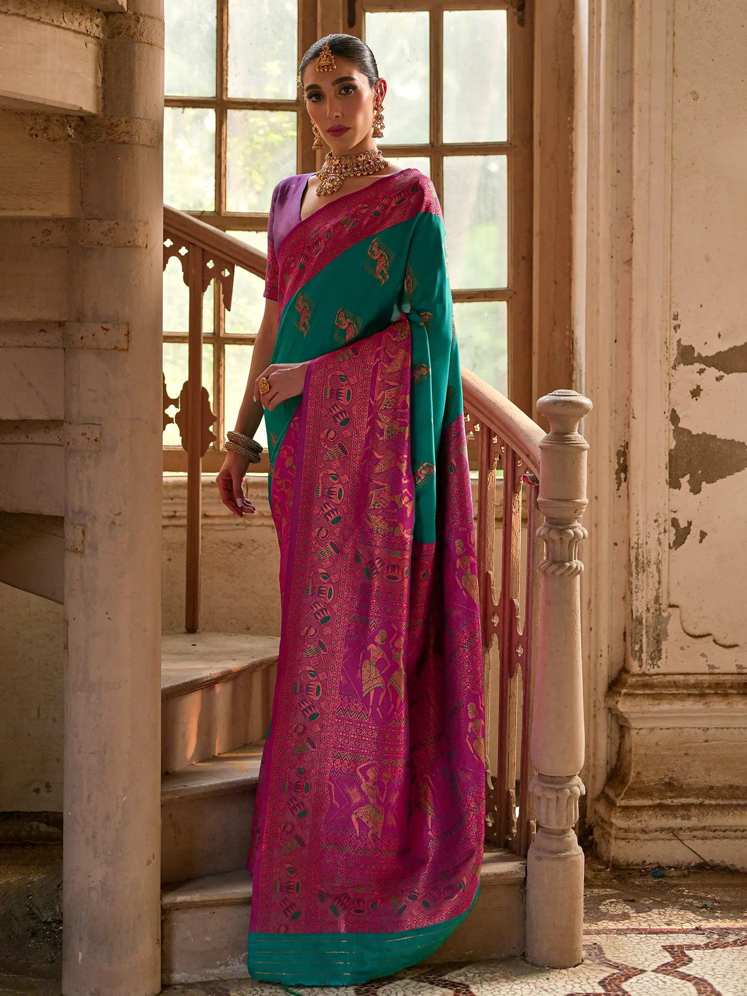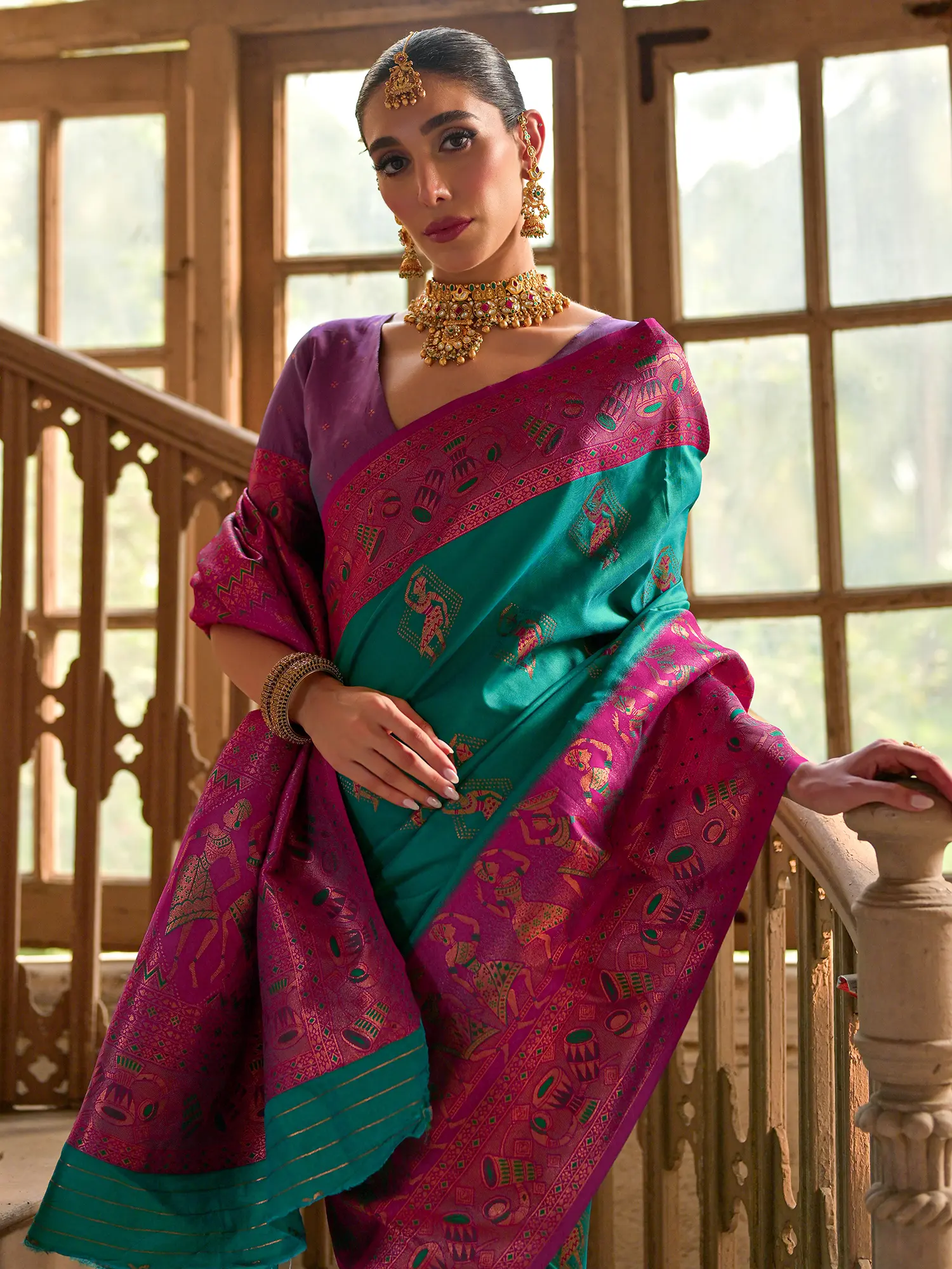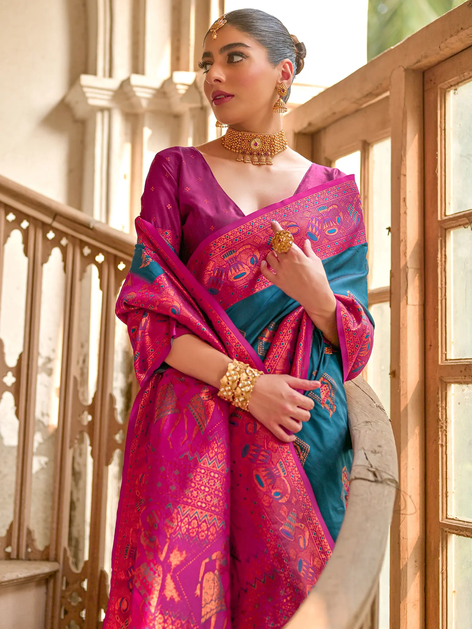 Dual Shade Pure Silk Saree with Golden Zari Woven Peacock-Elephant Motif Broad Border and Bold Aamra Motif on Pallu